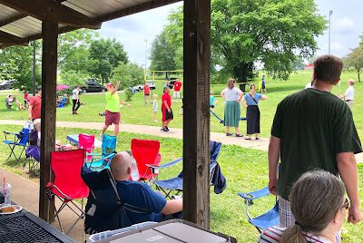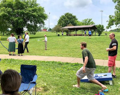 The sister missionaries (upper right) also enjoying the BBQ potluck and festivities.