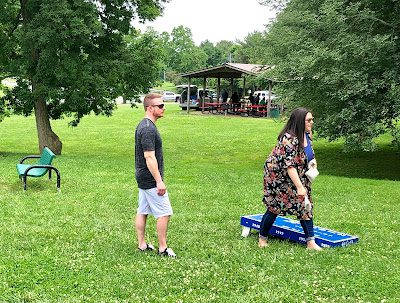 Brandi and Janick Stephenson watching the guys play corn-hole.