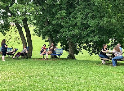 Amy Clayburn, the Parkers, and the Linkers grabbing some shade.