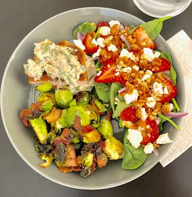 However, eating out was always a little disappointing when compared to Sean's gourmet cooking like this pimento cheese stuffed pork loin with fried artichoke hearts & bacon and strawberry spinach salad!