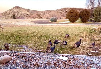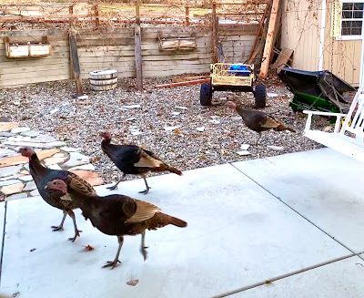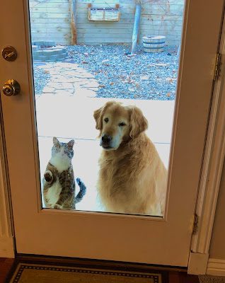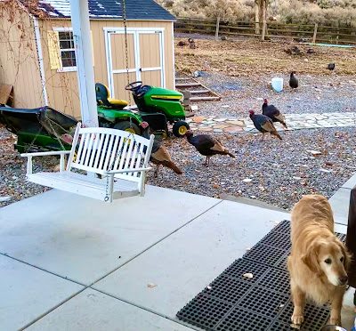 Their cat Lucky and dog Tango waiting to come in the house and get away from the turkeys.