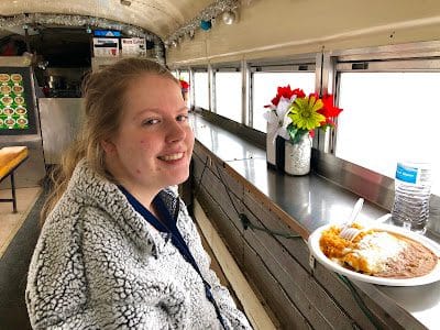 that served delicious cheap tacos (and thankfully had space heaters which we are literally sitting on top of).