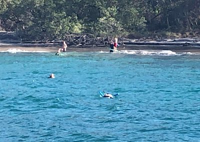 before getting some good snorkeling in herself. The snorkeling definitely was not the highlight of the cruise! Matt found out, after wading some distance from the boat, that his mask was missing a lens, there wasn't any type of coral reef (just sharp rocks that cut our feet), and the water was so choppy it made us sick as we ingested more salt water than all our free drinks put together!