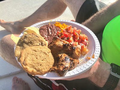 Dinner was really good and consisted of barbecue chicken, refried beans, mexican rice, pico de gallo & chips, fruit salad, and homemade chocolate chips cookies.