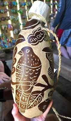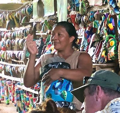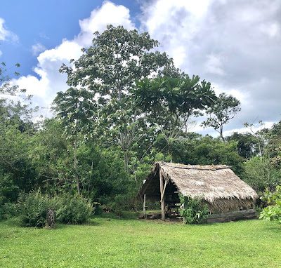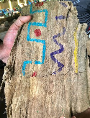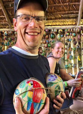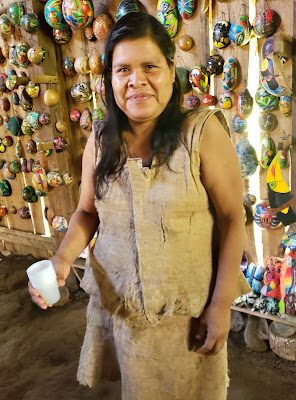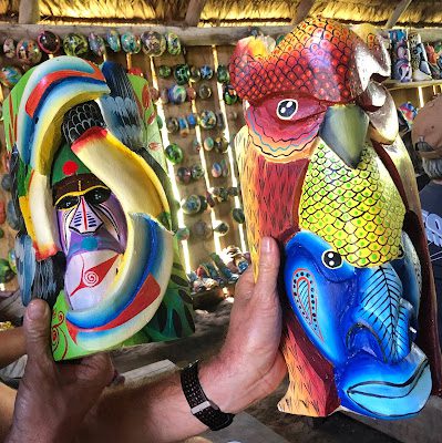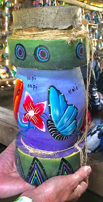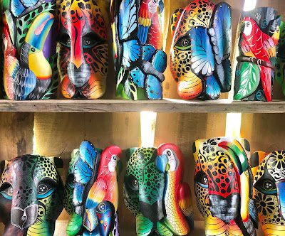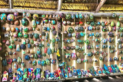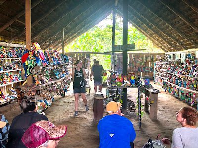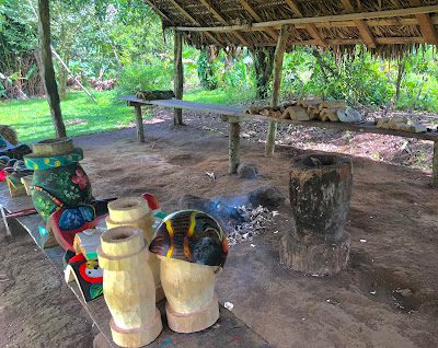 The hut where they carved, out of balsa wood (plentiful in this area and one of the lightest species of wood), statues, water bottles, bowls, and other brightly painted items...