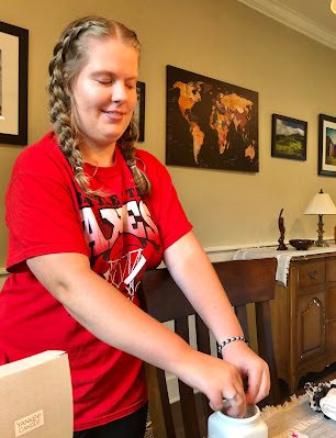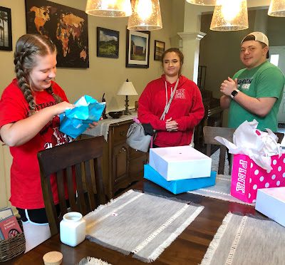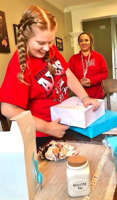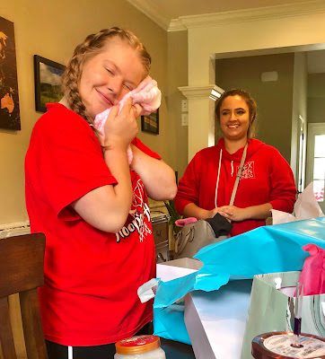 she finally had enough pain meds and zofran on board to get ready for the day, and open gifts from her good friend's Jacob and Laura.