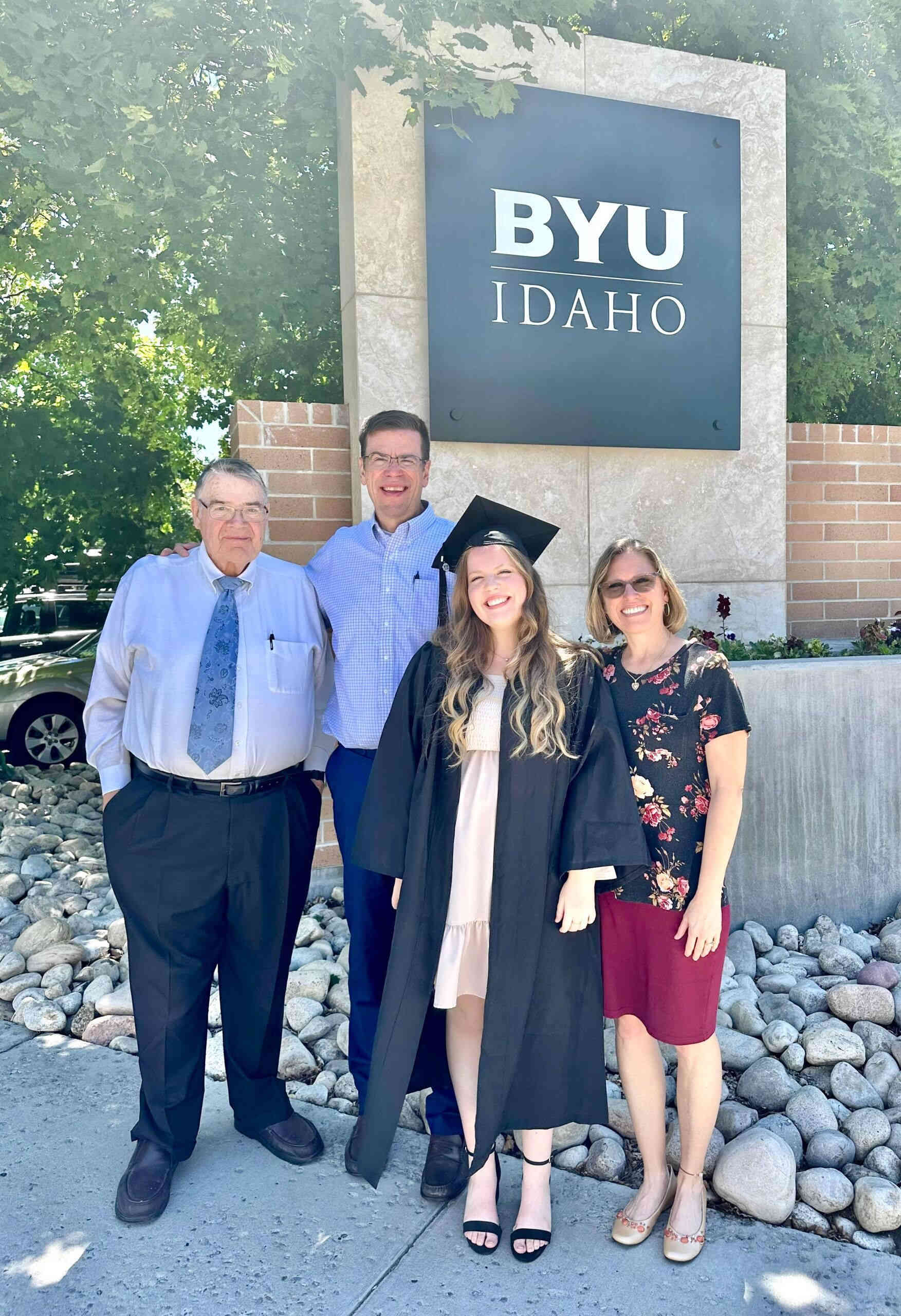 The next day, before Merinda's graduation, we ate lunch at The Hickory (one of our favorite restaurants in Rexburg). Merinda's had many cousins, on the Manwaring side, attend BYU-I with her, and these are the ones that were staying until school starts up again in the Fall. From right to left it's Grandpa Manwaring, Merinda, me, Eva, Brad, Braxton, Braxton's wife Jesselynn, Bailey and Bailey's fiancé Kaleb. It was fun to see them all again and meet their significant others.