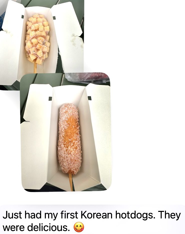 Brad's text to Merinda...he was so excited to try Korean corn dogs for the first time, and share it with Merinda, who used to sell them via Bun On the Run.
