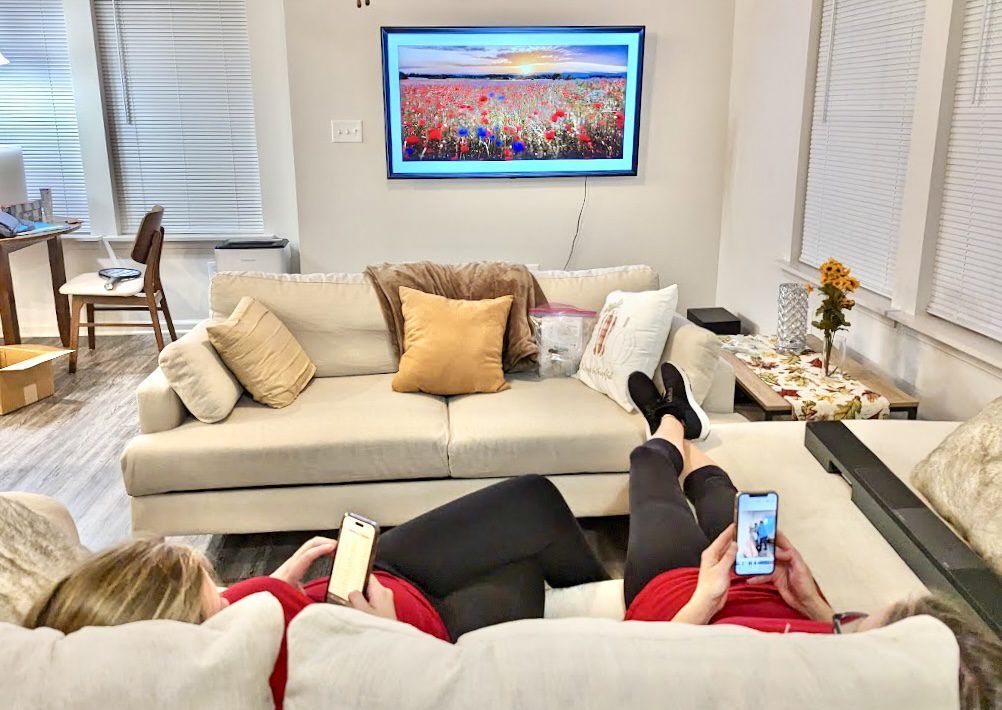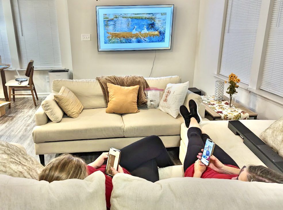 Aubrey and I enjoyed the fruits of their labors (in our un-planned twinning outfits😆) by admiring the television in picture mode while sharing pictures on our phones.