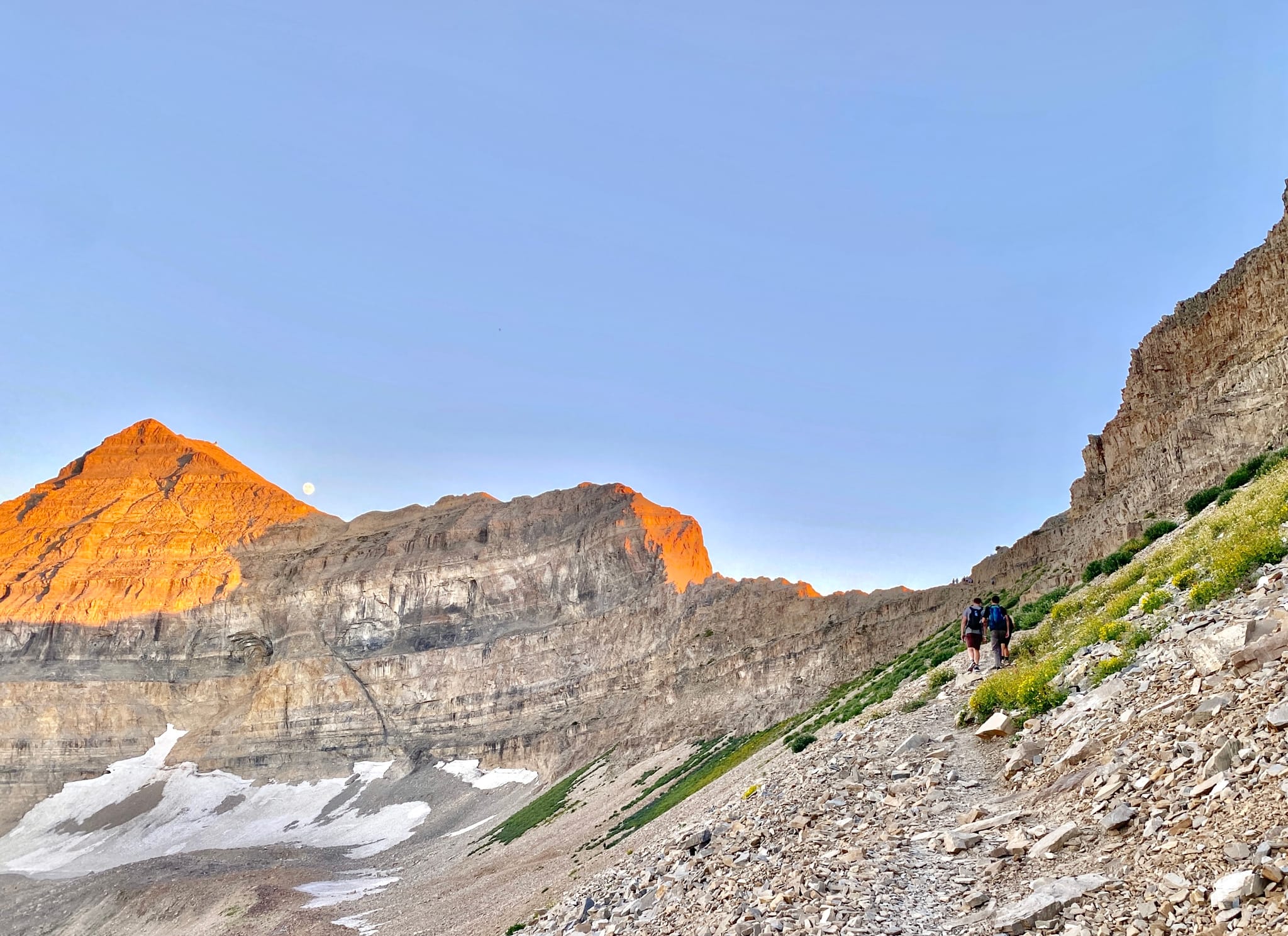 After my time in Vegas and enjoying precious moments with my new grandson, Gus, I joined Matt and his family for a hike to the top of Mount Timpanogos. I've wanted to summit Timp again ever since my first climb as a teenager—it was a life-changing experience. So, when Matt suggested we hike it during my visit to Utah, I jumped at the chance. This time, however, we had to be more strategic, given the crowds on the trail. Even early in the morning, it can get busy, so Matt proposed a late afternoon start. We left at 4:00pm, aiming to reach the saddle by sunset for the breathtaking views. The final stretch to the summit would be in the dark, but we figured the valley lights would make the summit even more spectacular. Though I was a bit concerned about the descent in complete darkness, I had my headlamp so I just focused on the trail right in front of me.