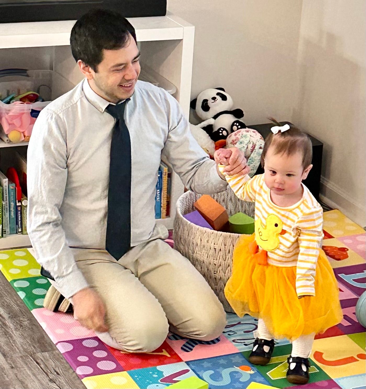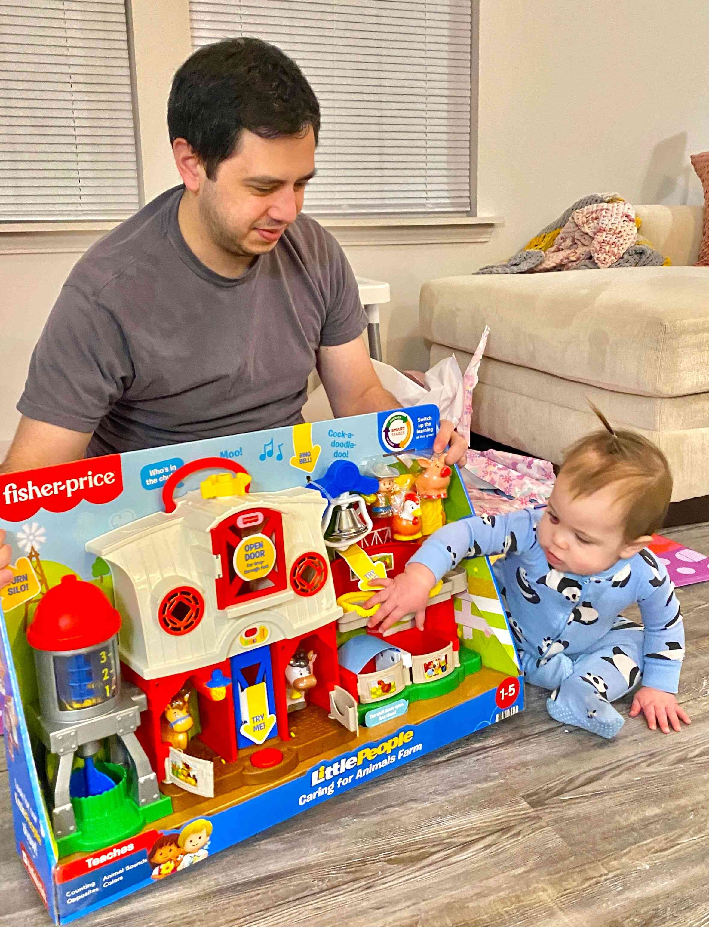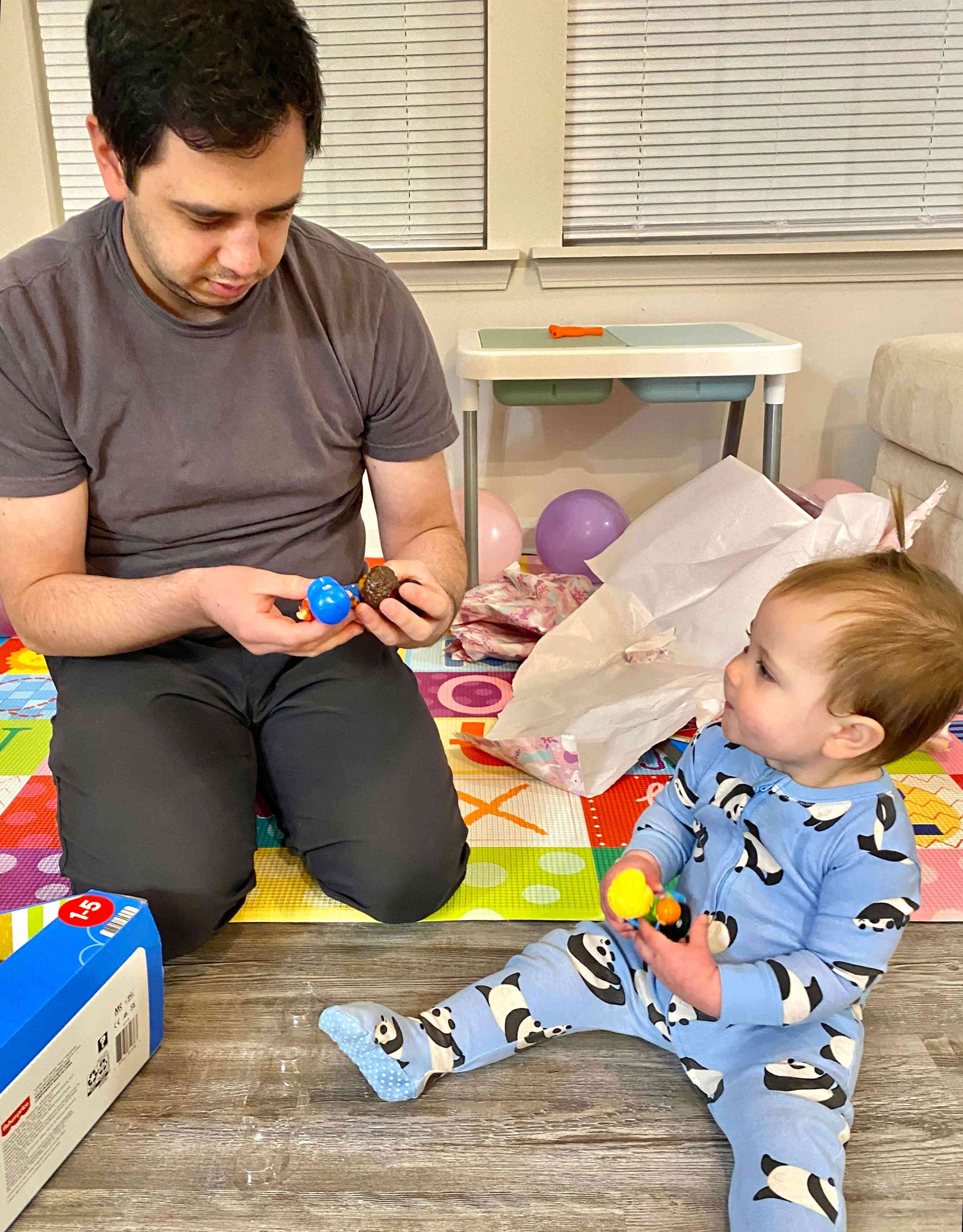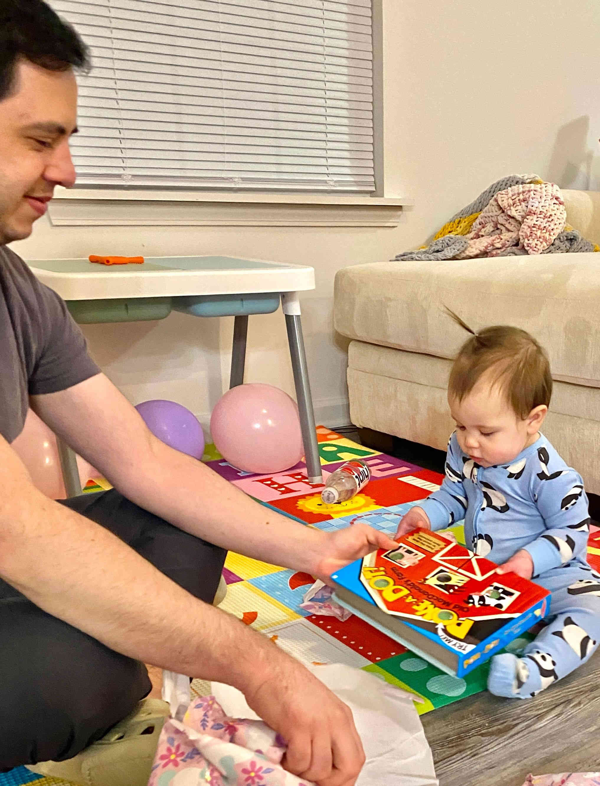 Raul helping her open gifts from her aunt Brittney which included two fun-filled interactive books!