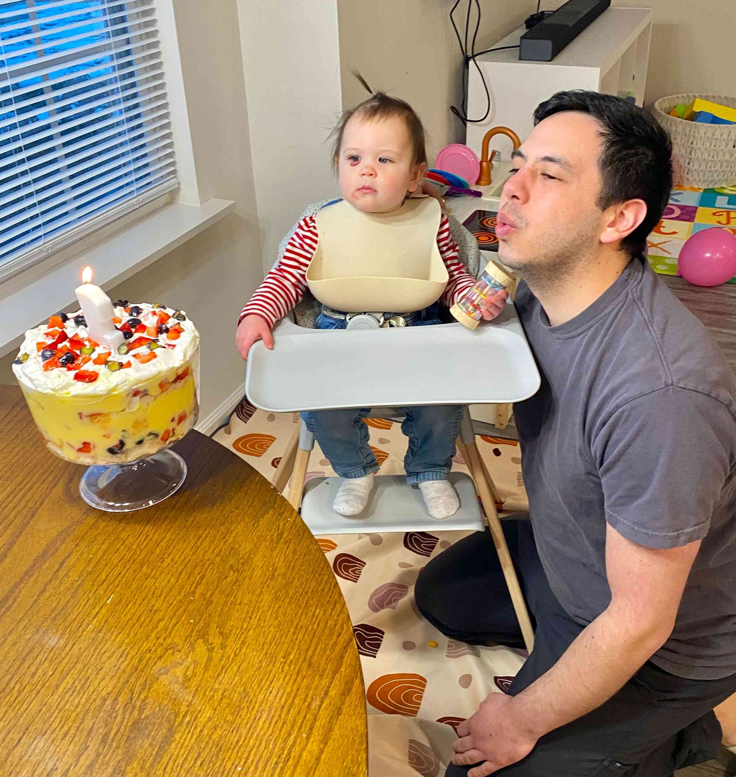 Once Daddy was off of work we ate dinner together, and got ready to sing and blow out candles. As you can see, Claire was not really in the mood for any of it, not even with her emotional support toy she held in her hand.