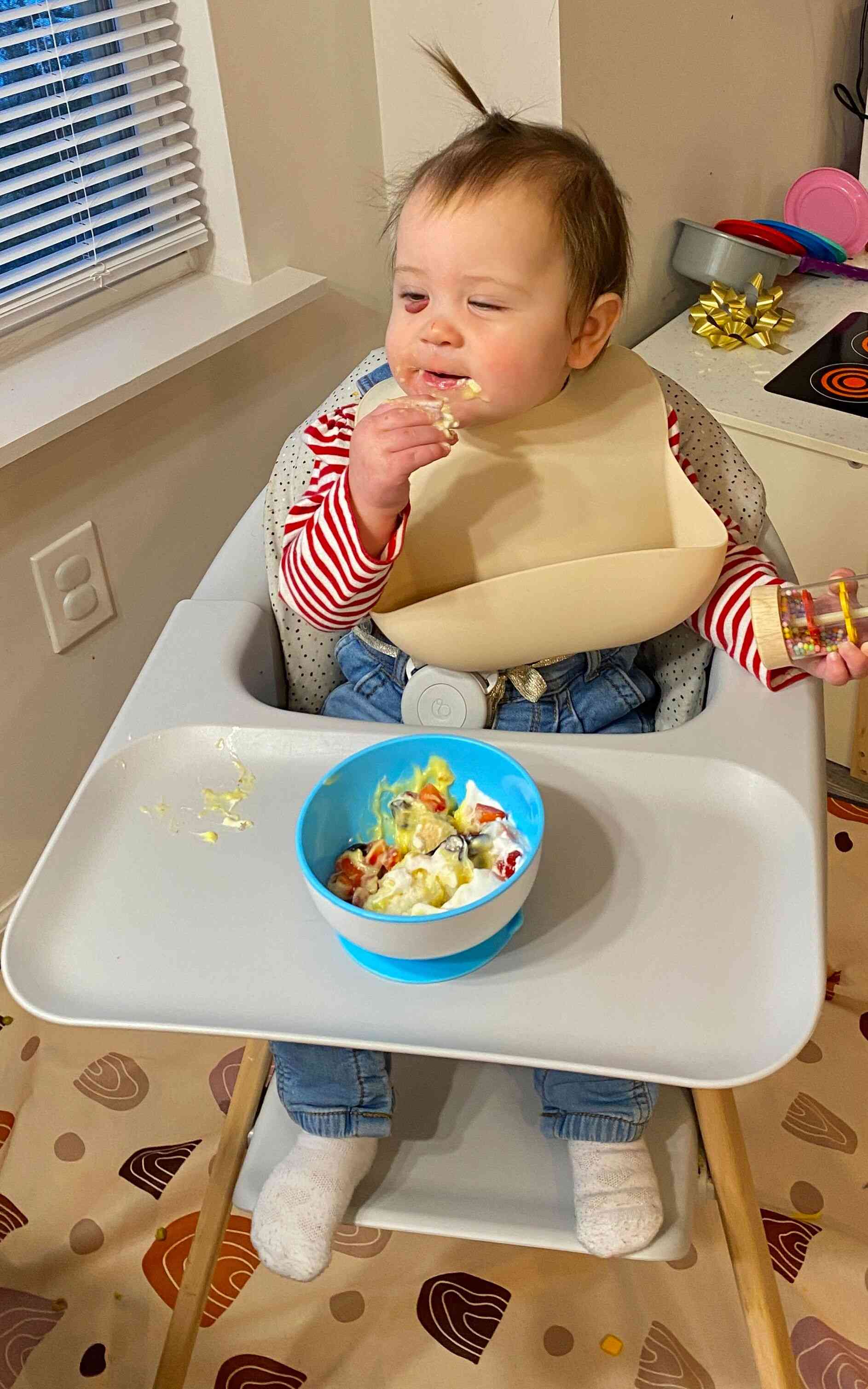 Luckily, she did like eating her angel food cake (with her emotional support toy still in hand) with pudding and berries!