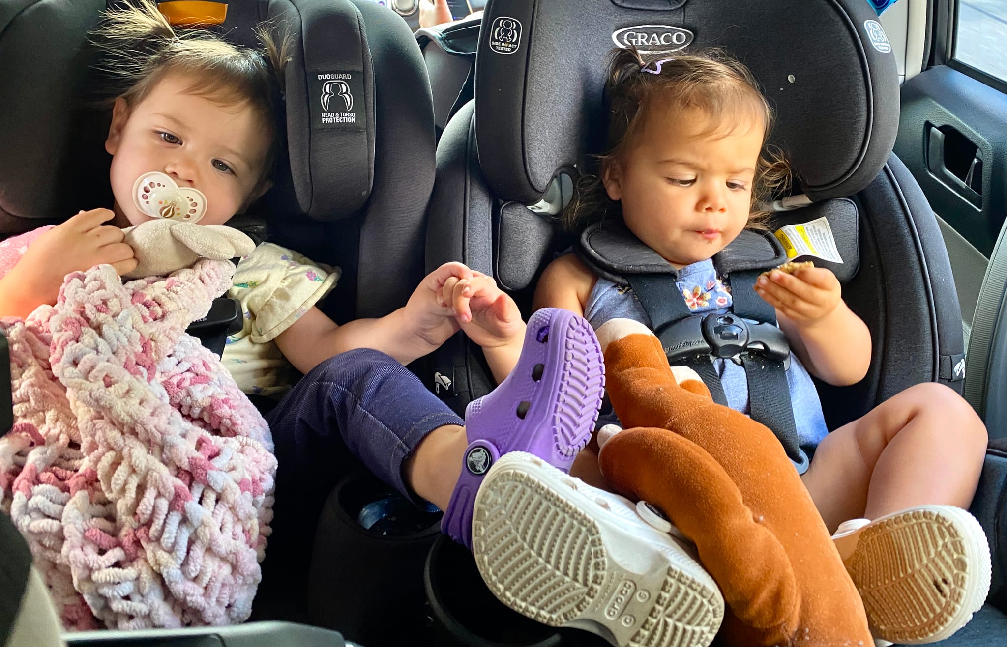 Because of our many day trips, the girls spent considerable time in their car seats. At first one or the other would cry (Claire trying to cover her ears while Camila is crying in the above pics)