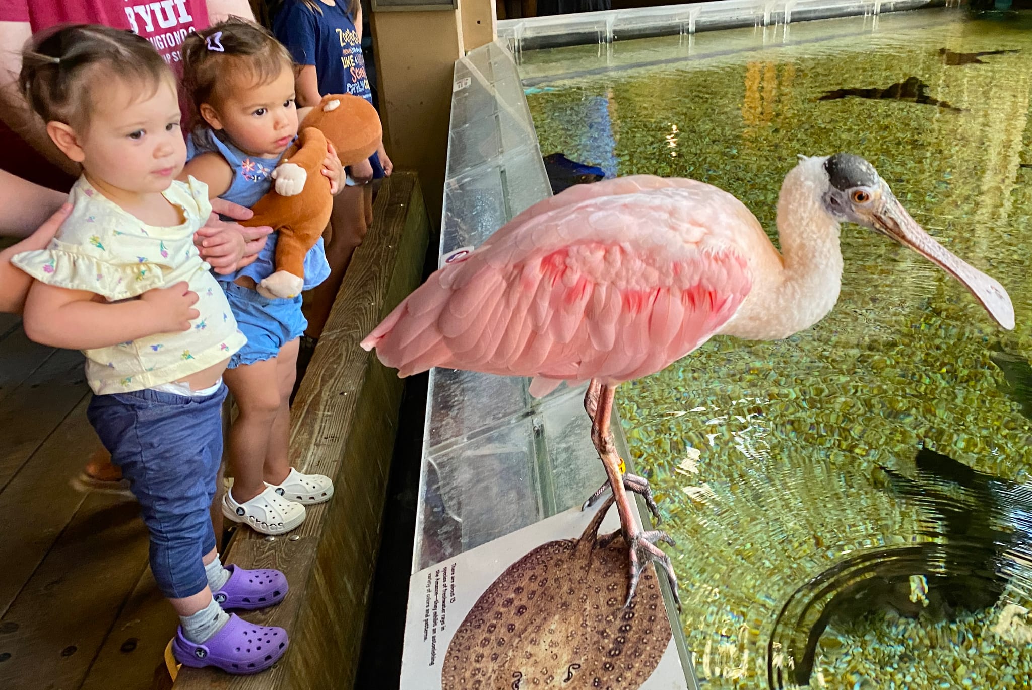 The zoo was a pretty awesome, even though several animal areas were closed for rentovation. Above the girls are admiring a pink spoonbill sitting atop a huge fish tank.