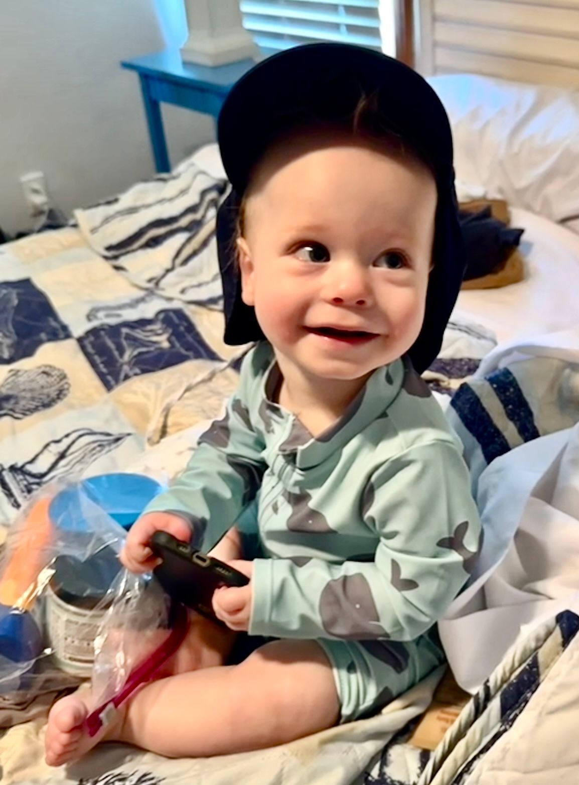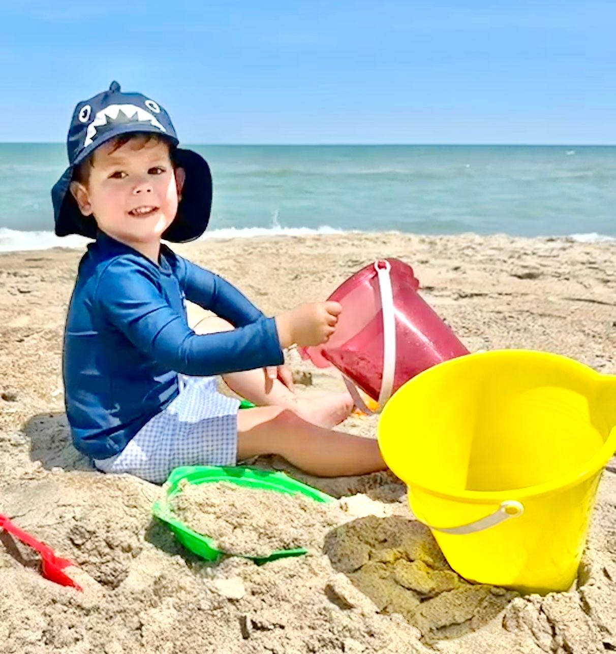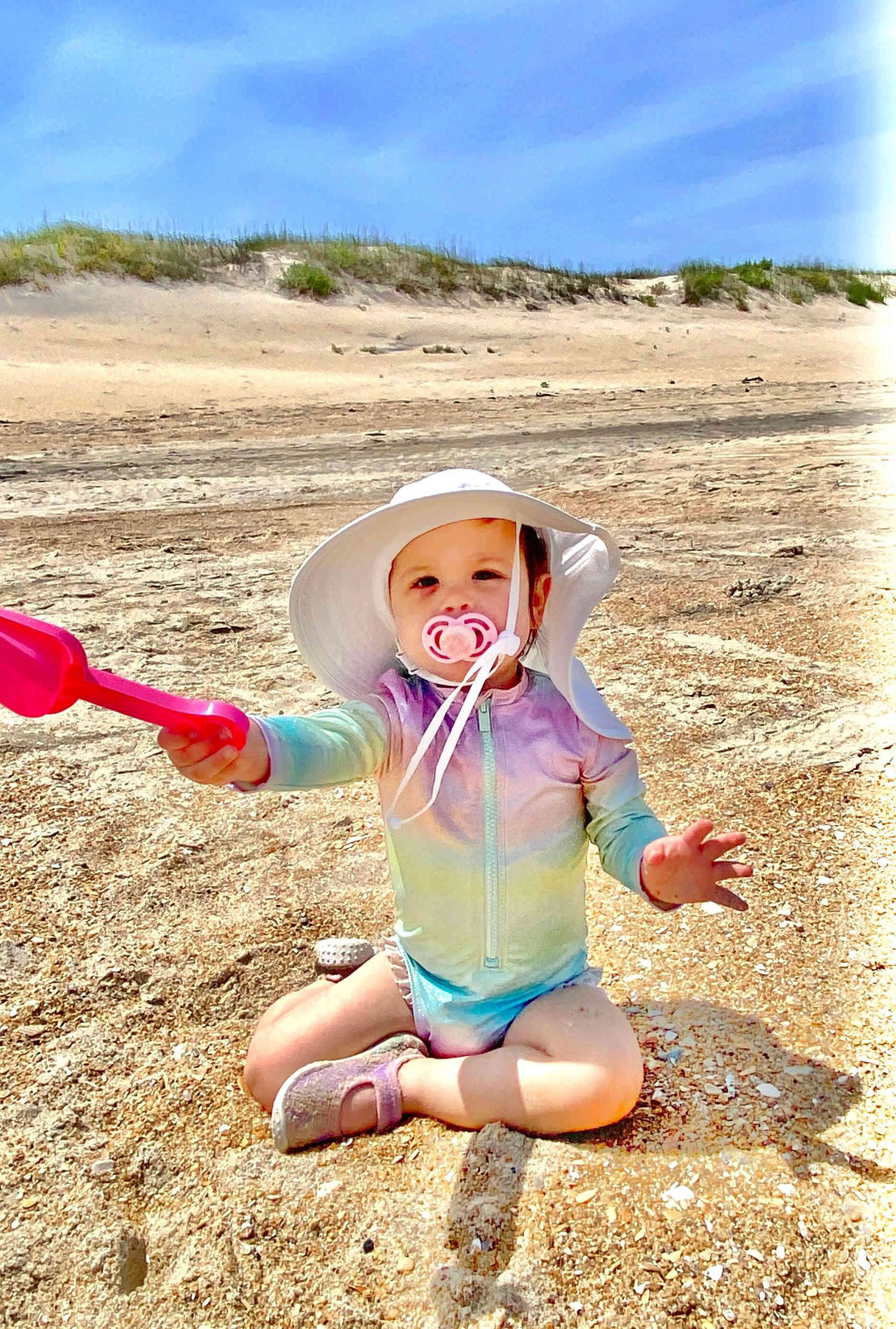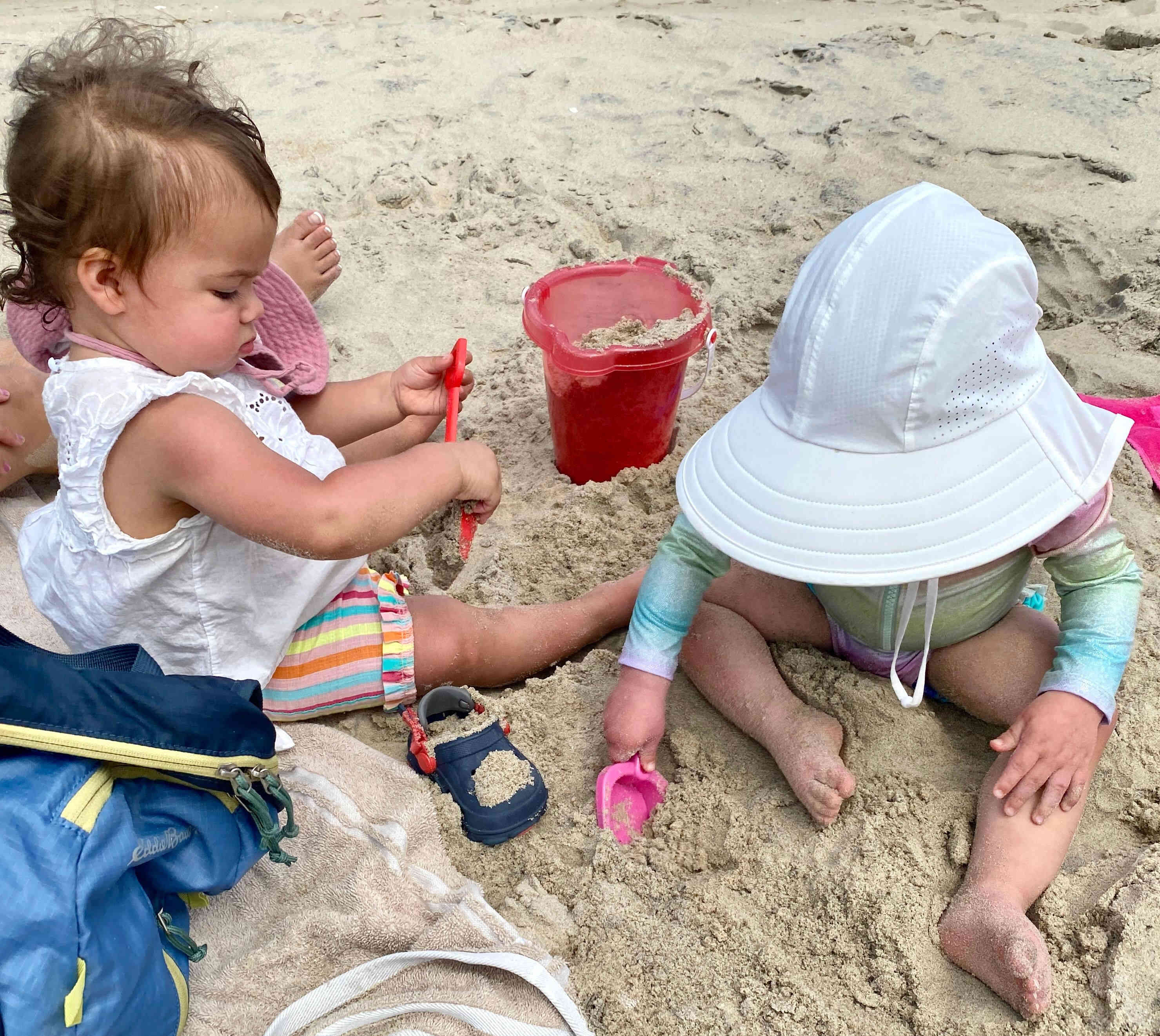 the other kids followed! Gus in his swimsuit and hat! Unfortunately, rain was forecasted for the entire week and Sunday was supposed to be the only sunny day, so we decided we wouldn't swim but get our swimsuits on anyway, let the kids play in the sand, and enjoy the one day of sun on the beach while we had it!