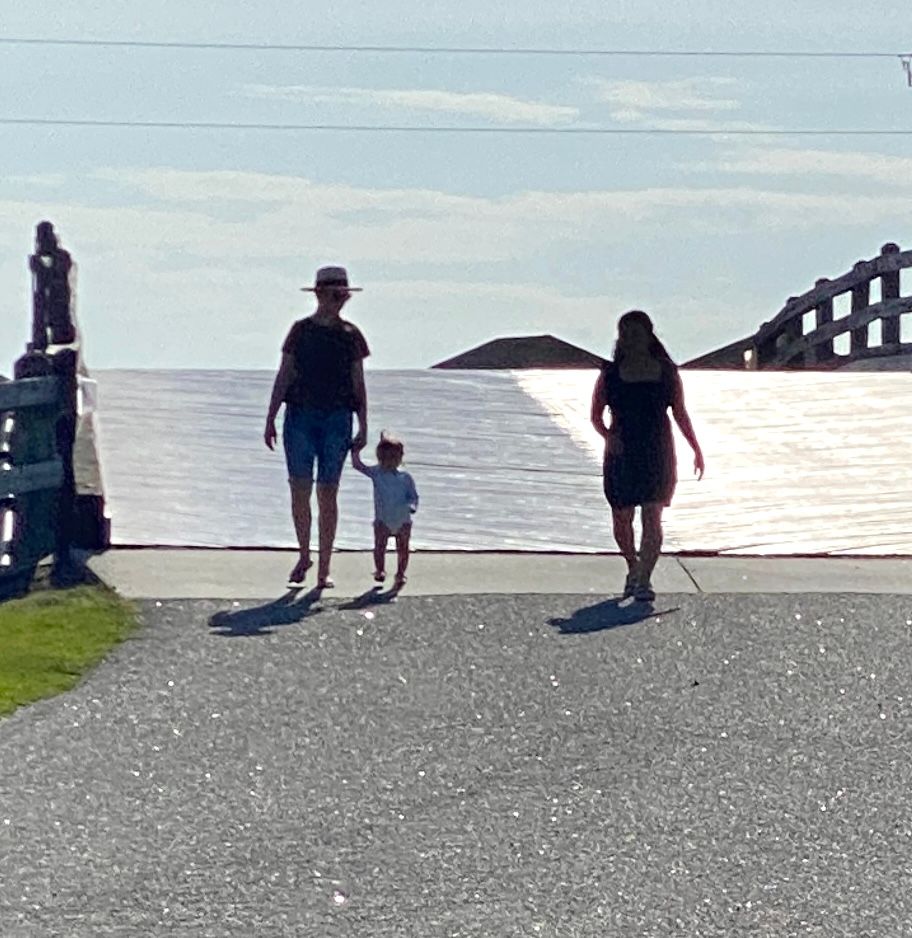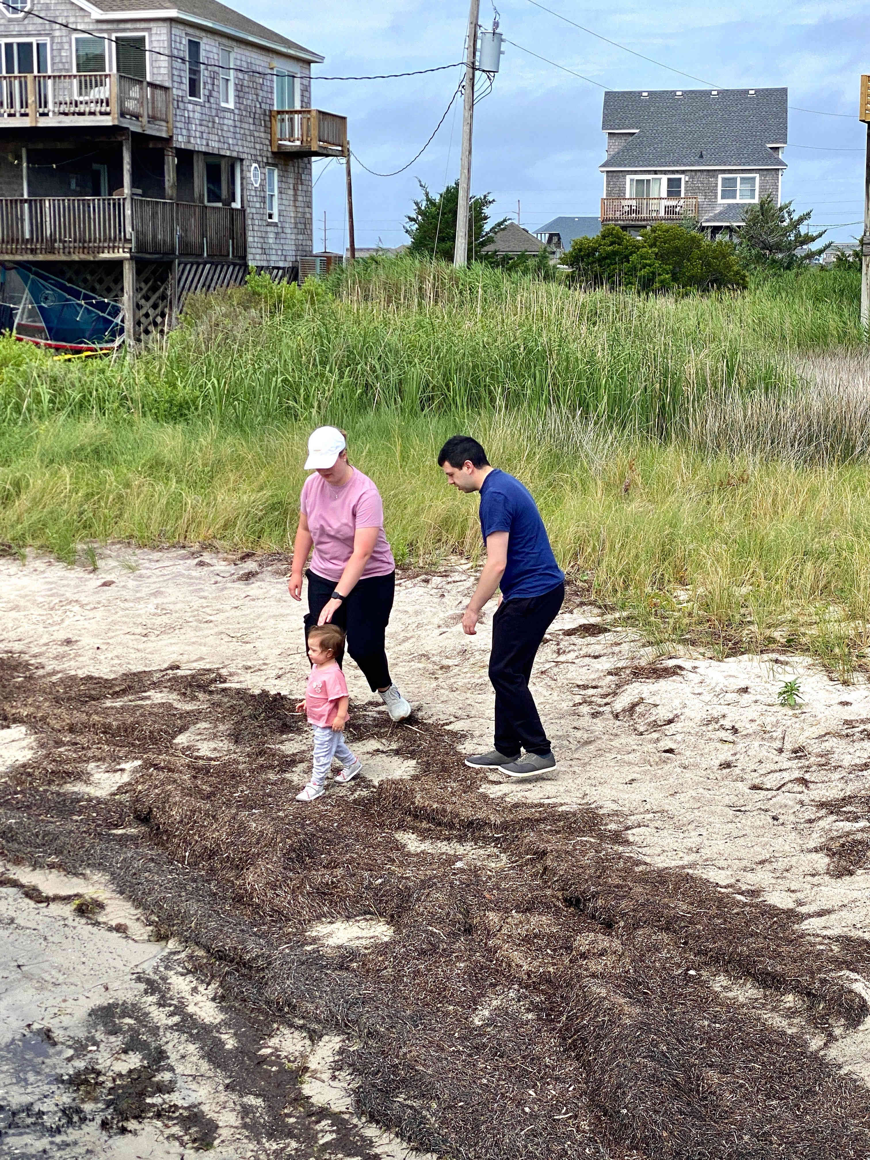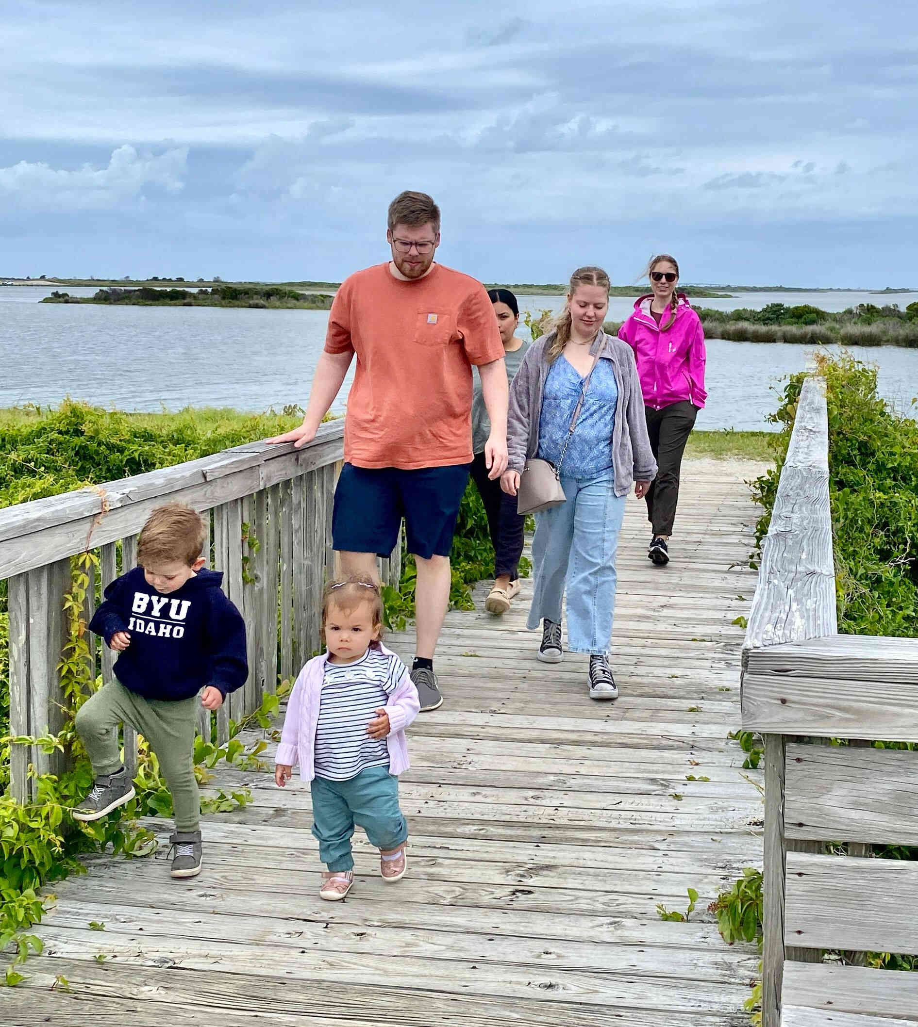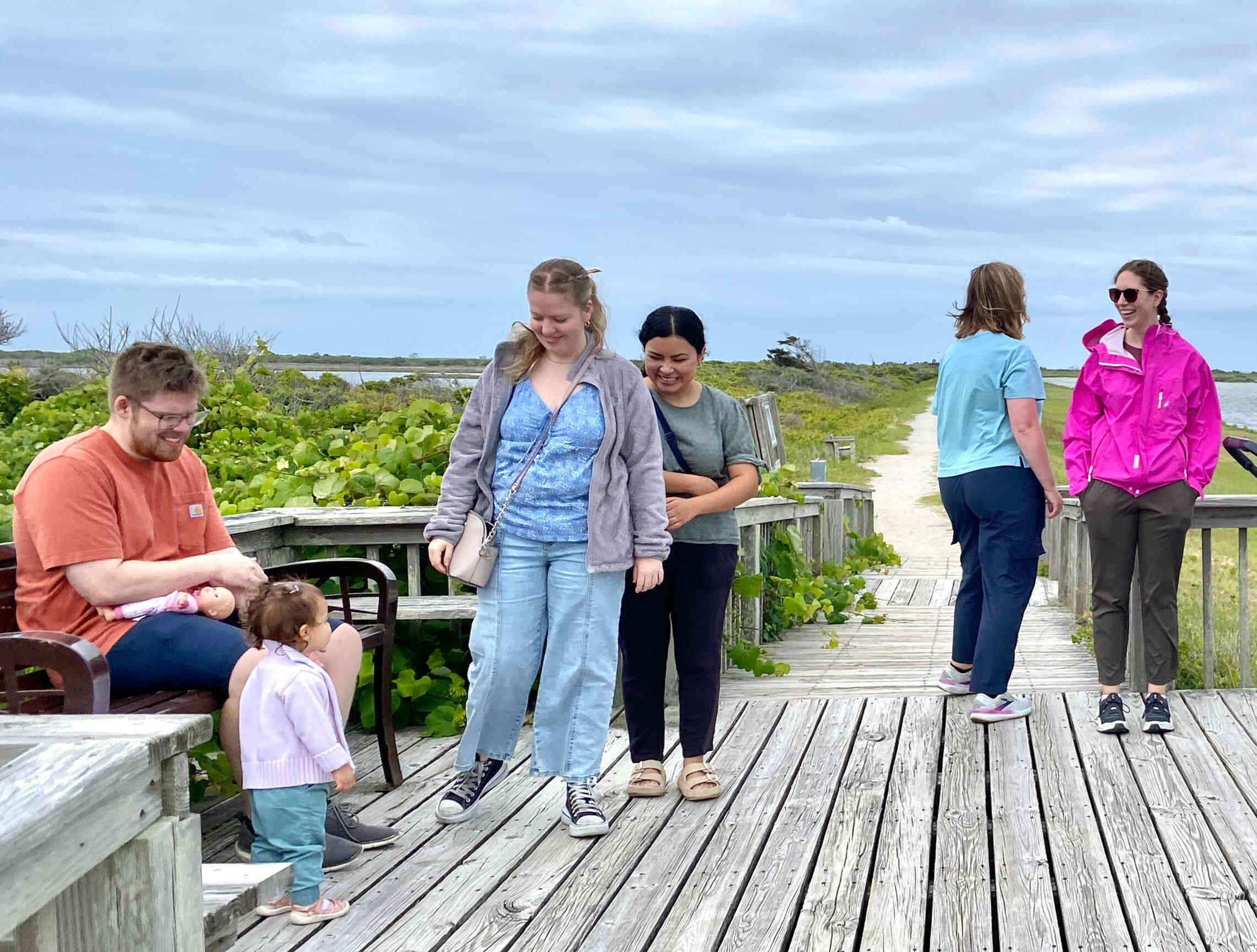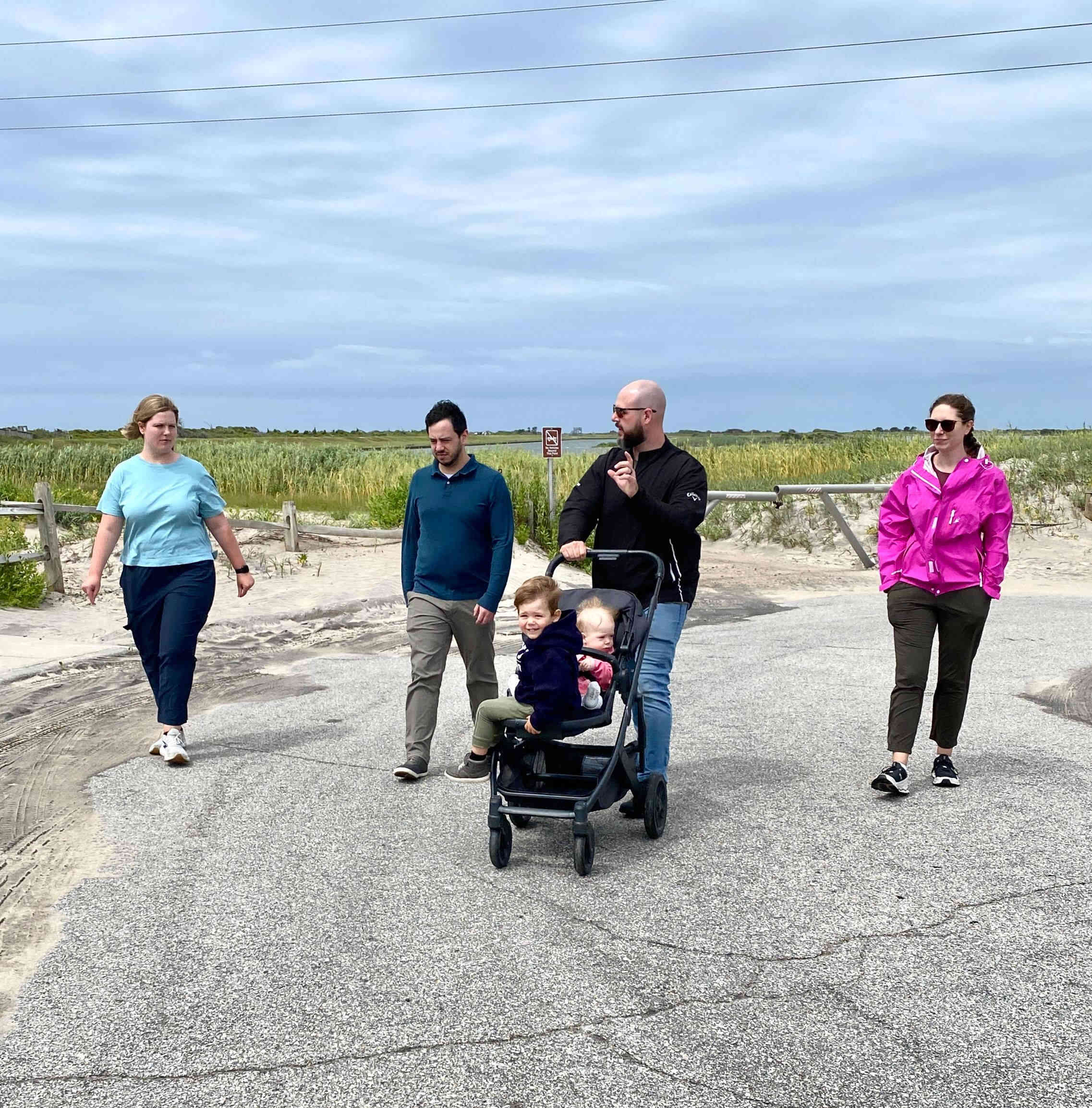 Sean & Finn, and Aubrey, Raul & Claire taking a walk to the dock and sound-side beach for a little fresh air.