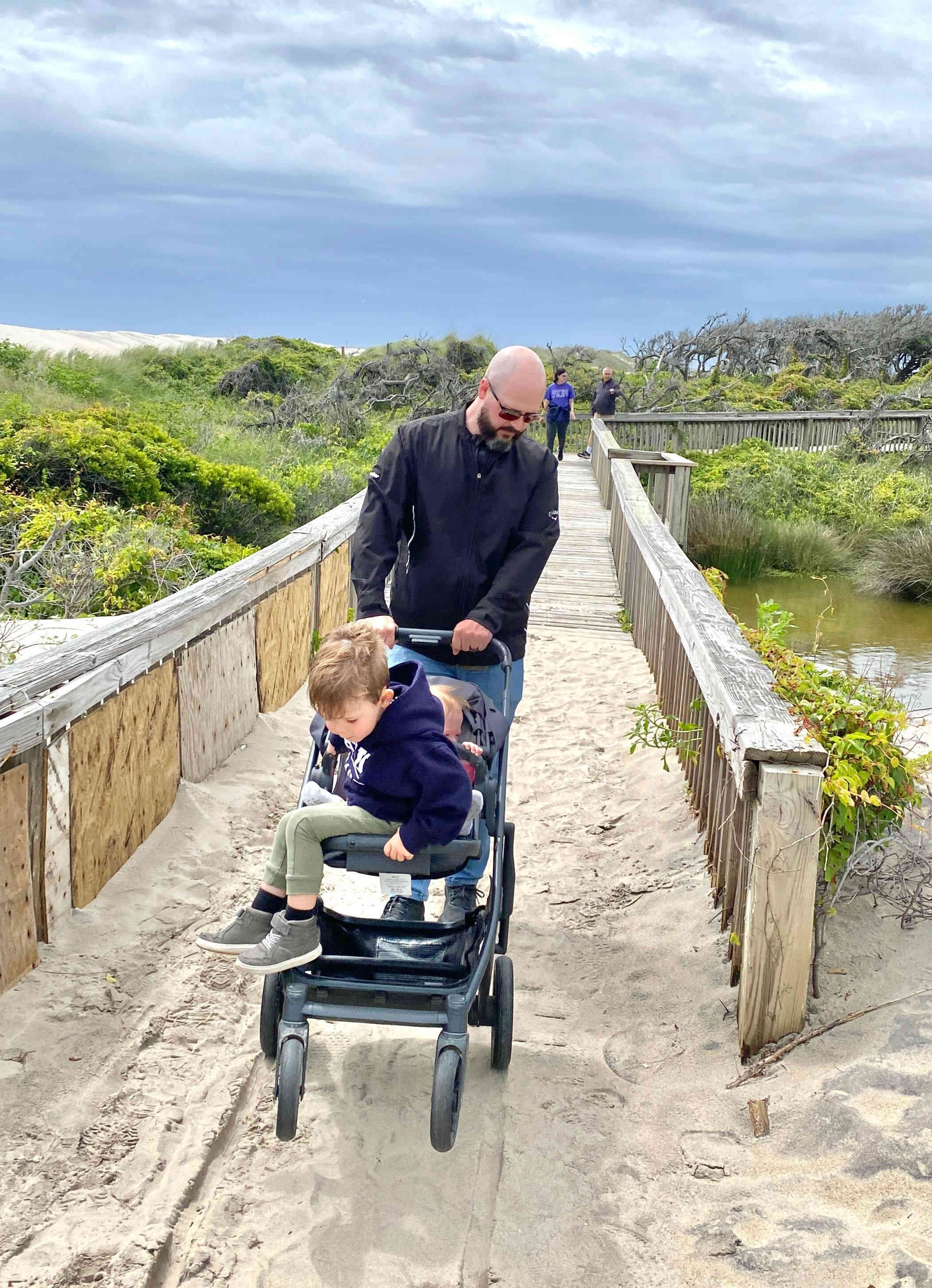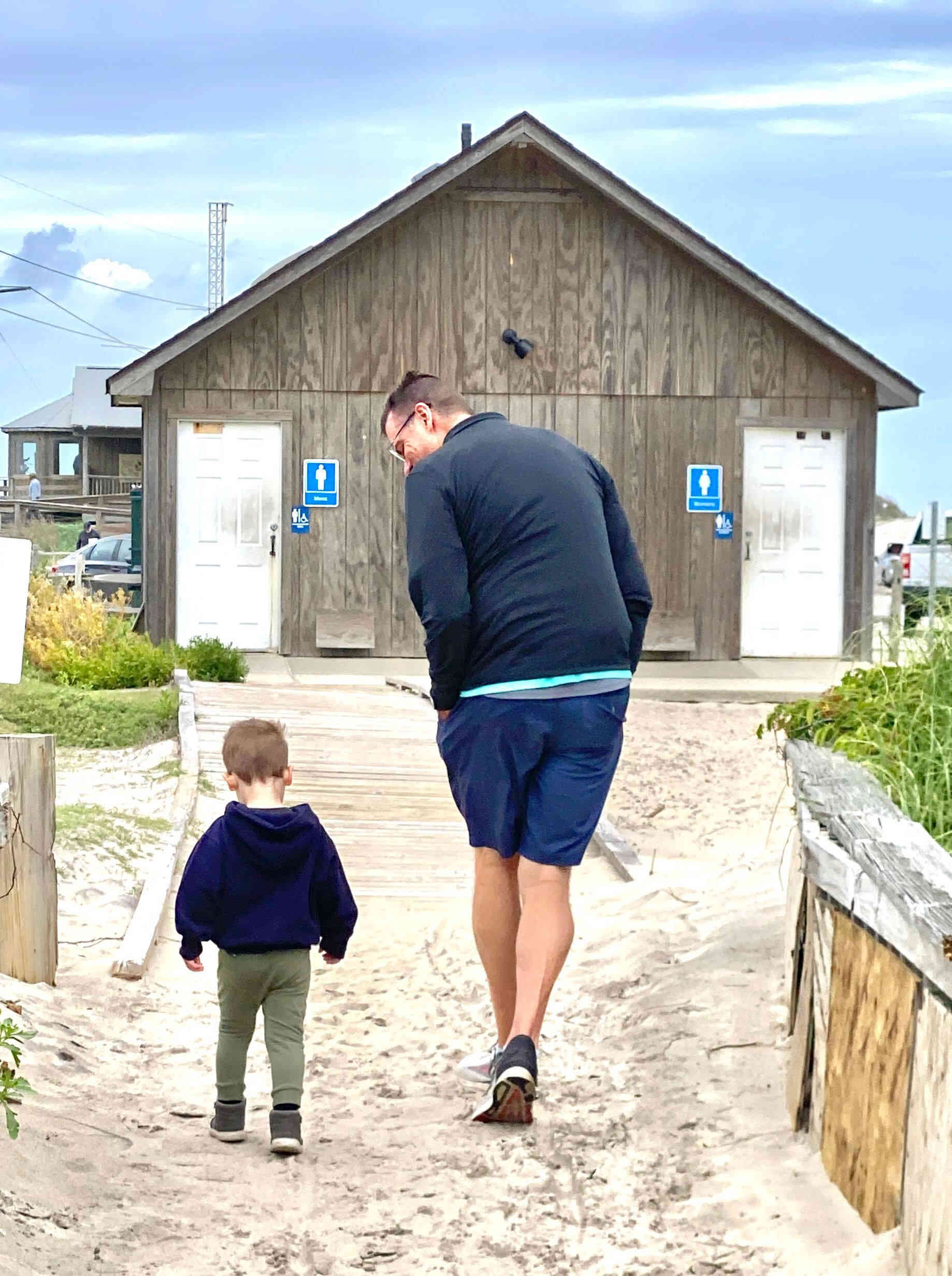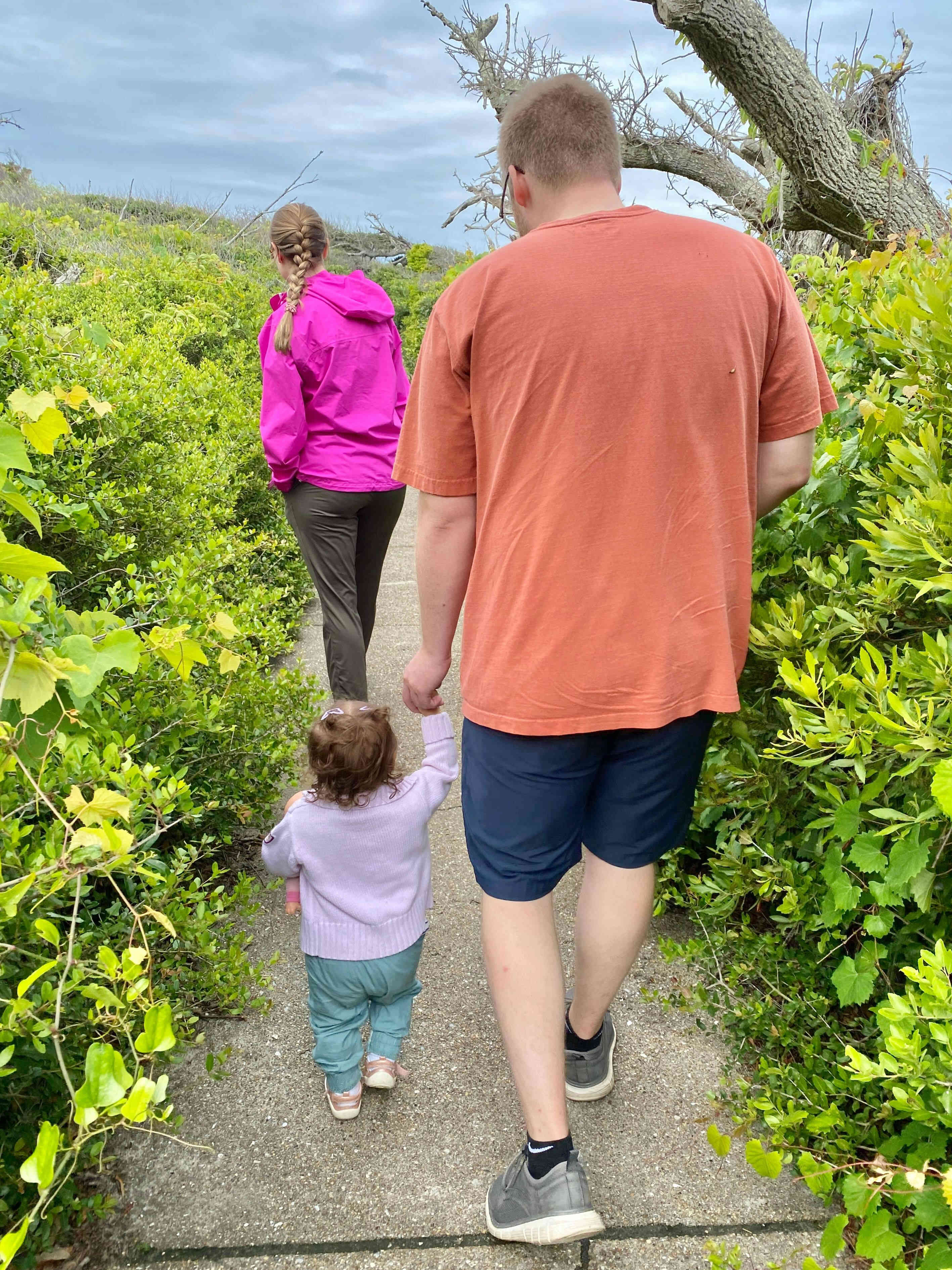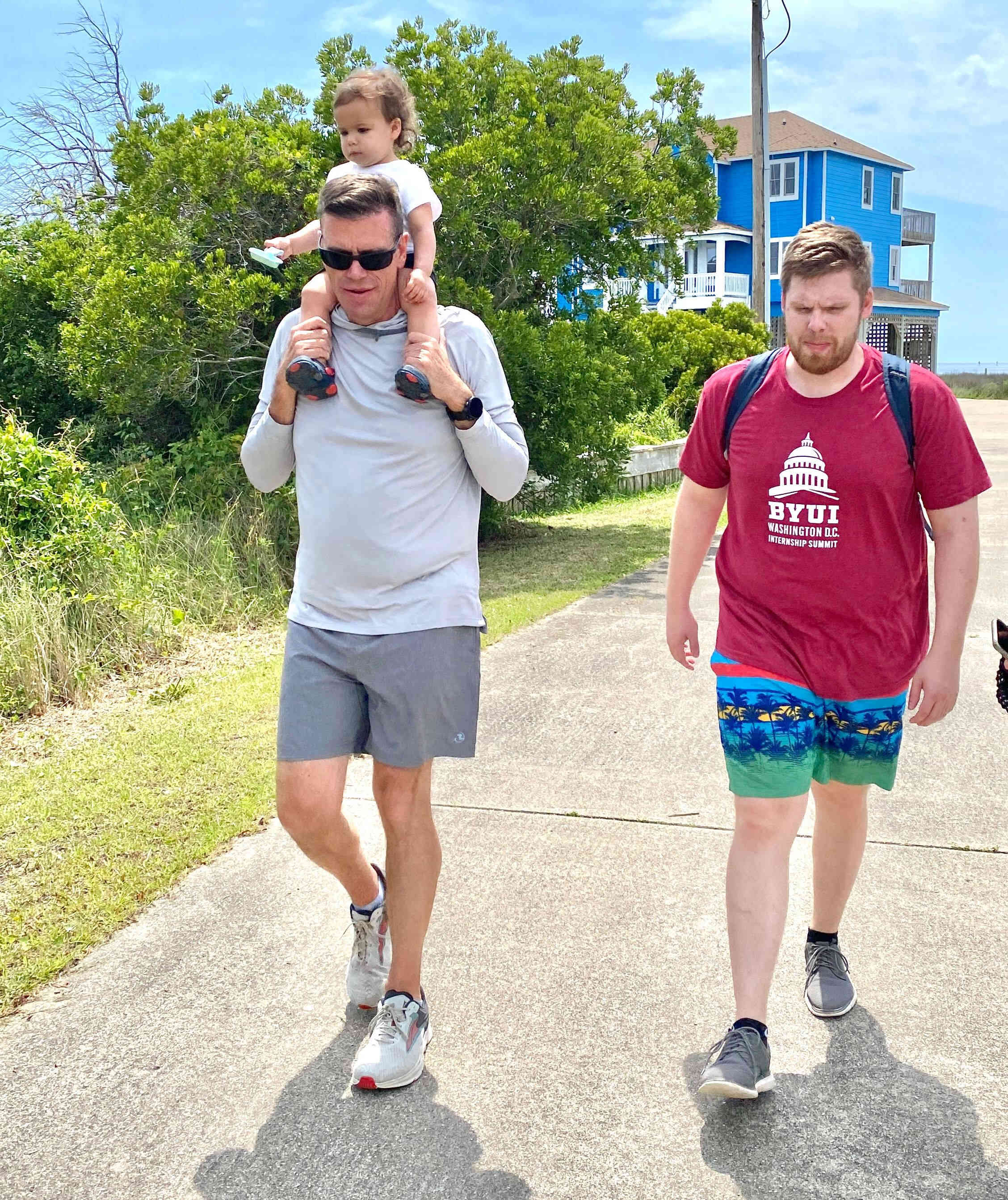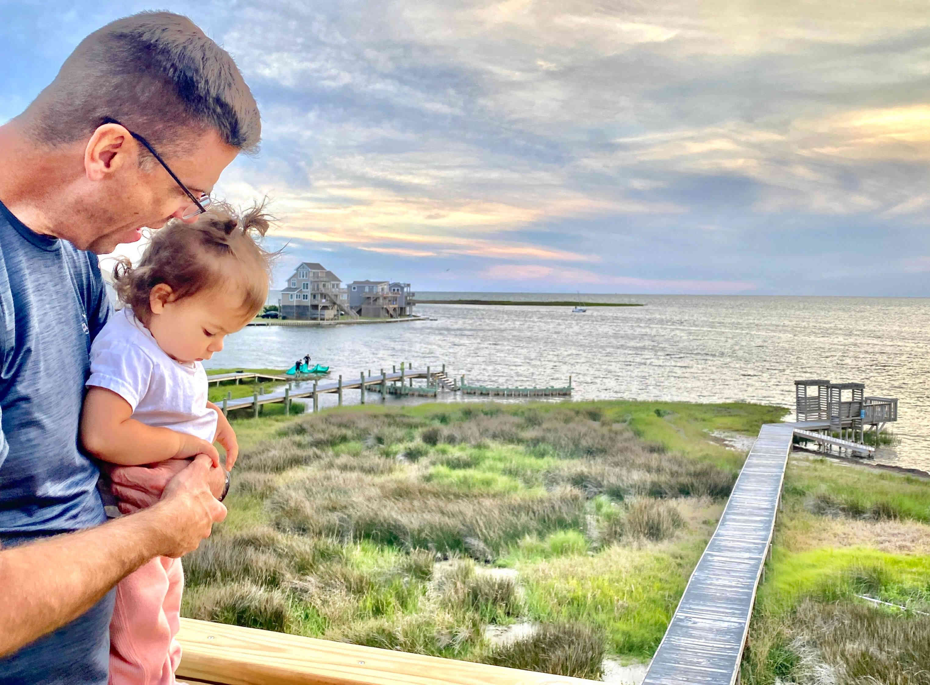 Sean & Finn, and Aubrey, Raul & Claire taking a walk to the dock and sound-side beach for a little fresh air.