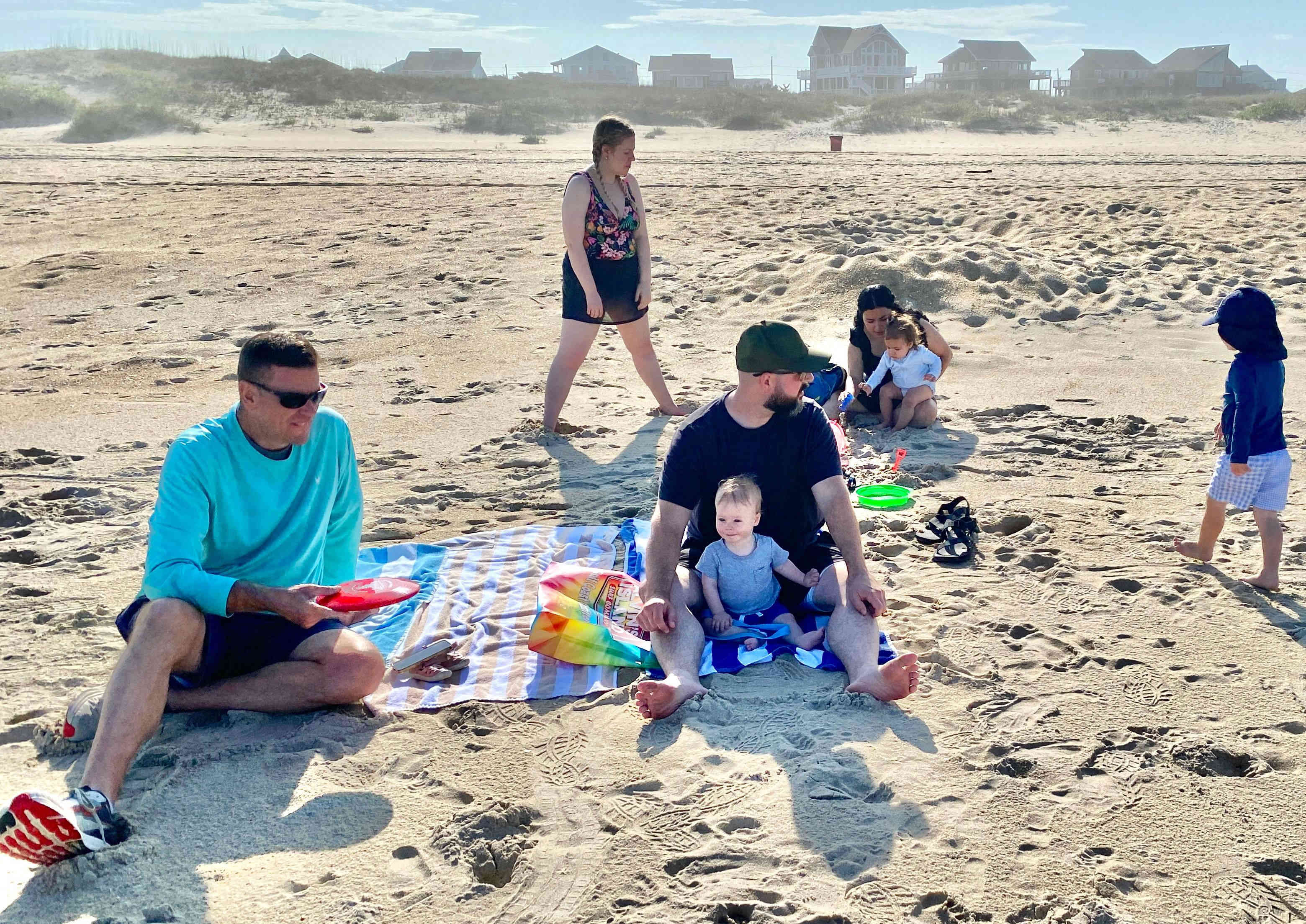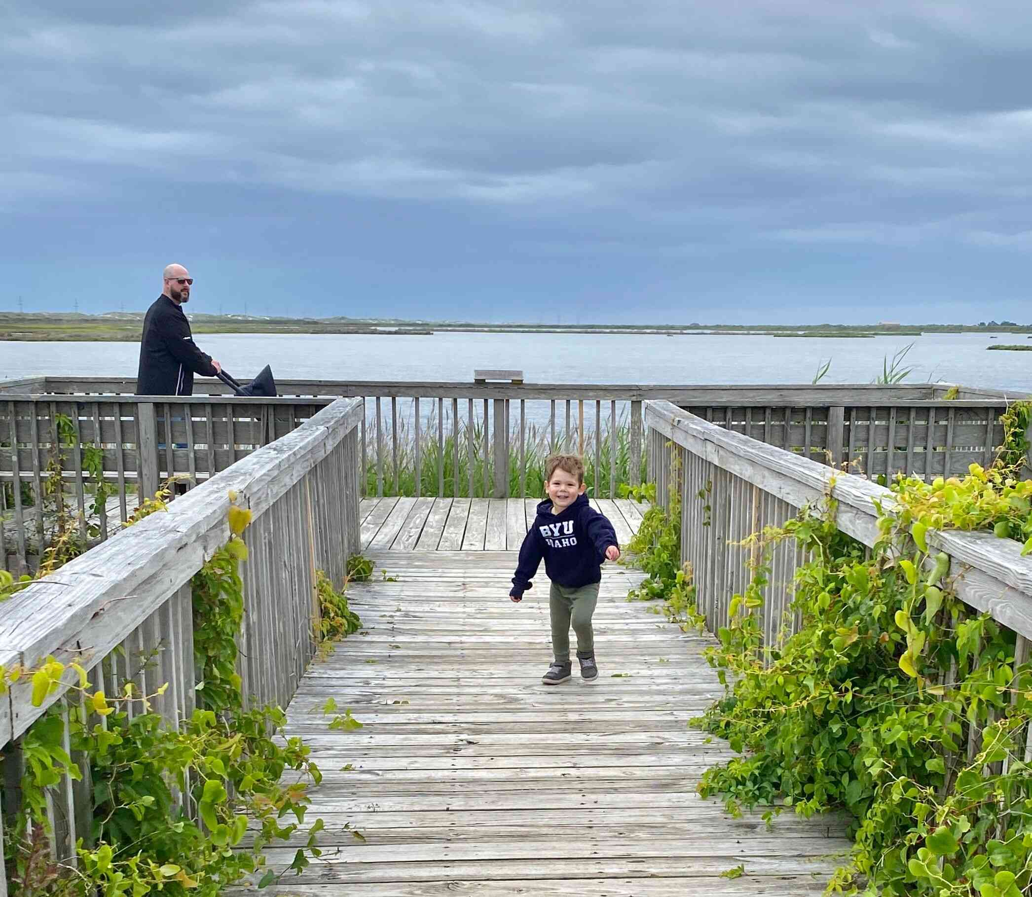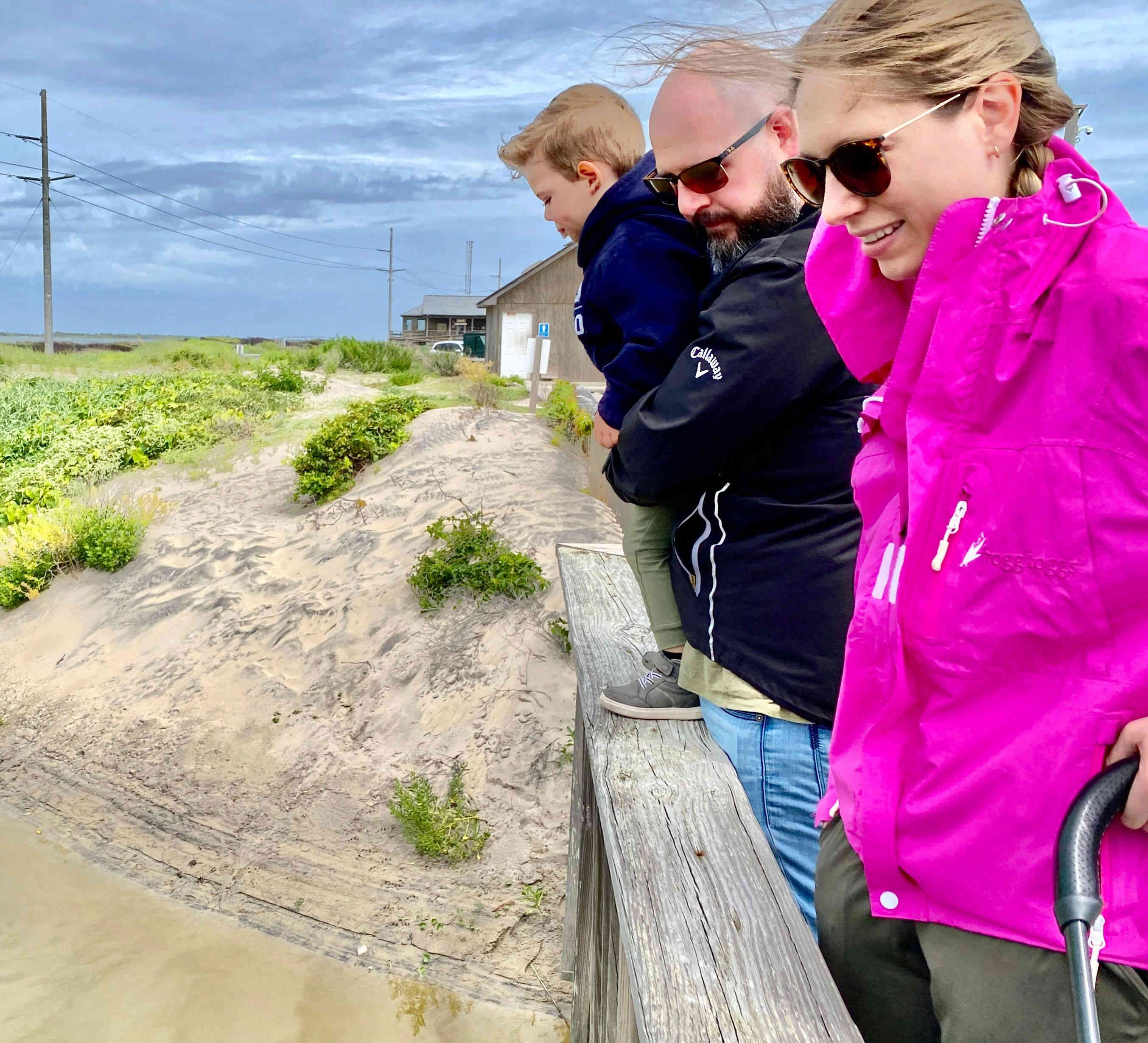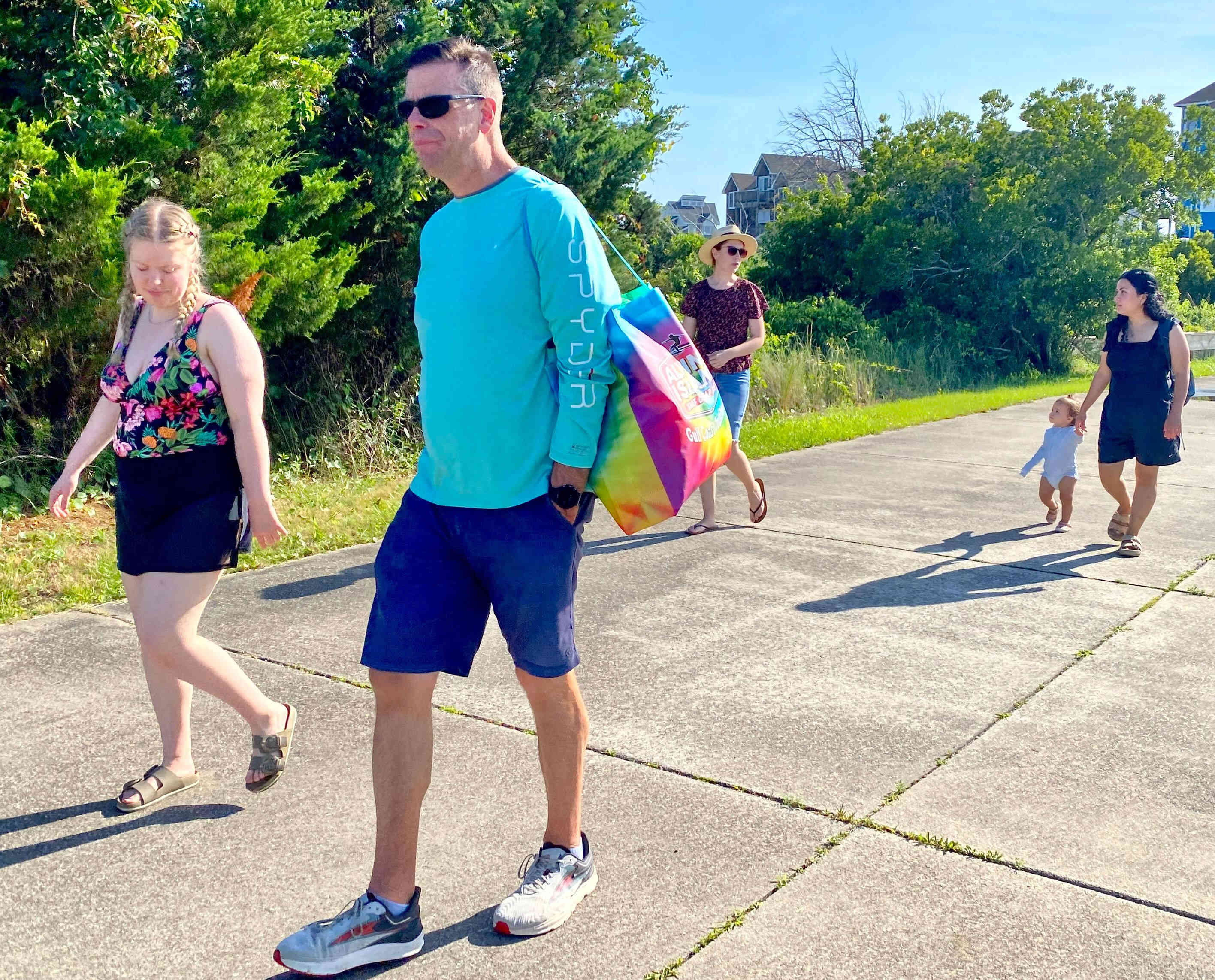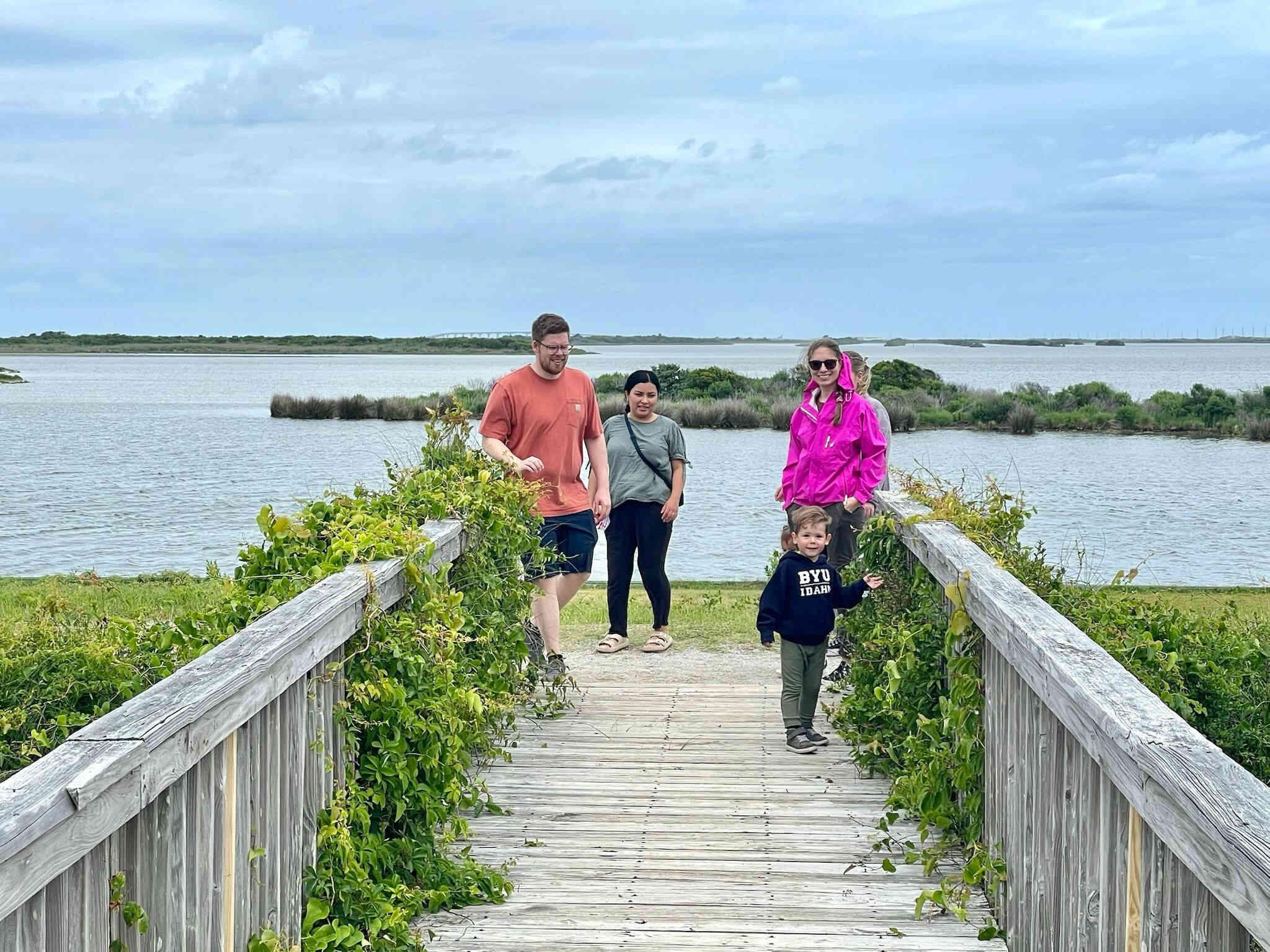 Sean & Finn, and Aubrey, Raul & Claire taking a walk to the dock and sound-side beach for a little fresh air.