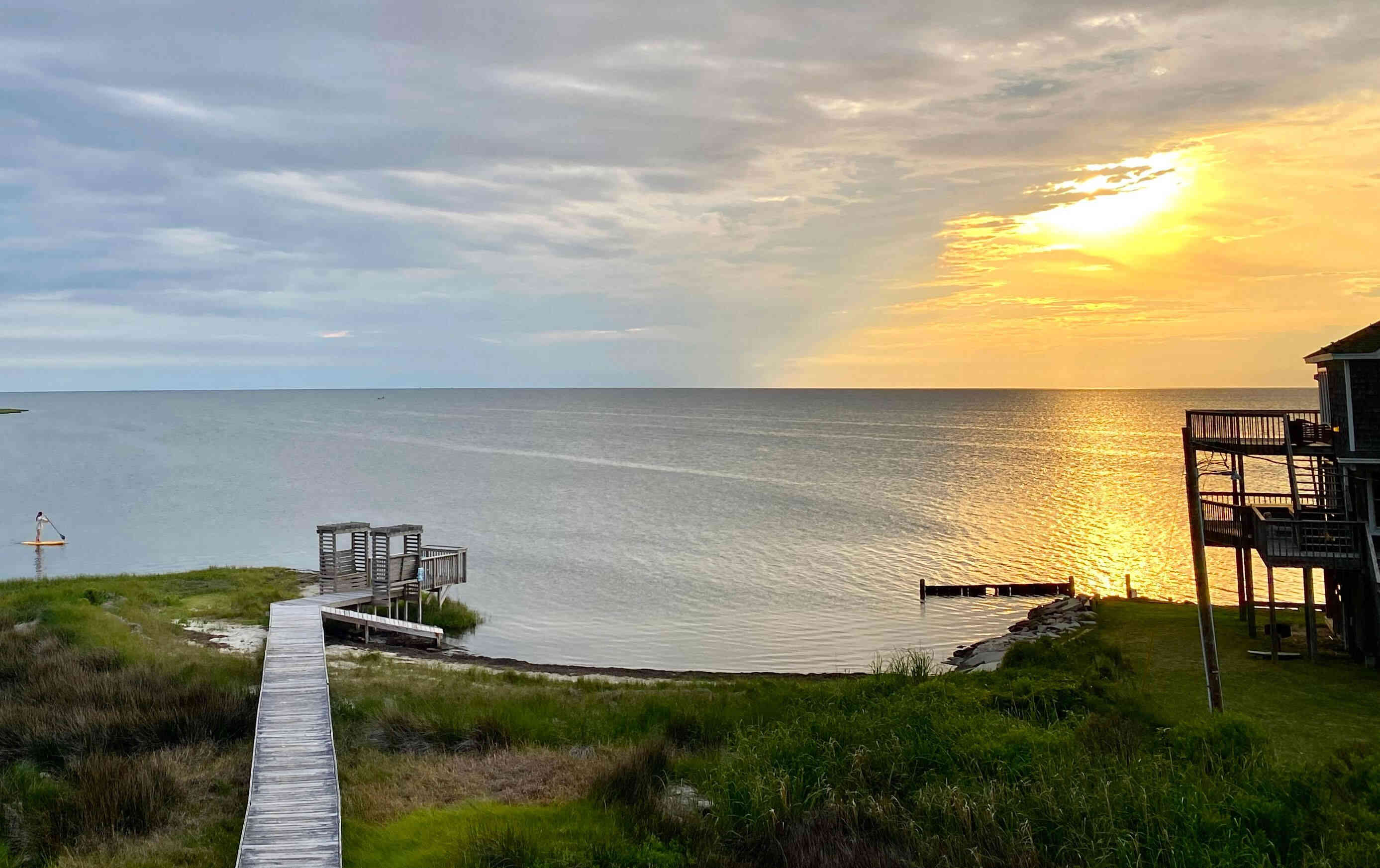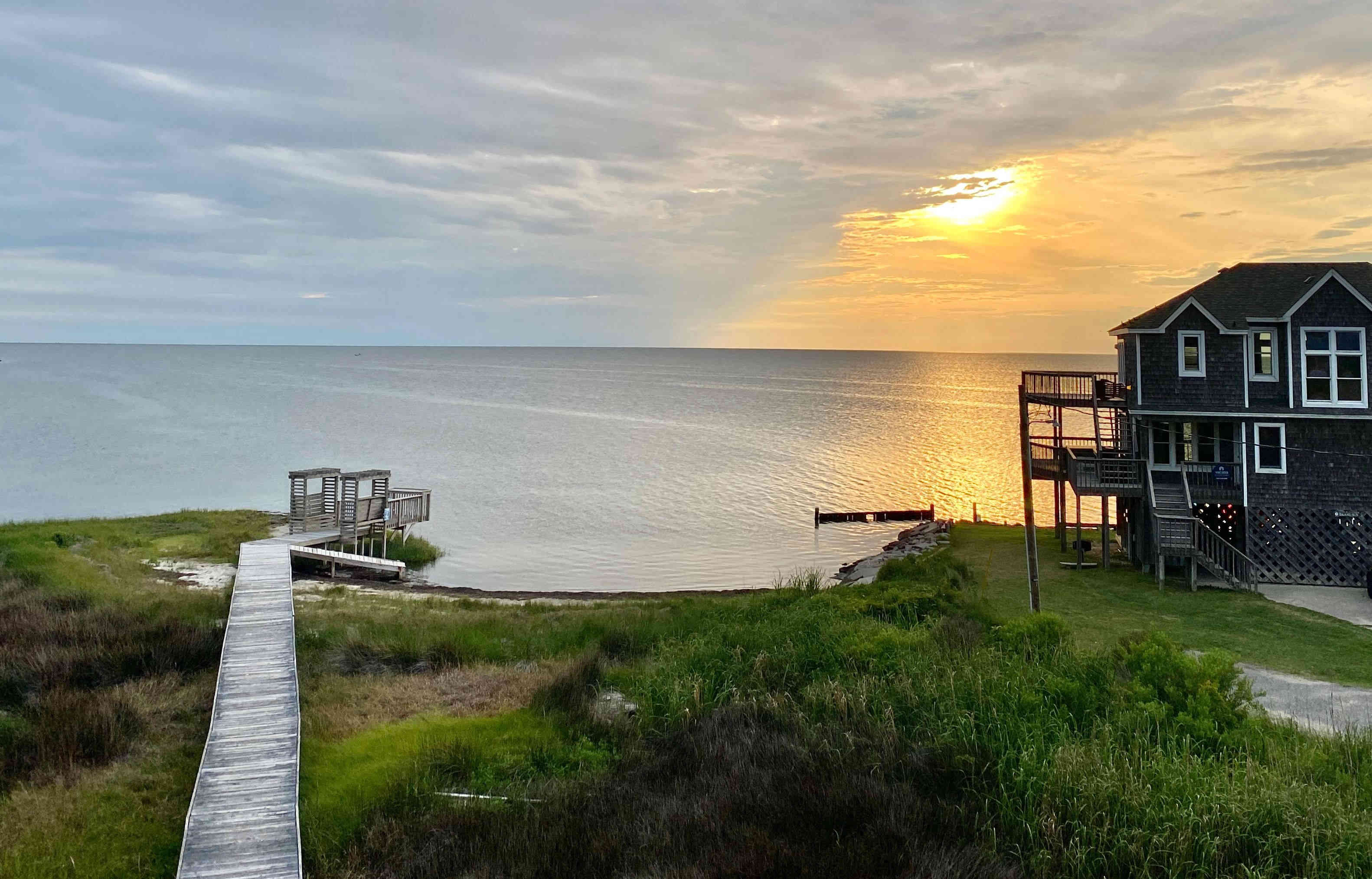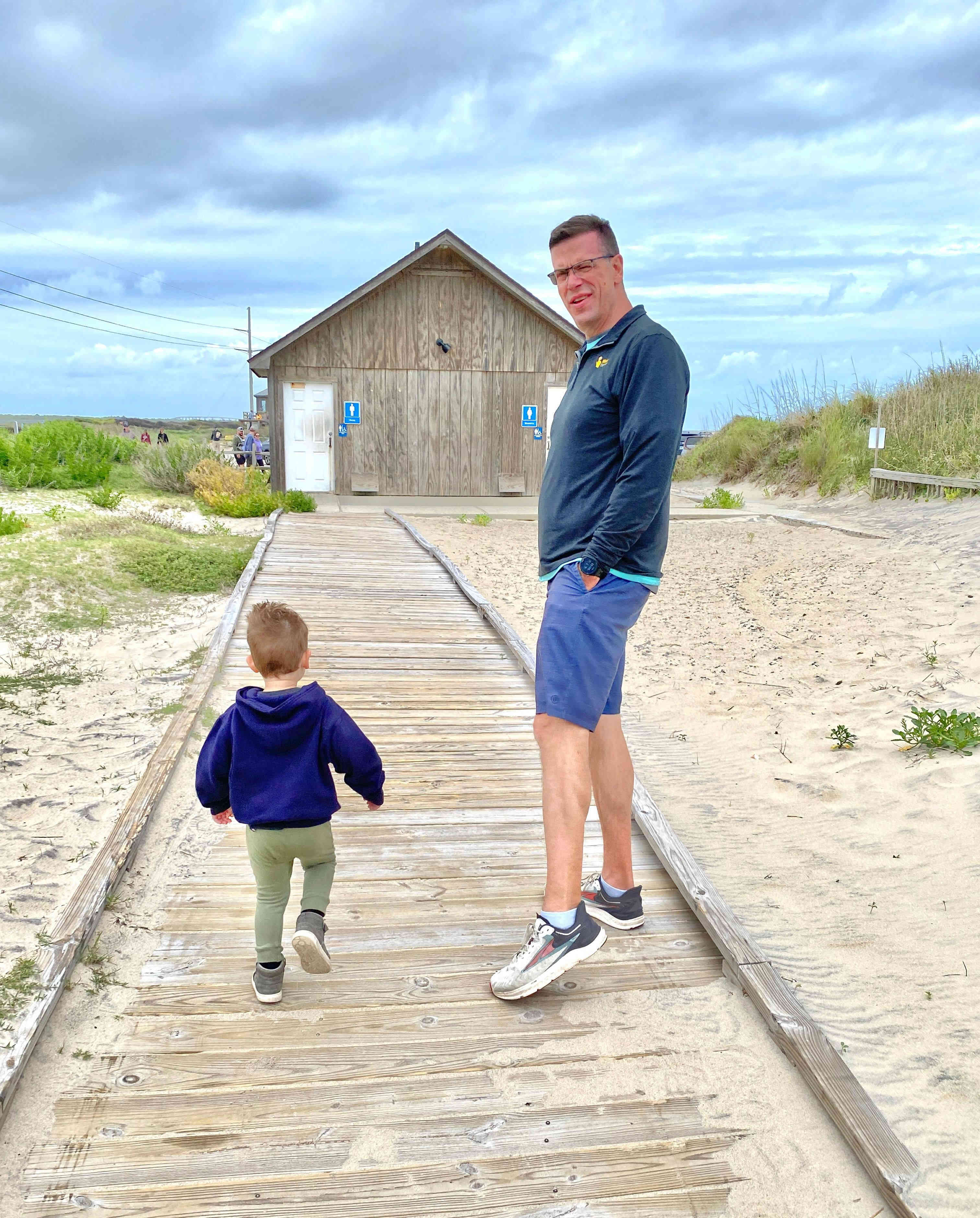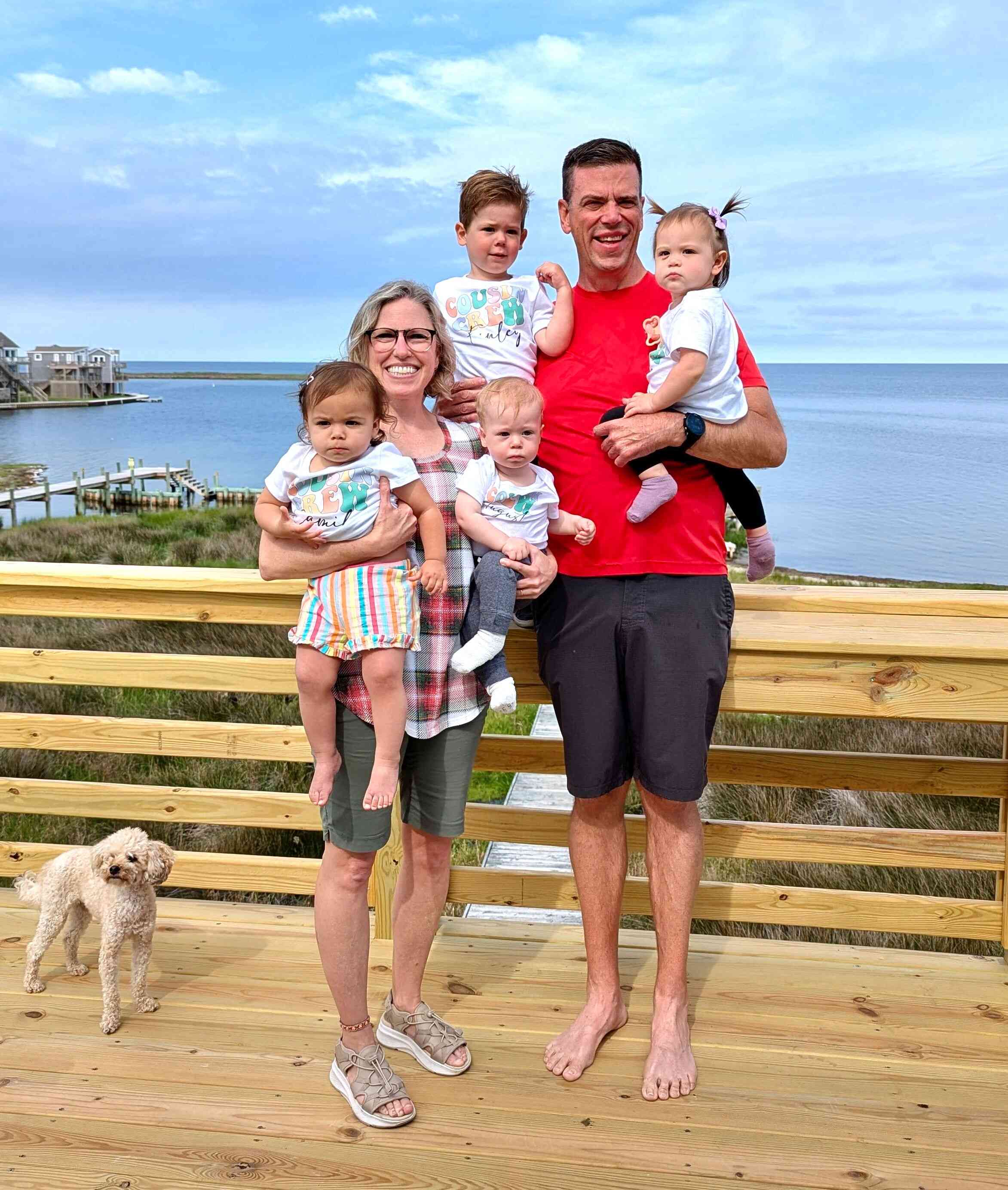 Sean & Finn, and Aubrey, Raul & Claire taking a walk to the dock and sound-side beach for a little fresh air.