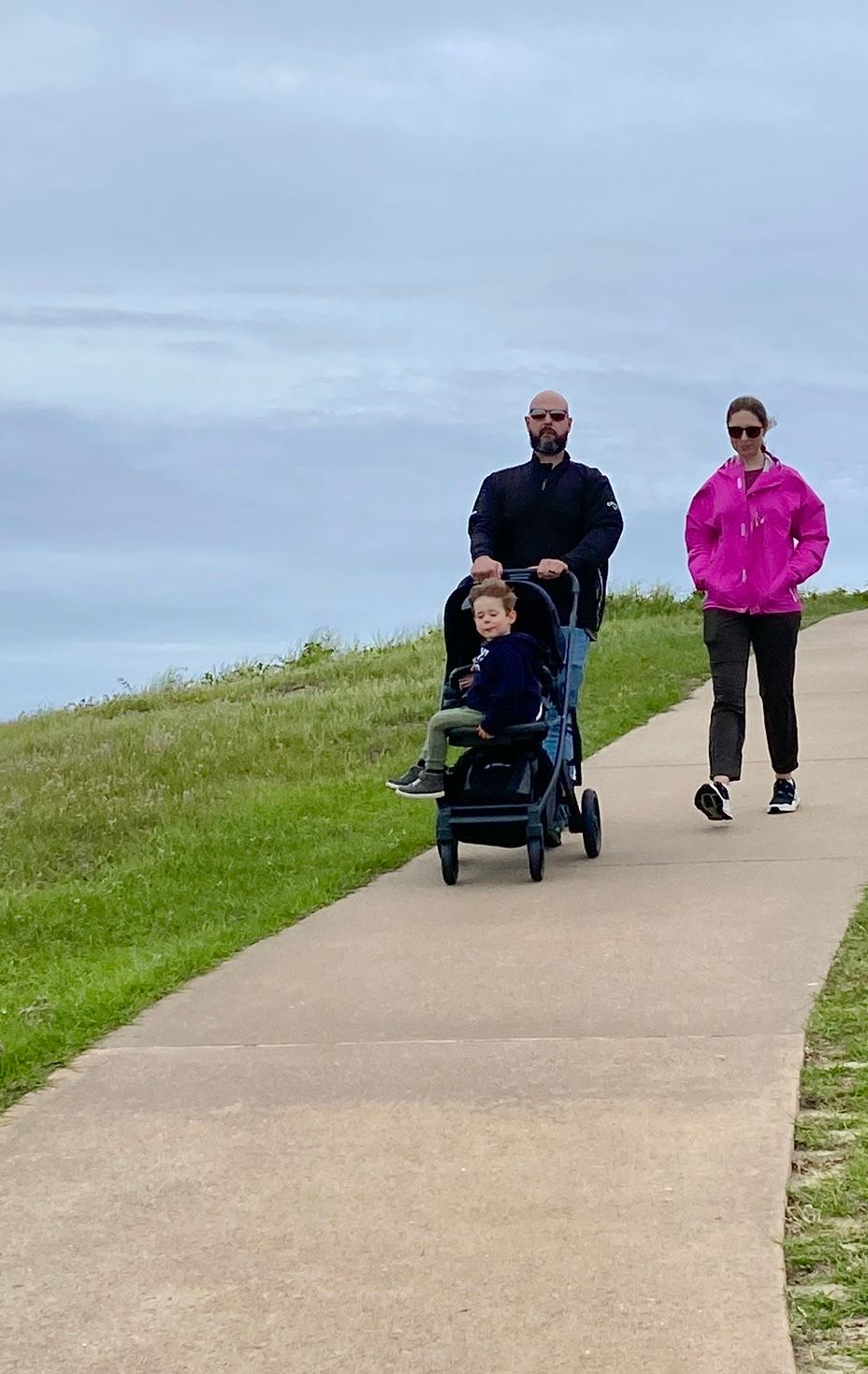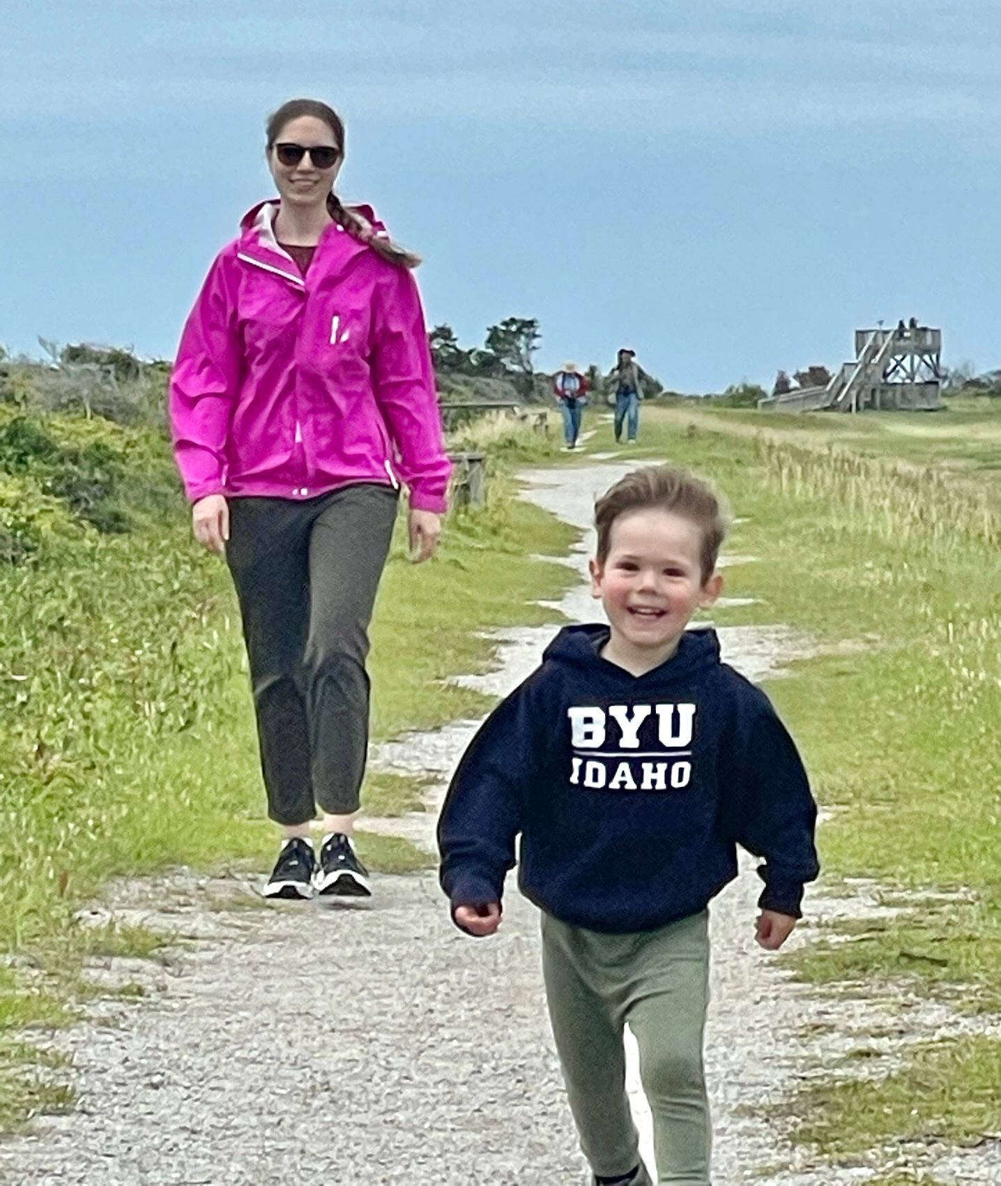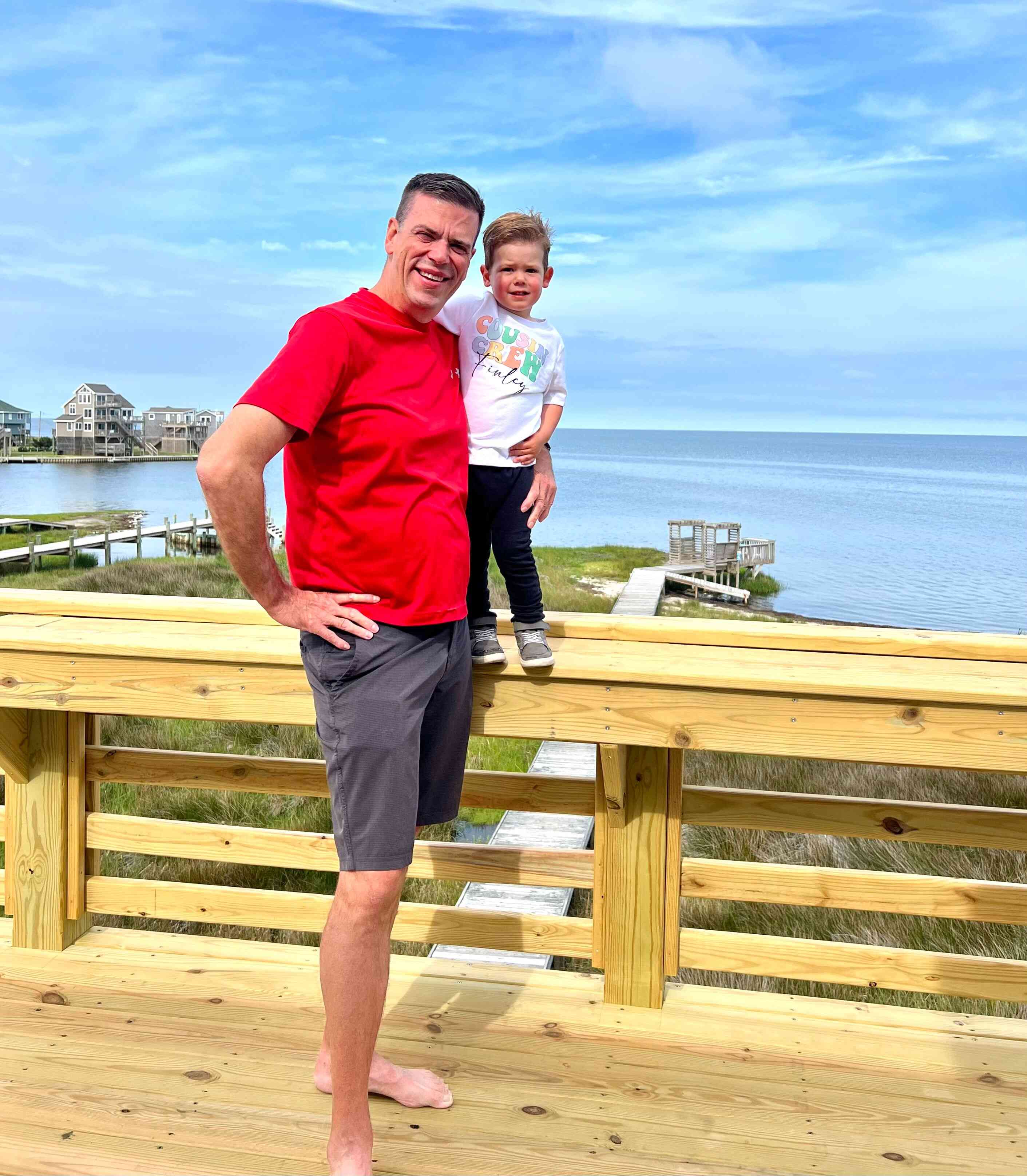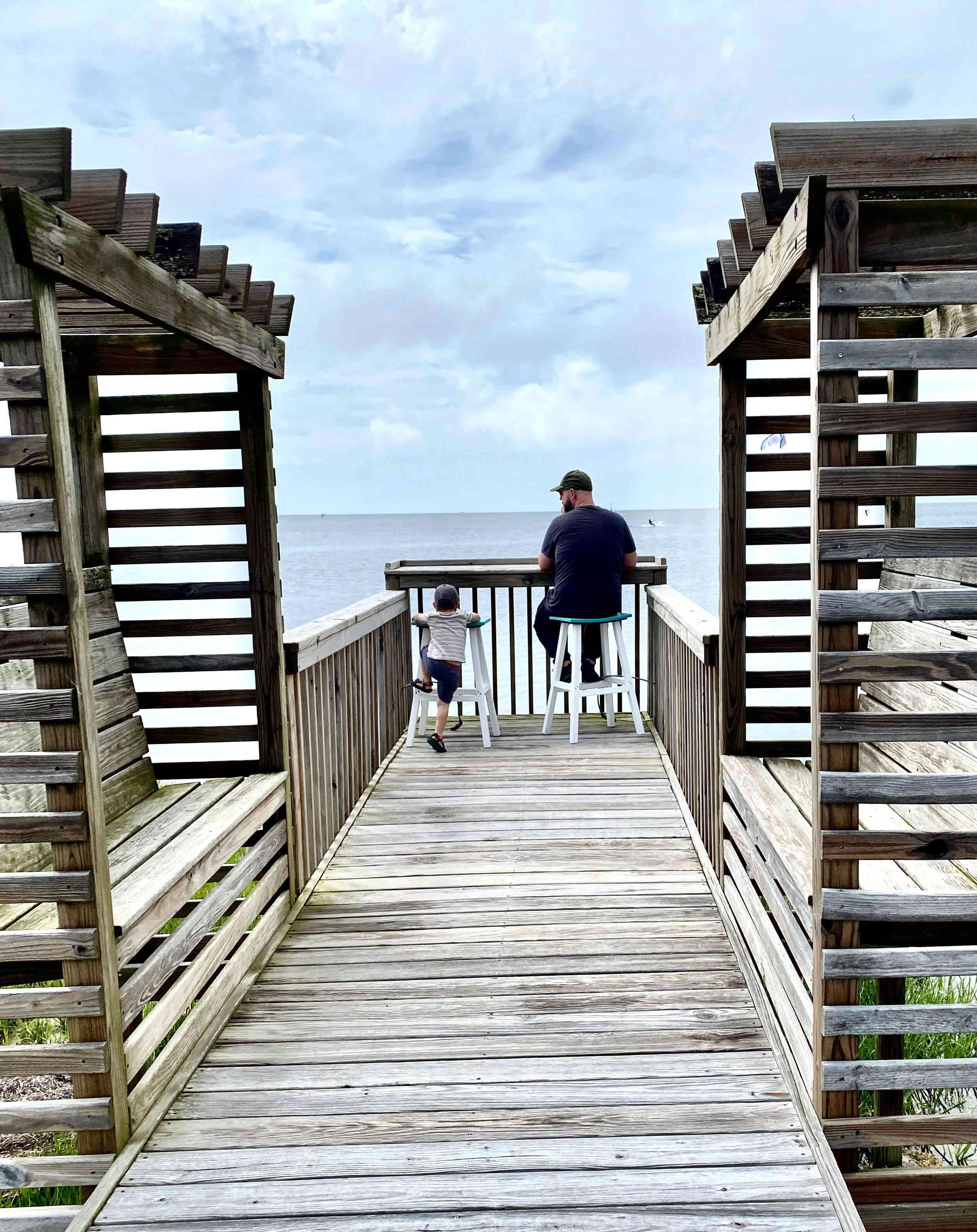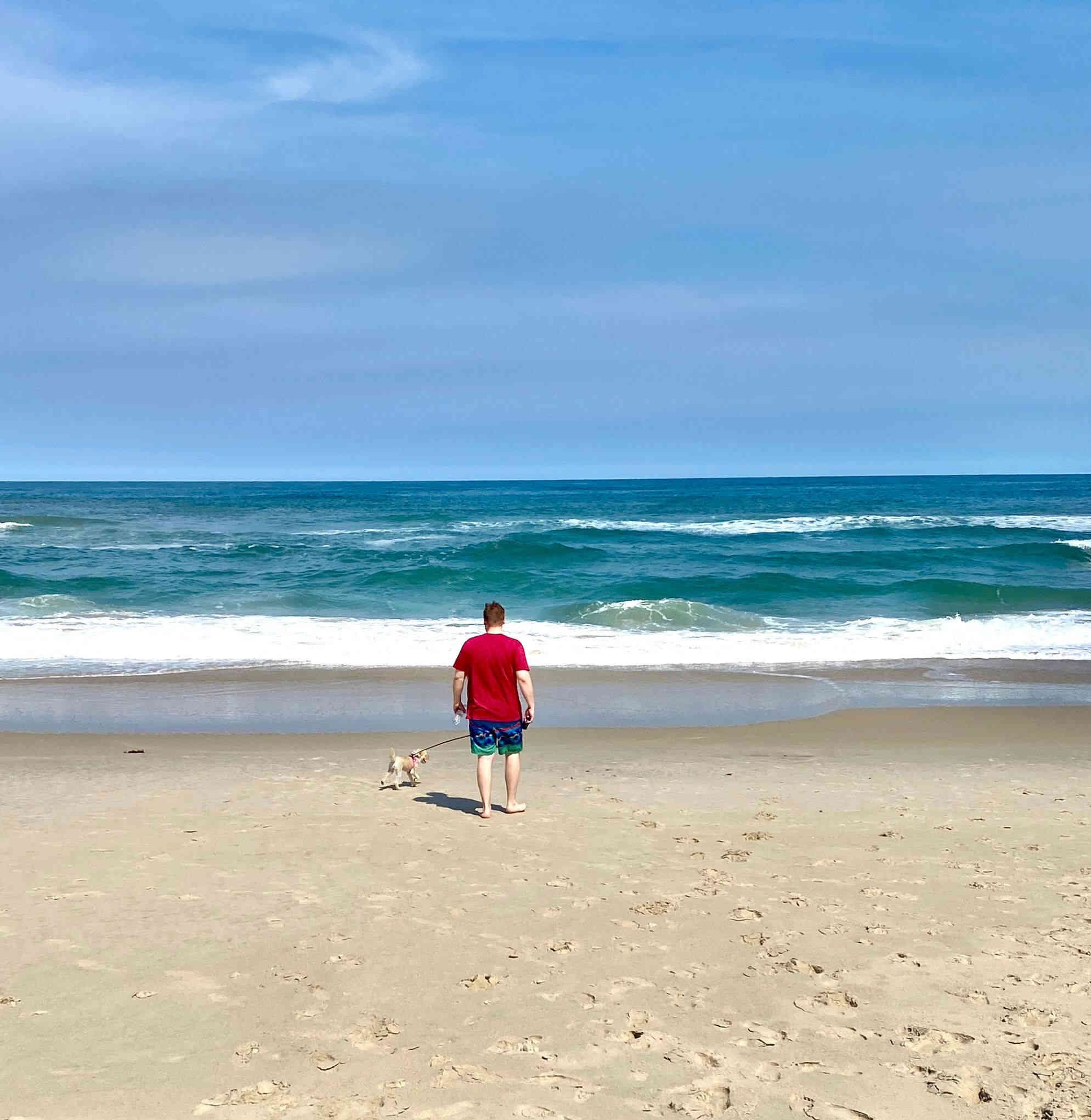 Sean & Finn, and Aubrey, Raul & Claire taking a walk to the dock and sound-side beach for a little fresh air.