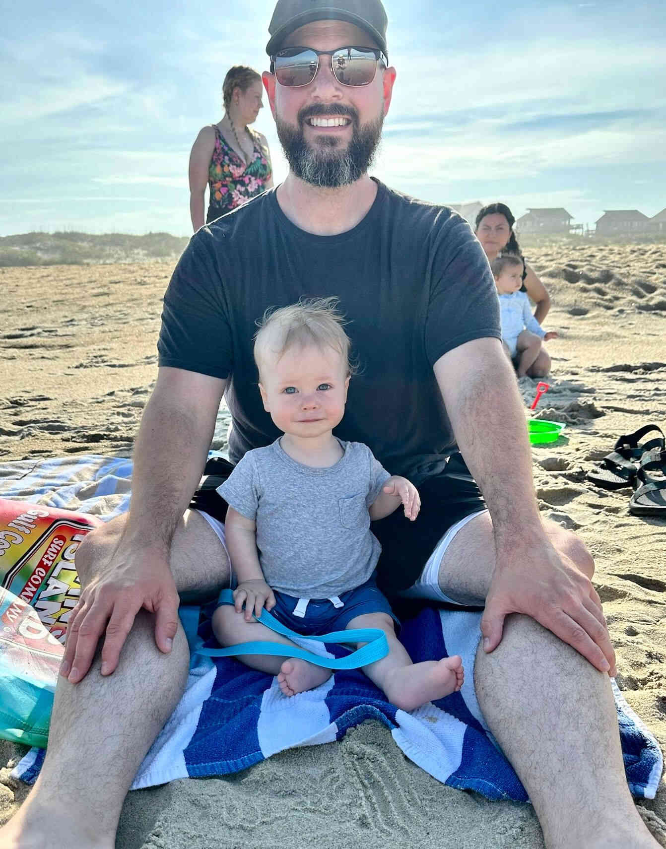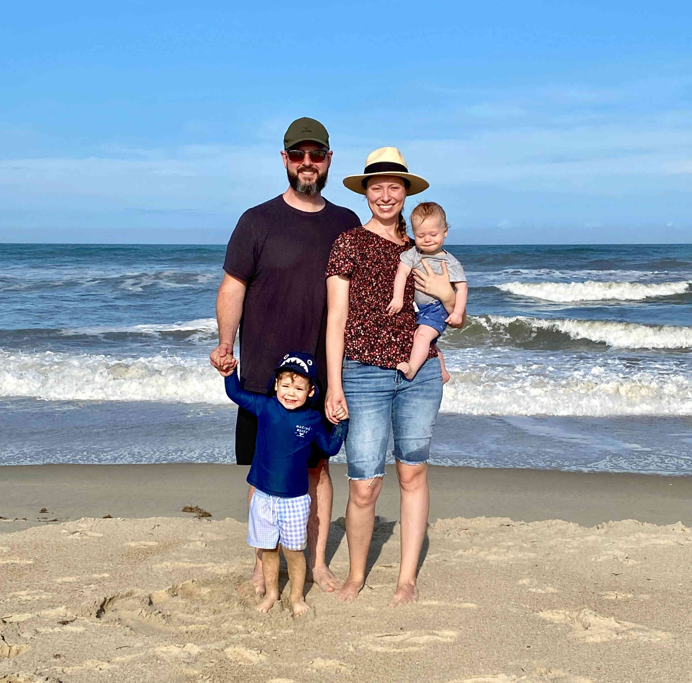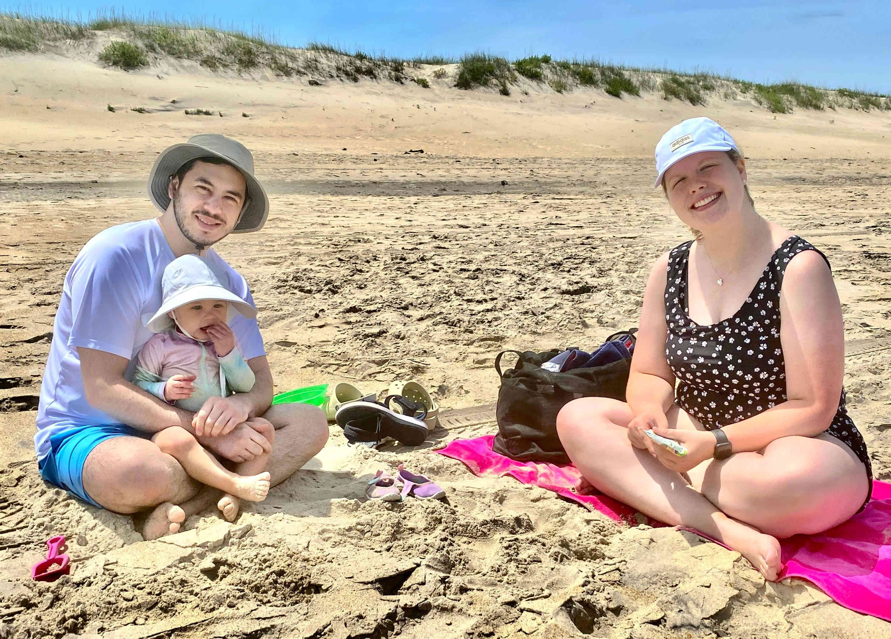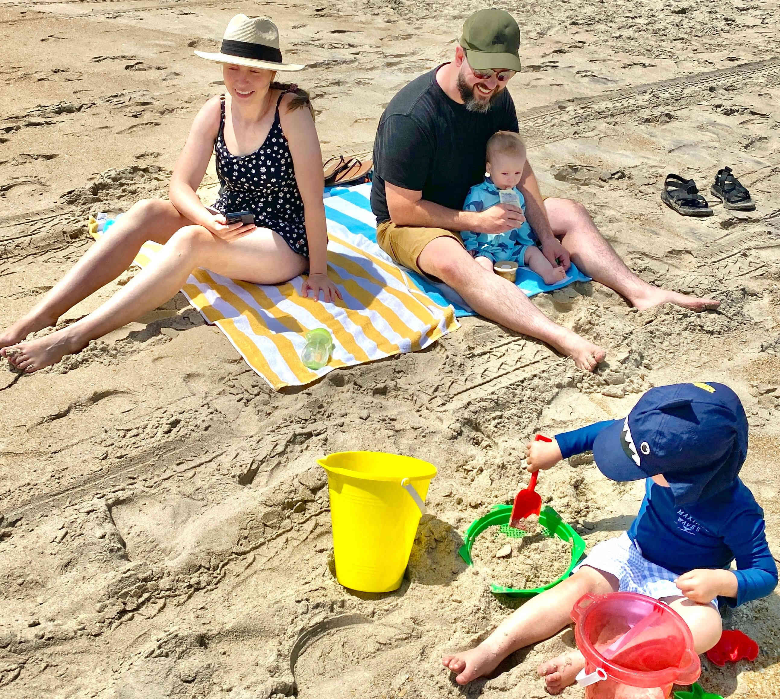 Brittney, Sean, Gus and Finn chillin in the sand.