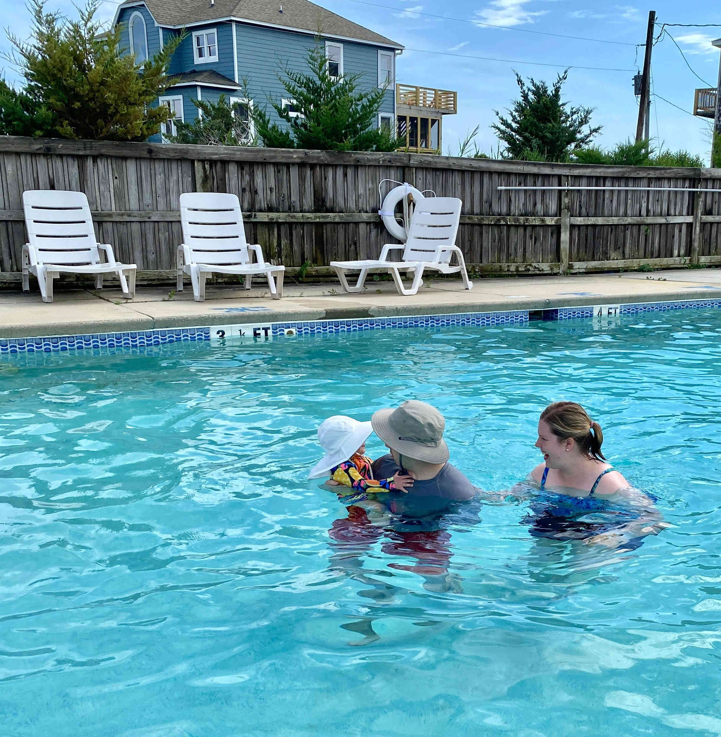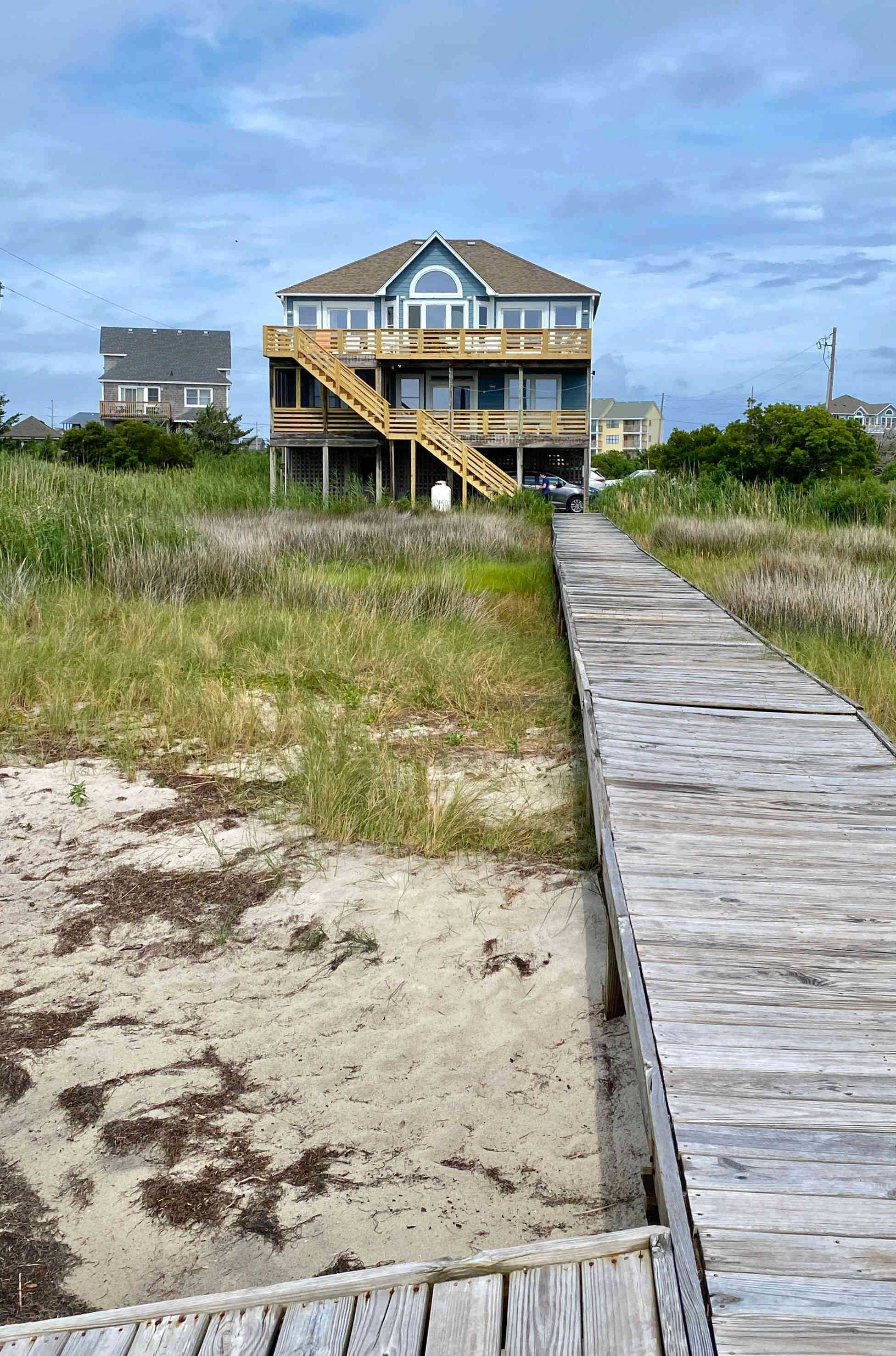 This was our AirB&B in Avon OBX, and it was the perfect size for all of us. Each family (including Merinda) had their own room and bathroom, the great room was large enough for all of us at one time, and the dining room table had enough seating for everyone. The deck was huge with a picnic table, and adirondack and lounge chairs. The views of the Sound from the great room and deck (first picture) were gorgeous, and I just loved watching the novice and experienced wind and kite-boarders glide across the sparking water! Our AirB&B also came fully equipped with a hot tub, outdoor shower, and covered parking, plus, there was a free community pool just steps from our B&B. But best of all, we were within walking distance to the beach! We couldn't have asked for better accommodations, or location!!