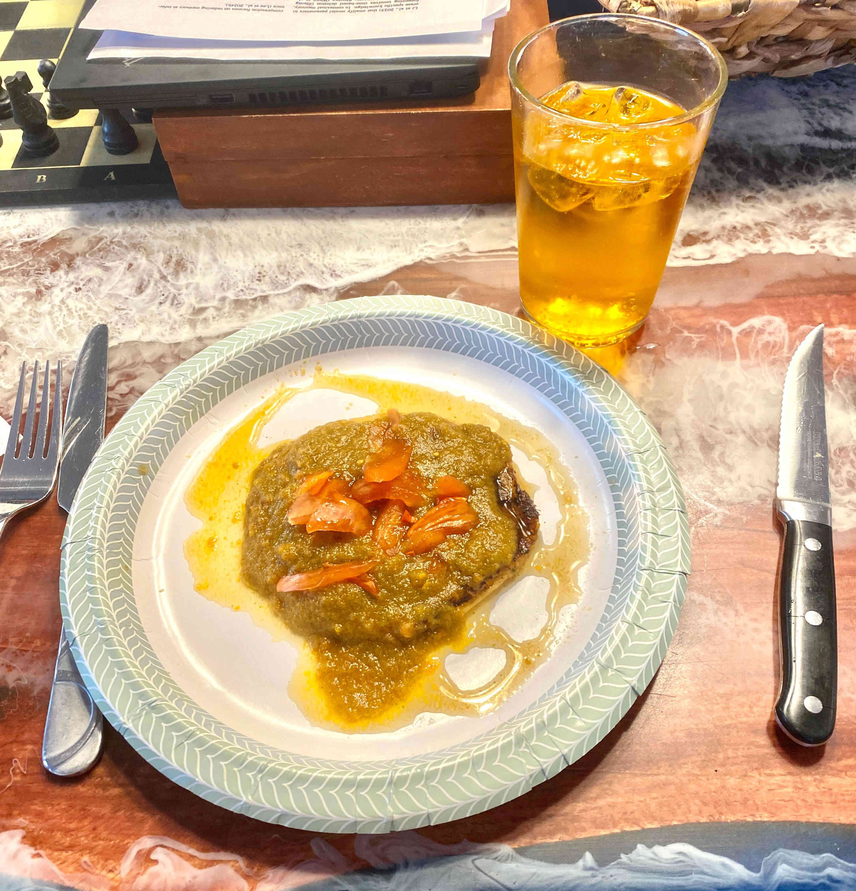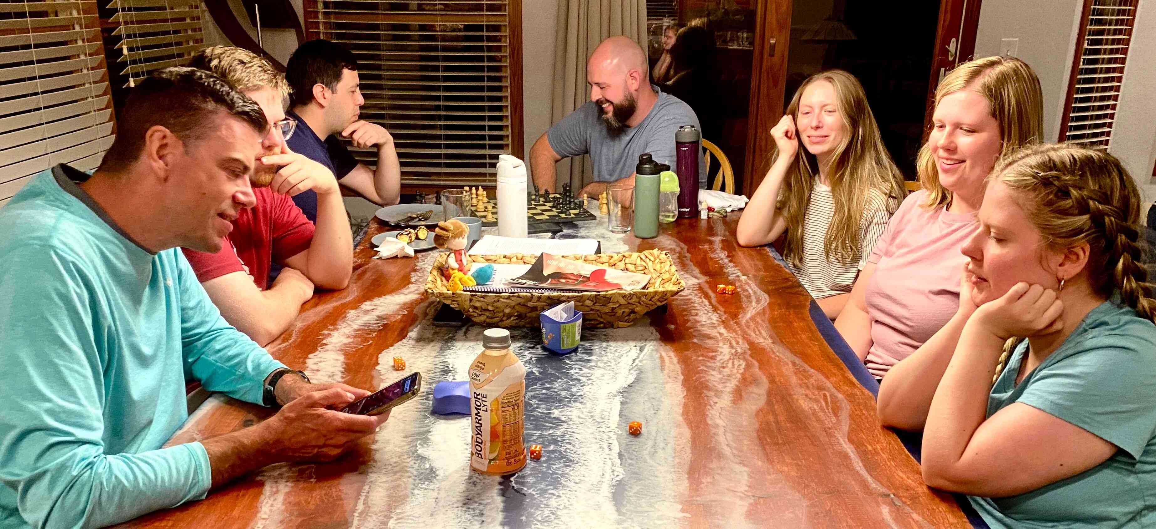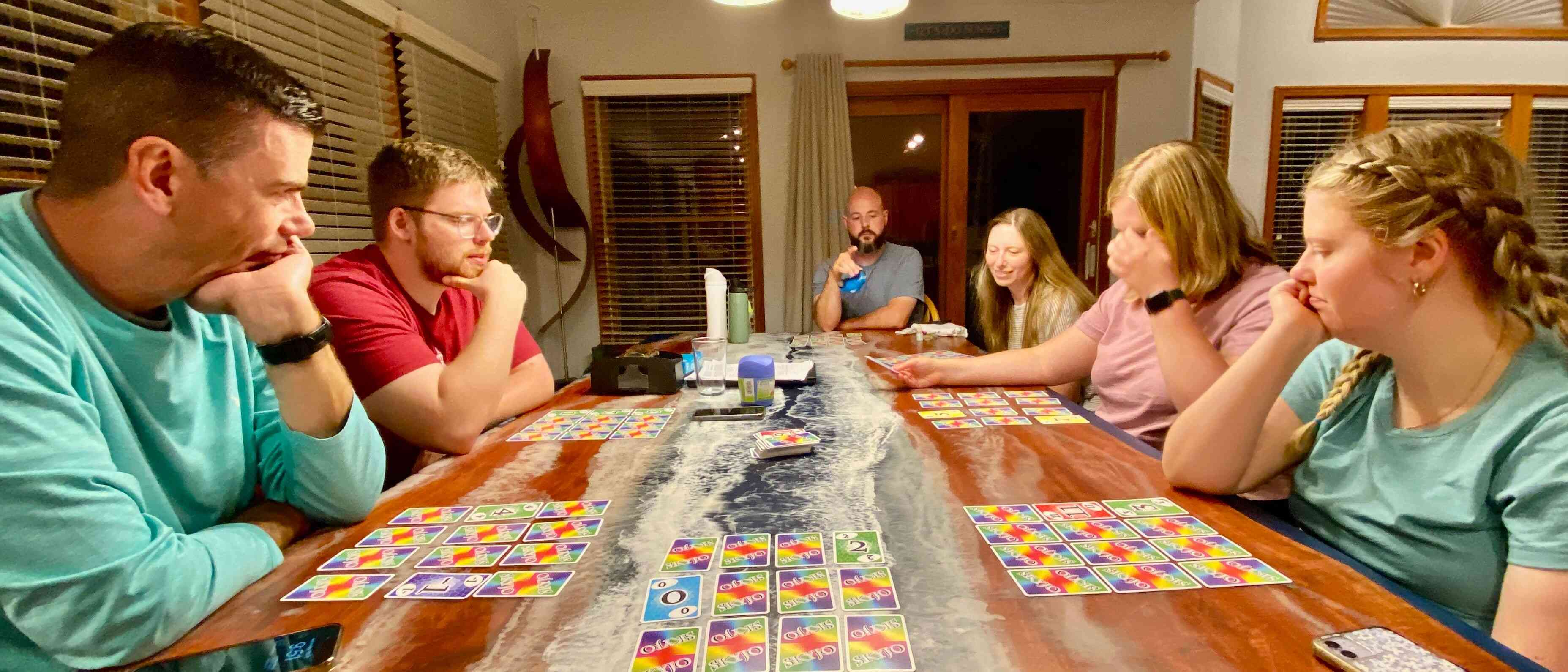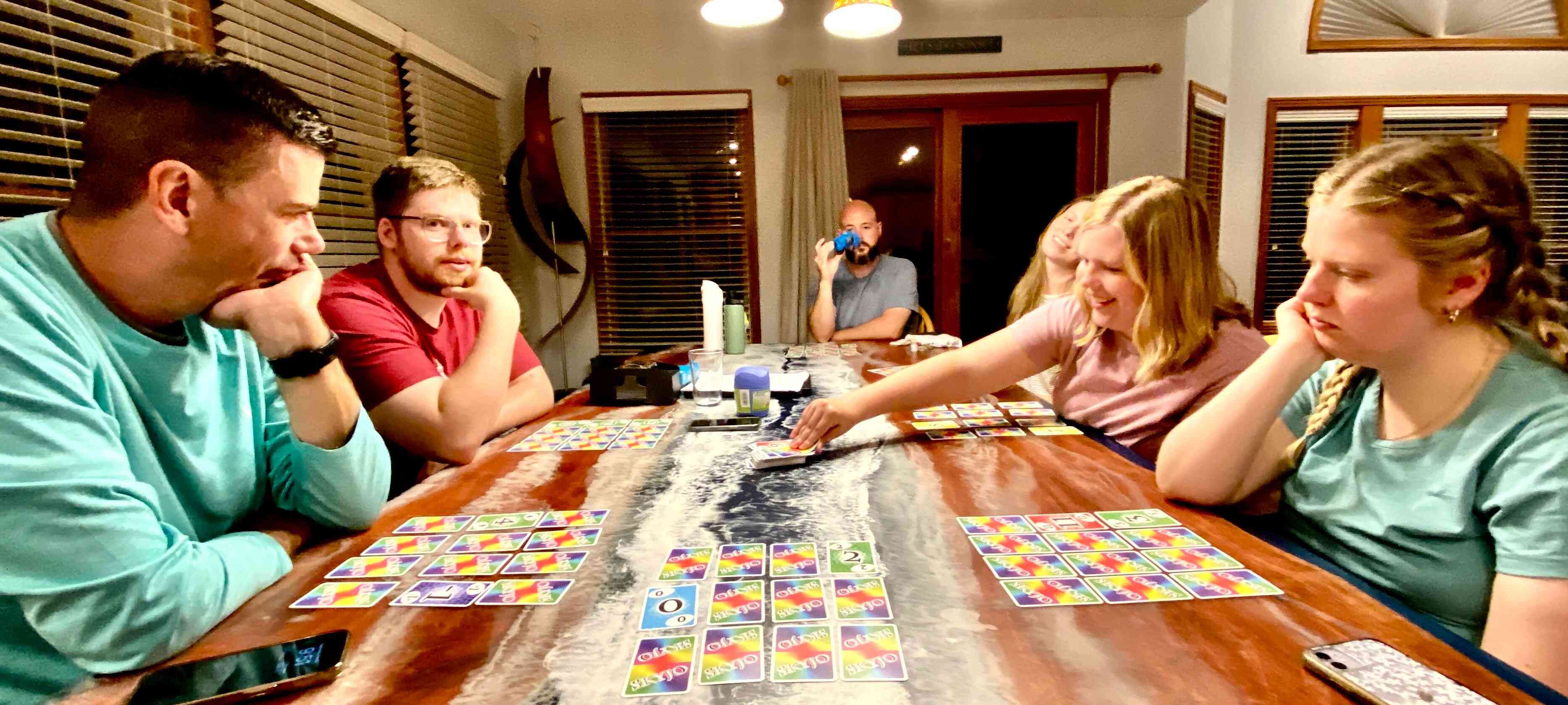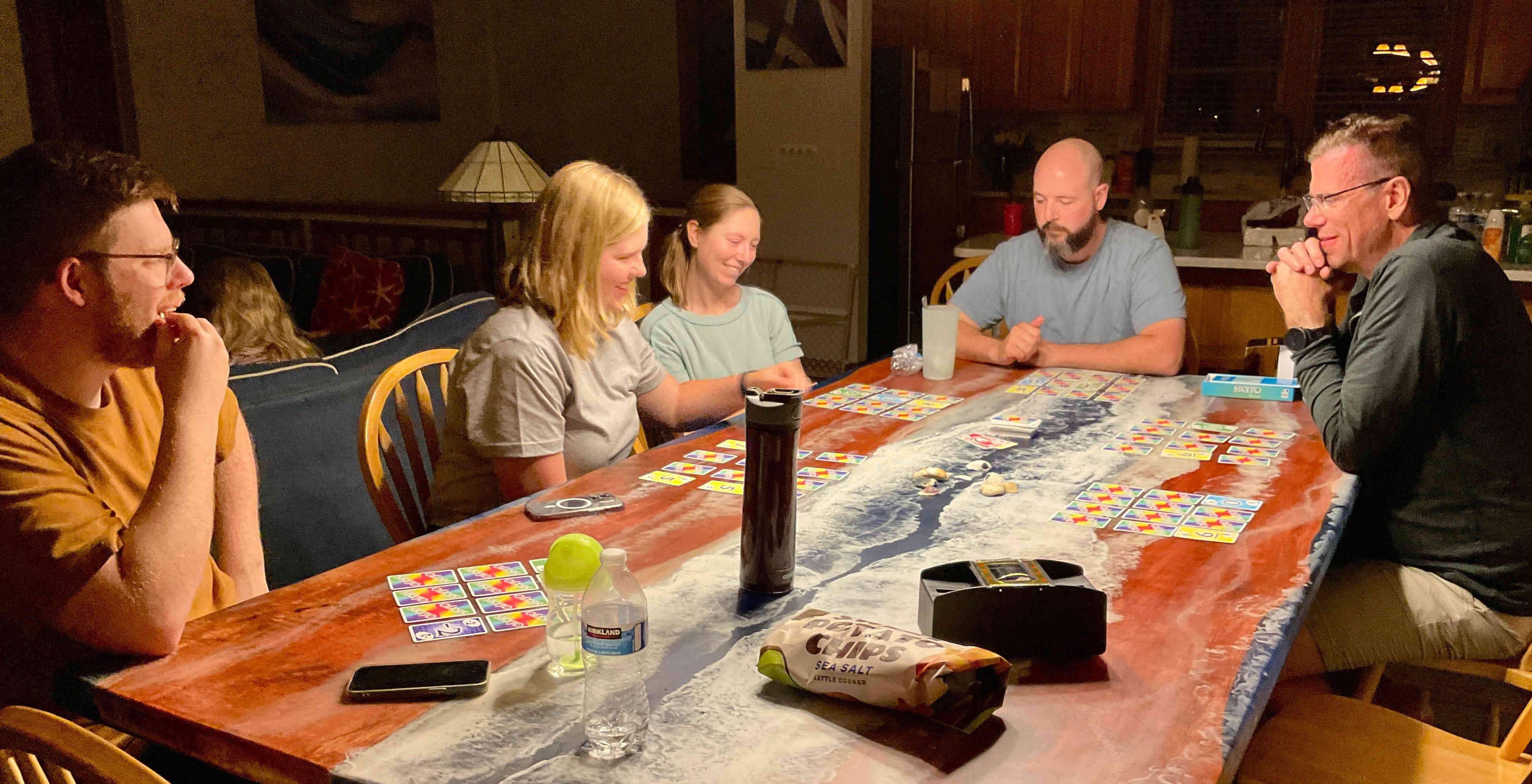 After dinner clean-up, family prayer, and putting the kids to bed, we played more games of Bank & Skyjoe, while Sean and Raul played an intense game of chess!