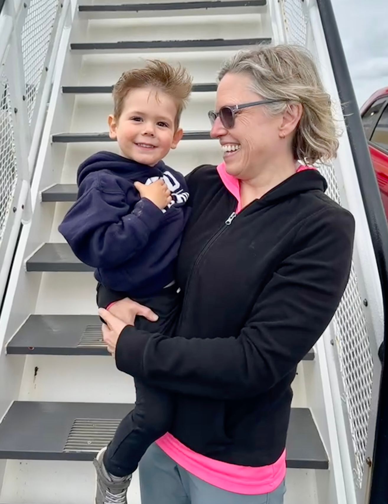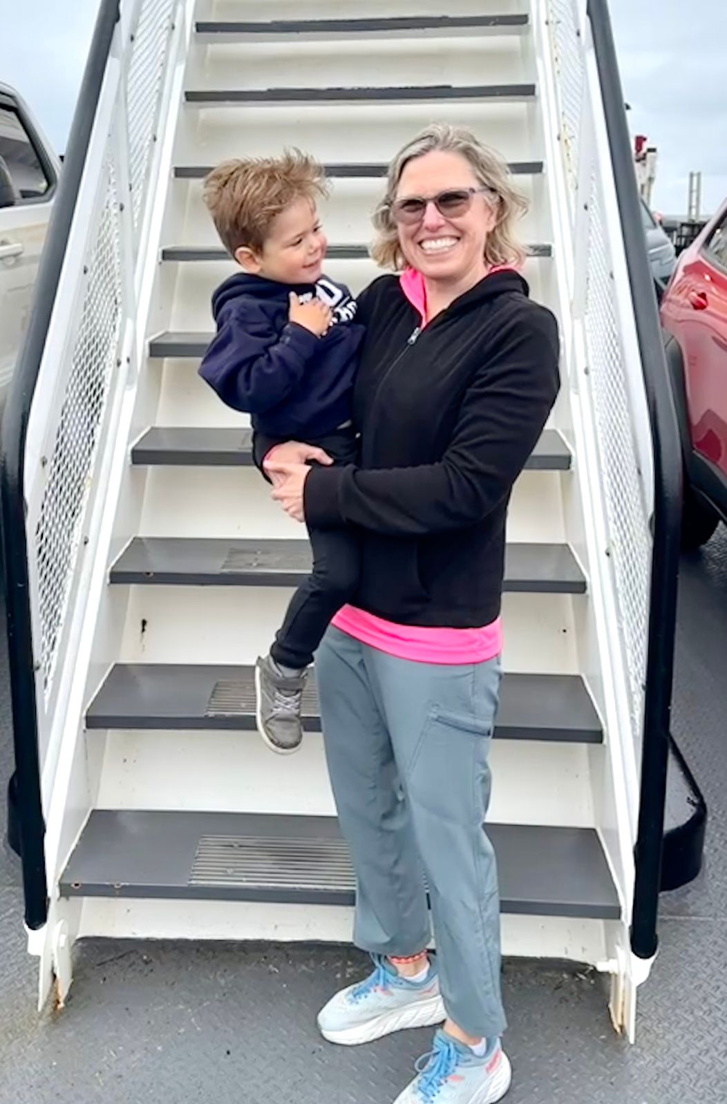 We took picture in front of the stairs before climbing them to check out where the passengers without cars could stay.