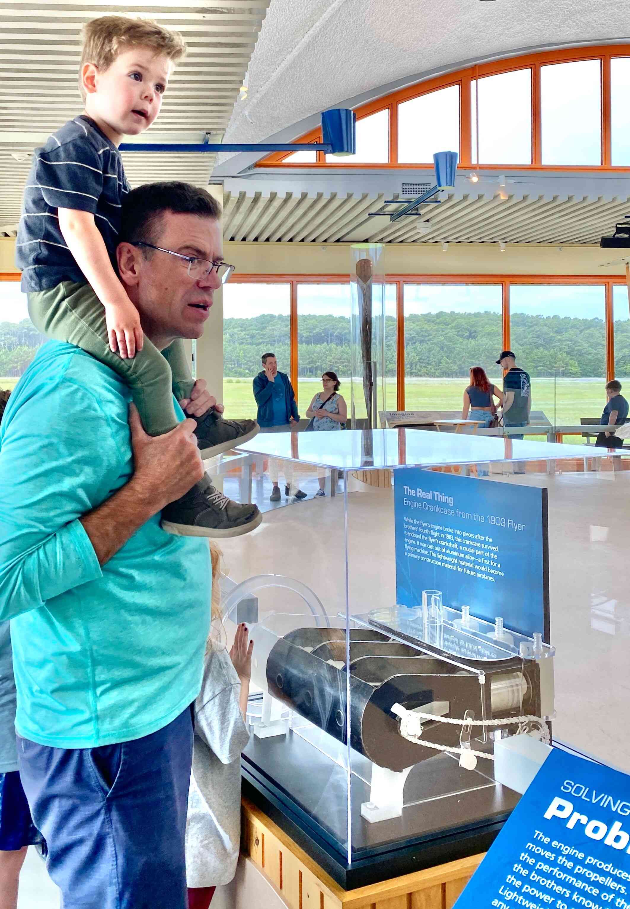 Next stop, Kitty Hawk, and First Flight Museum! Finn looking at a replica of the "Wright Flyer", the first manned aircraft!