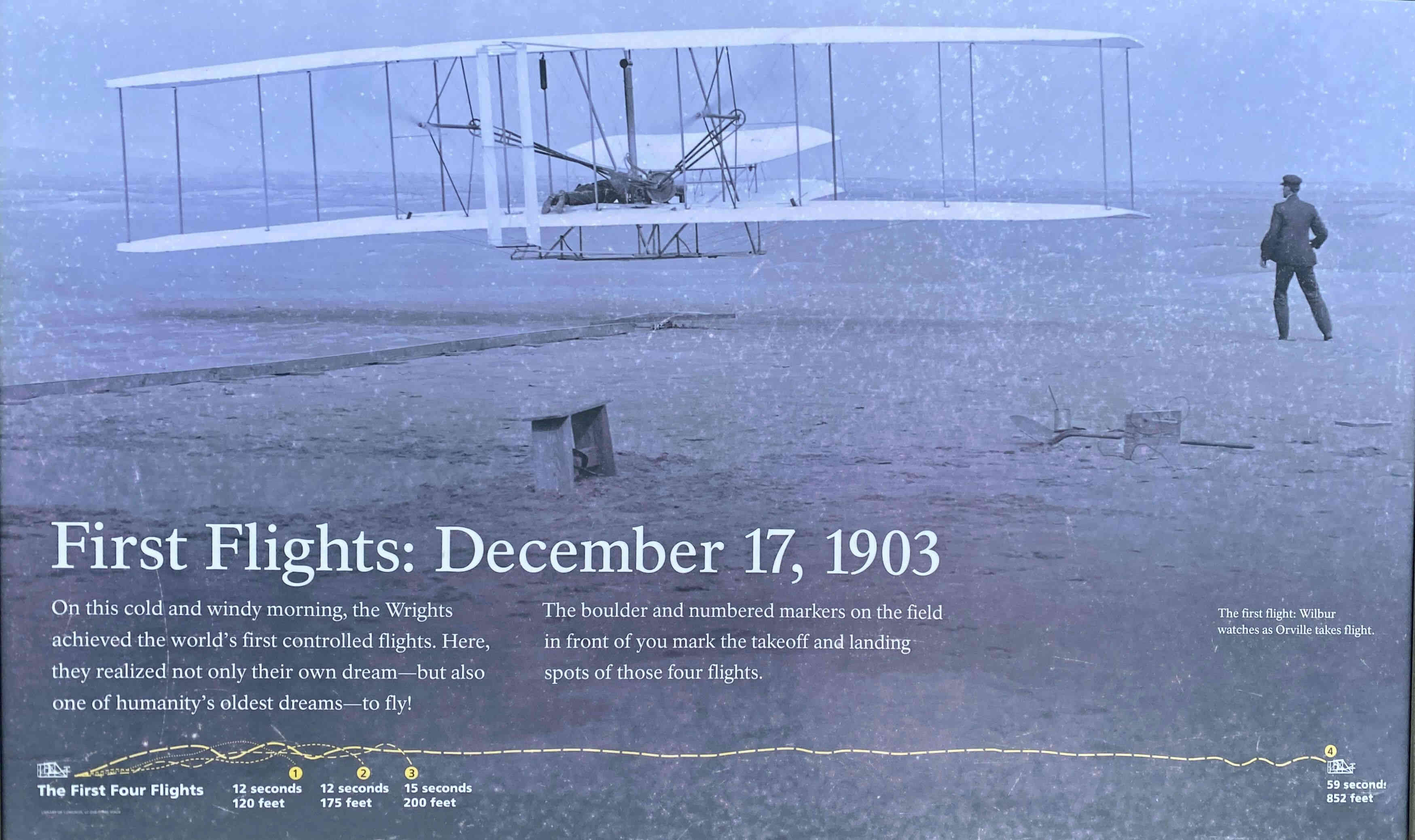 Orville went 120ft in 12 seconds at a speed of 6.8 mph the vert first flight. The next two flights covered 175ft and 200ft with both brothers taking turns piloting the aircraft. The fourth and final flight of the day, piloted by Wilbur, went 852ft in 59 sec.
