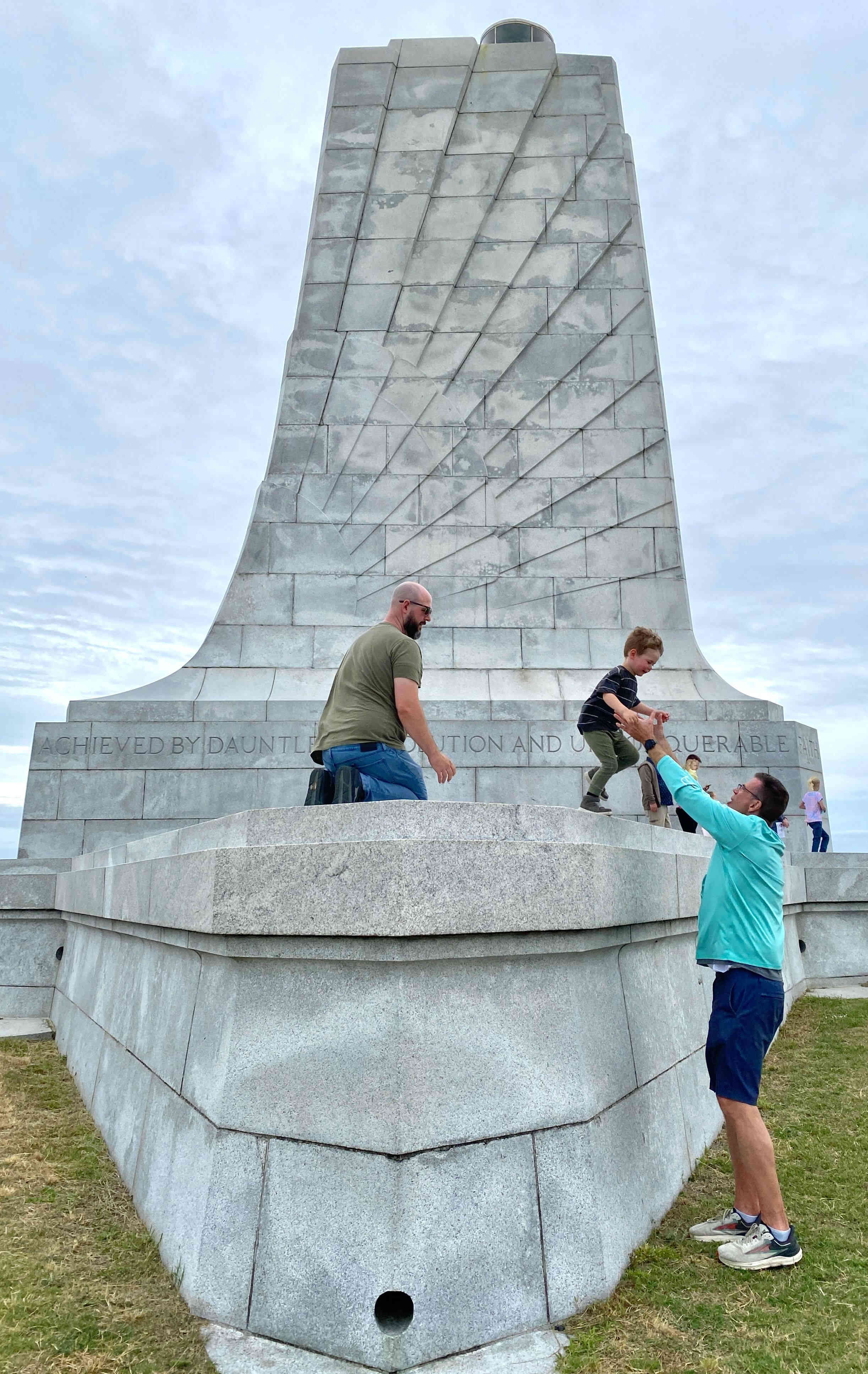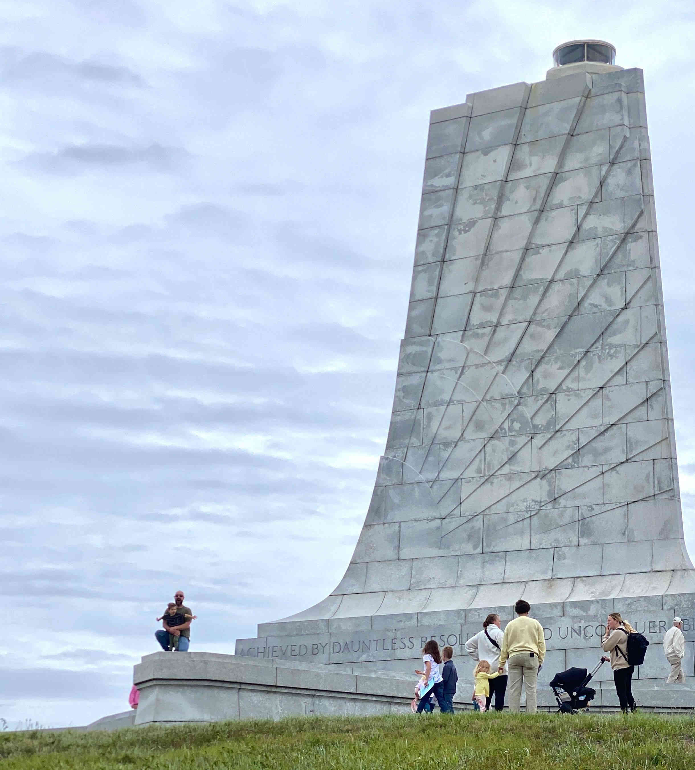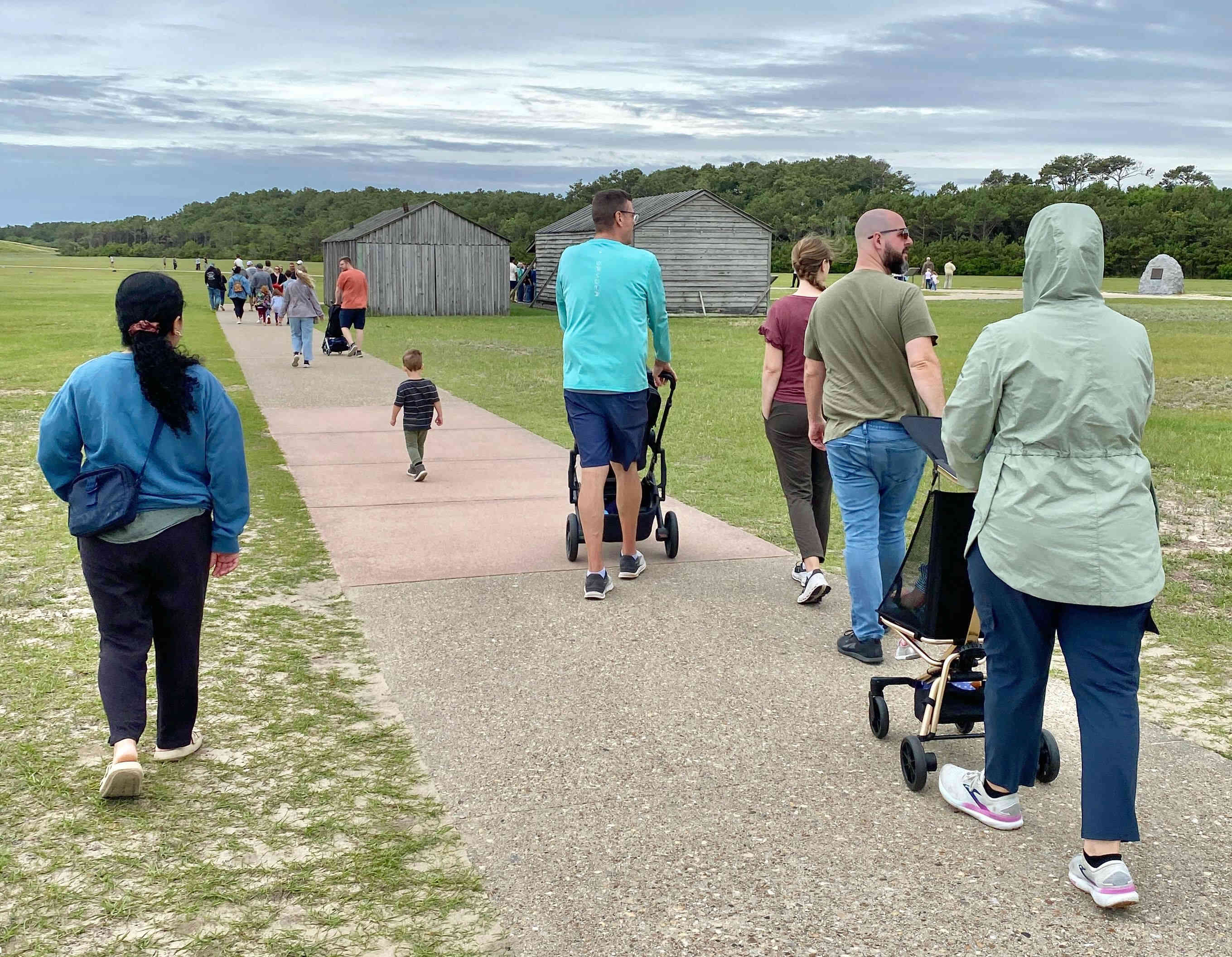 Re-grouping before walking the grounds. The Wright brother's first flights were actually at "Kill Devil Hills" just south of Kitty Hawk. Although they were from Dayton, Ohio, the brothers chose Kill Devil Hills because of the consistent winds, soft, sandy landing surfaces, and relative isolation without interference or scrutiny from the public.