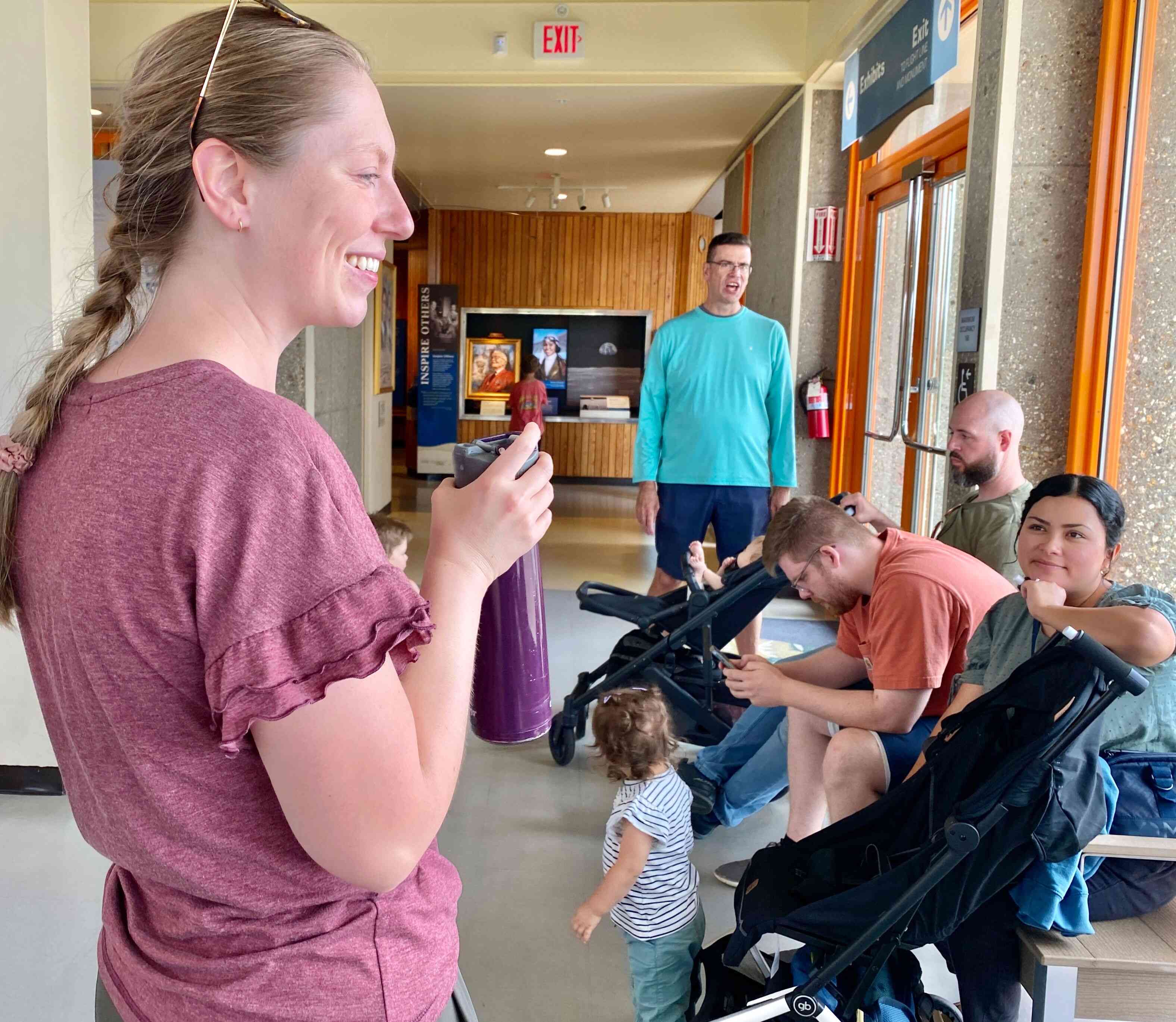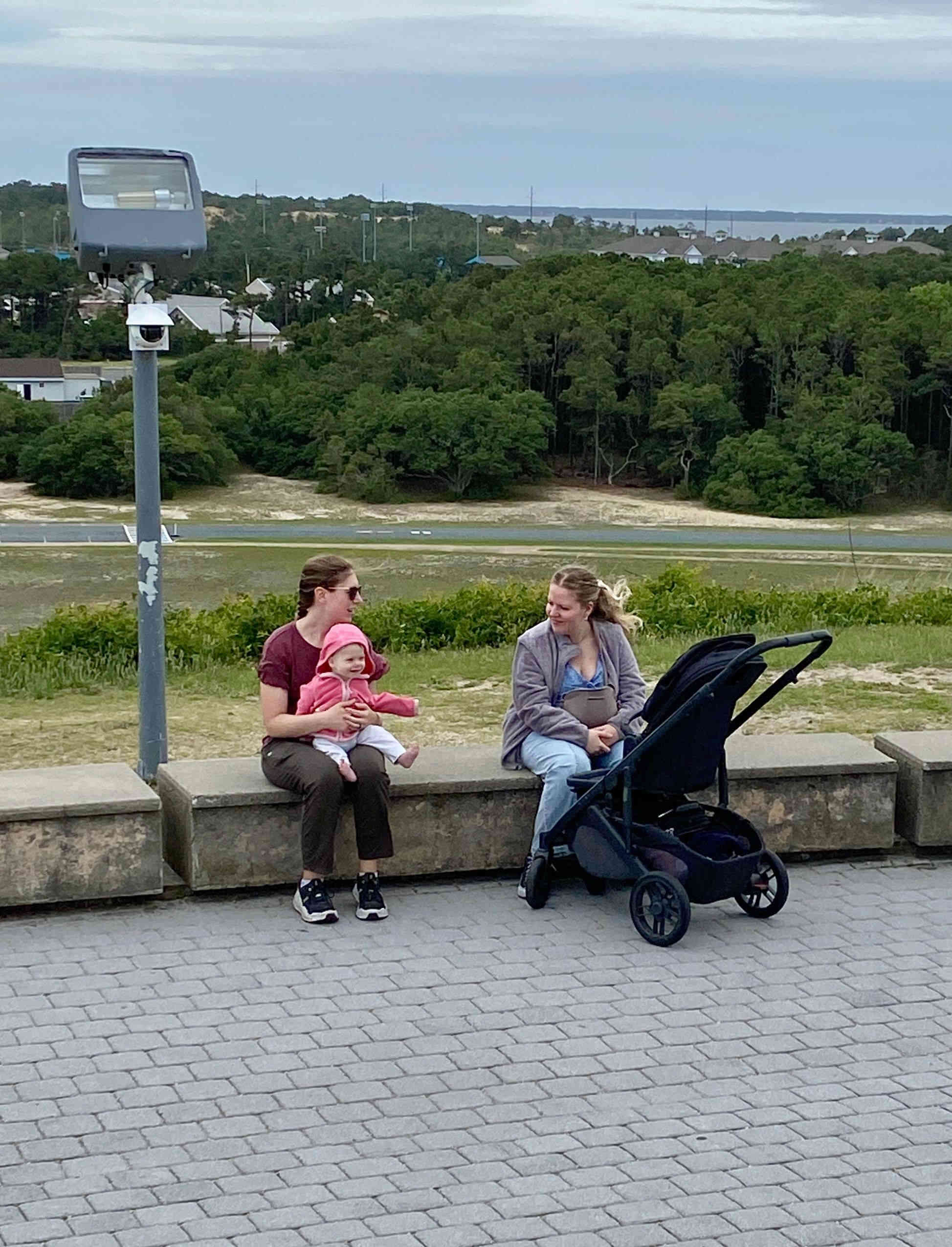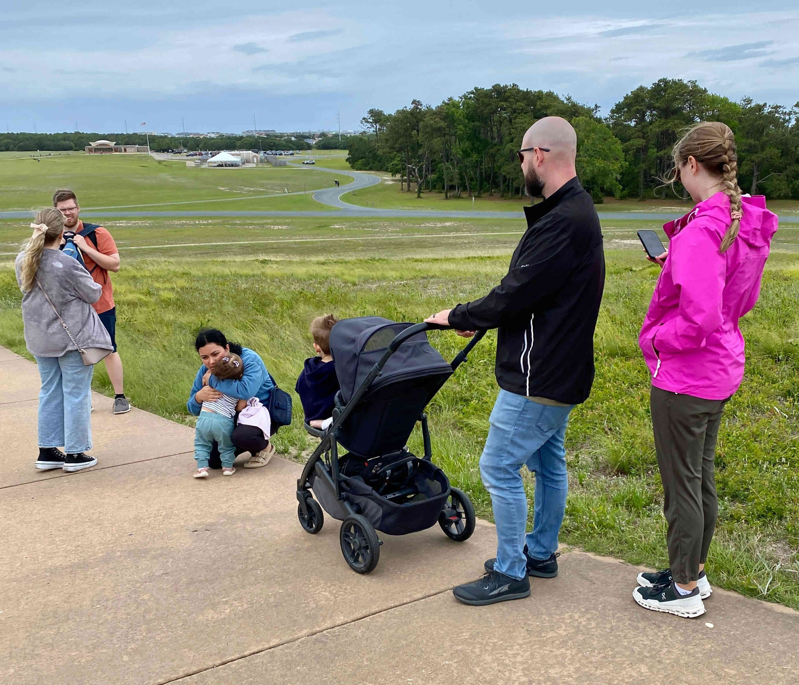 Re-grouping before walking the grounds. The Wright brother's first flights were actually at "Kill Devil Hills" just south of Kitty Hawk. Although they were from Dayton, Ohio, the brothers chose Kill Devil Hills because of the consistent winds, soft, sandy landing surfaces, and relative isolation without interference or scrutiny from the public.