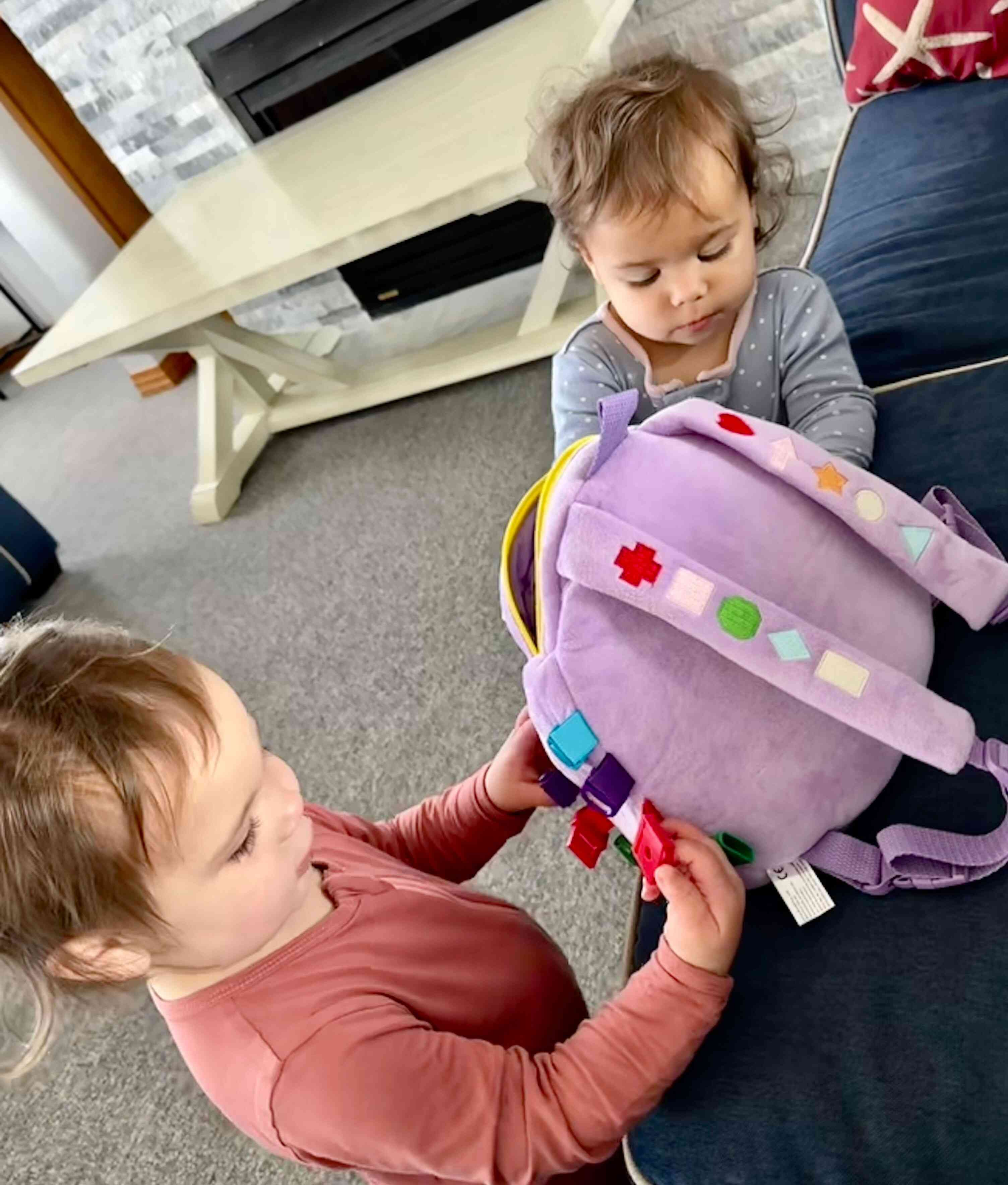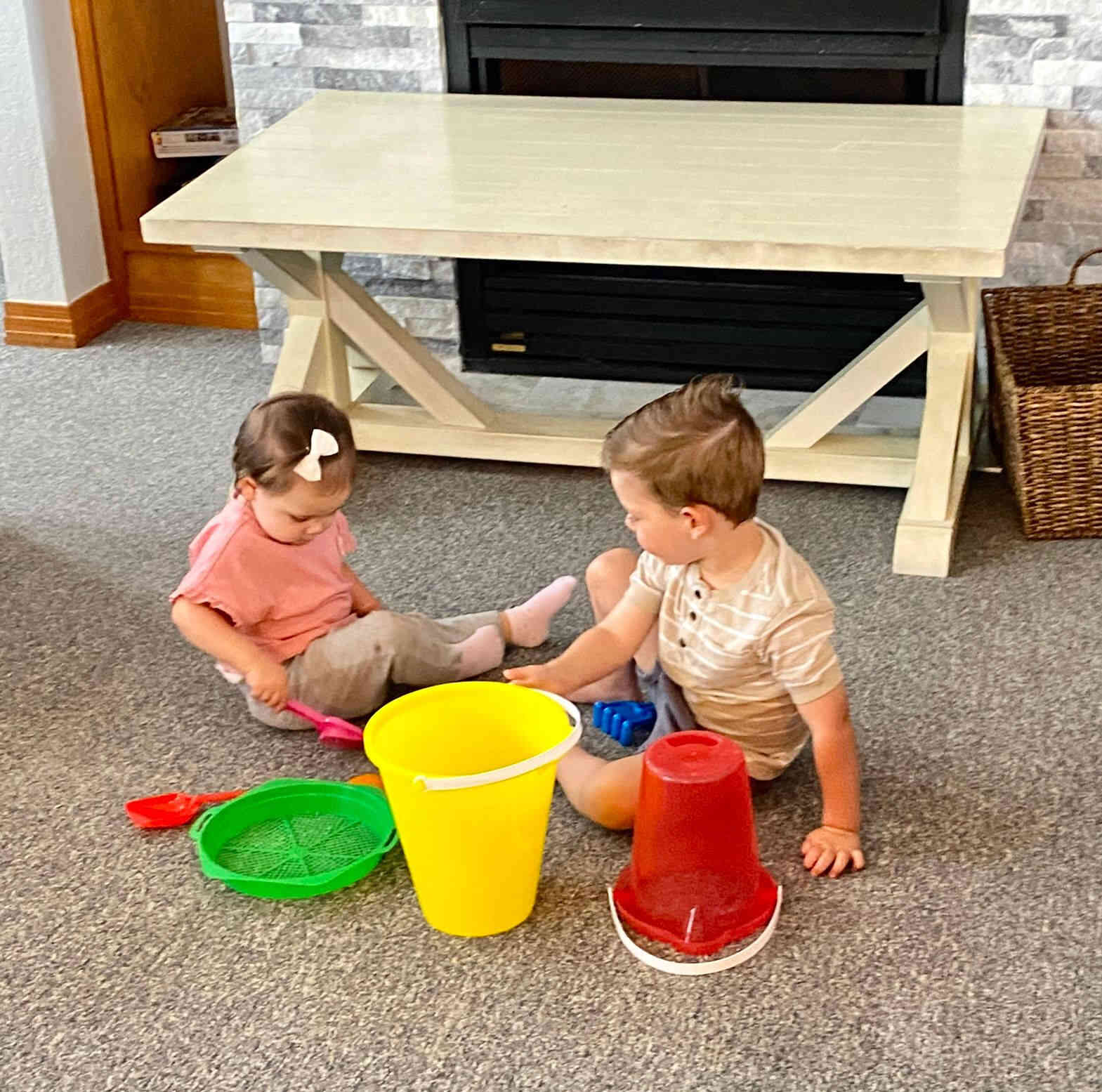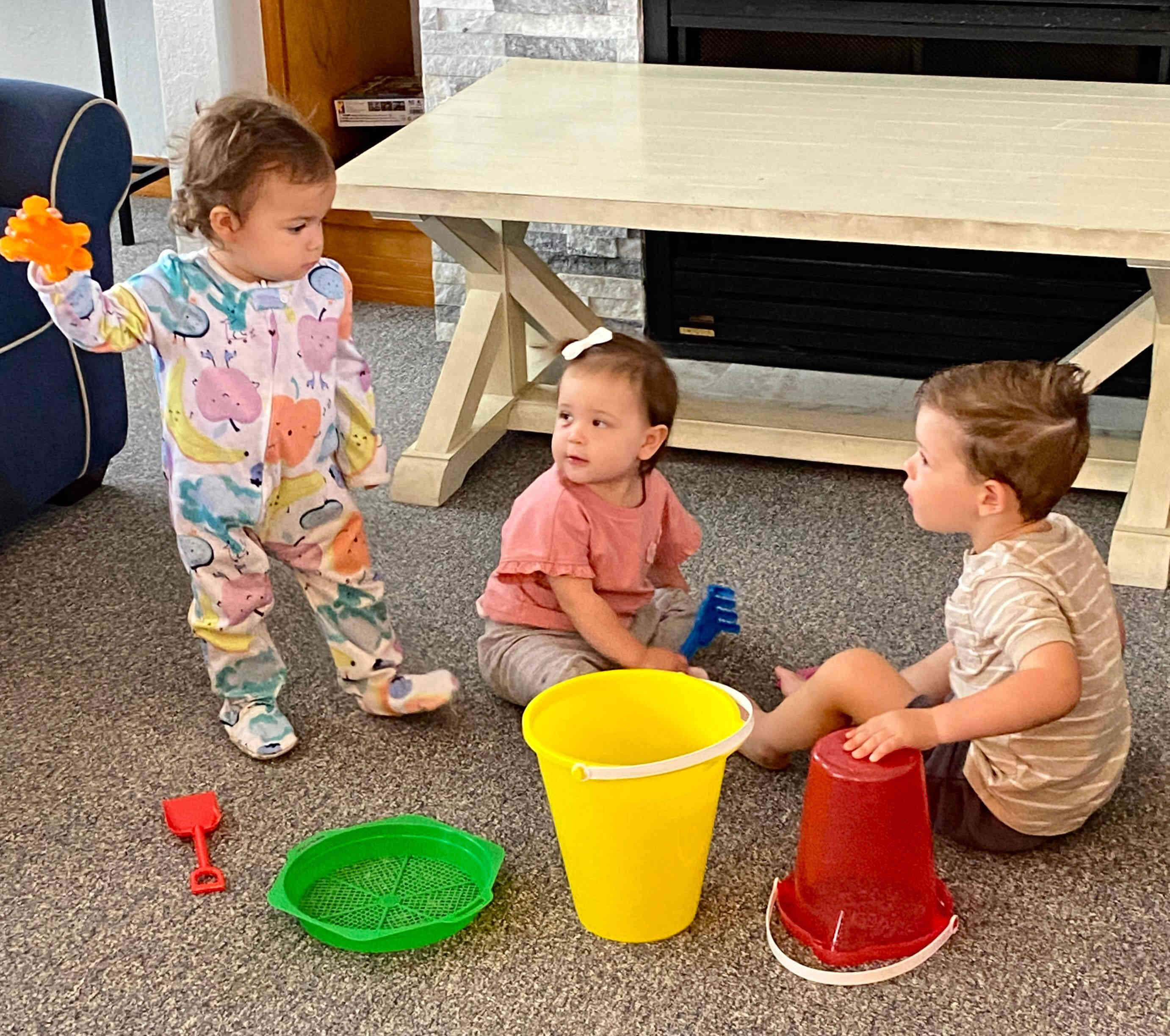 The kids playing with their beach toys inside.