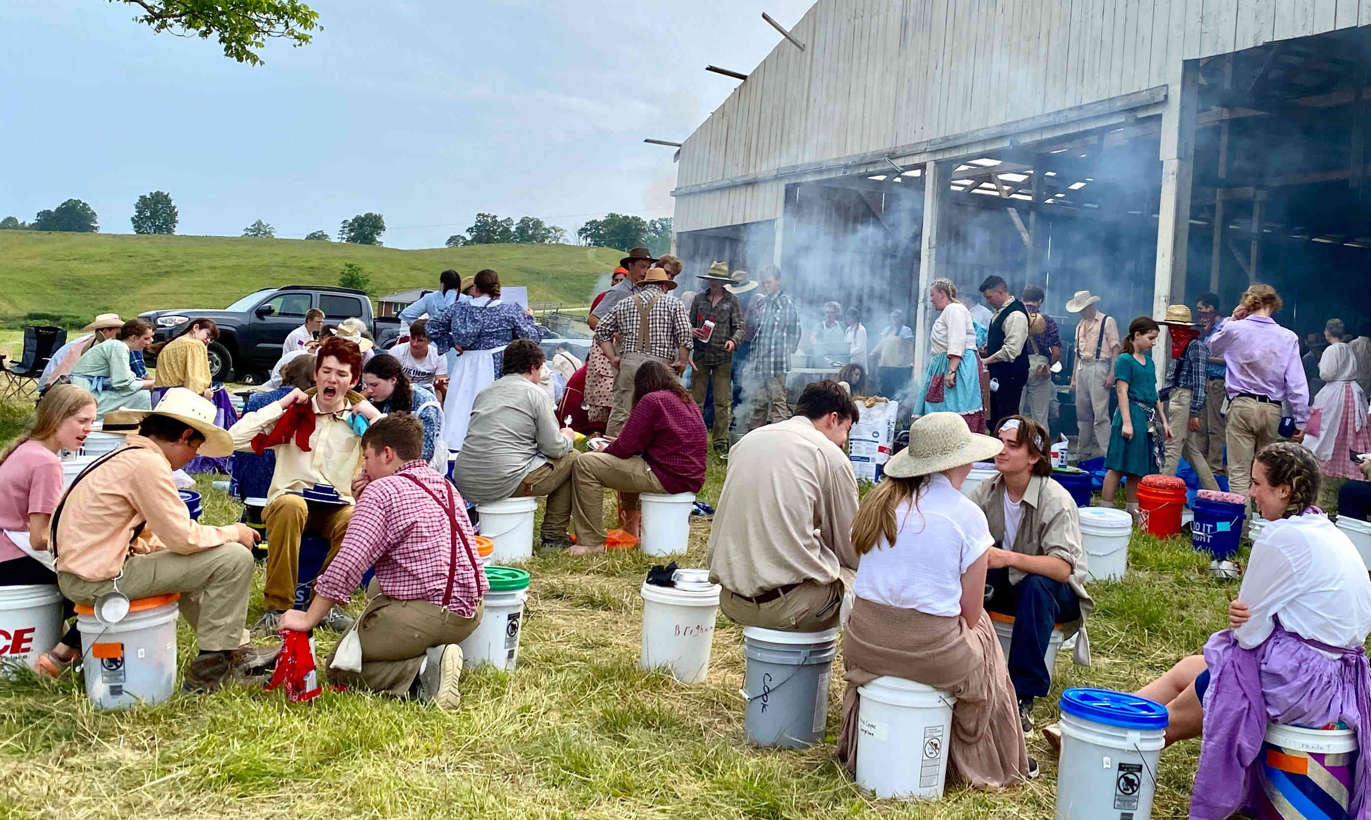 The kids packed their belonging into a 5 gallon bucket (which would also serve as a seat) which were than placed on the handcart. Pioneer clothes only and absolutely no phones! I thought it couldn't be done, but I did not see one phone, from any of the youth, the entire Trek!