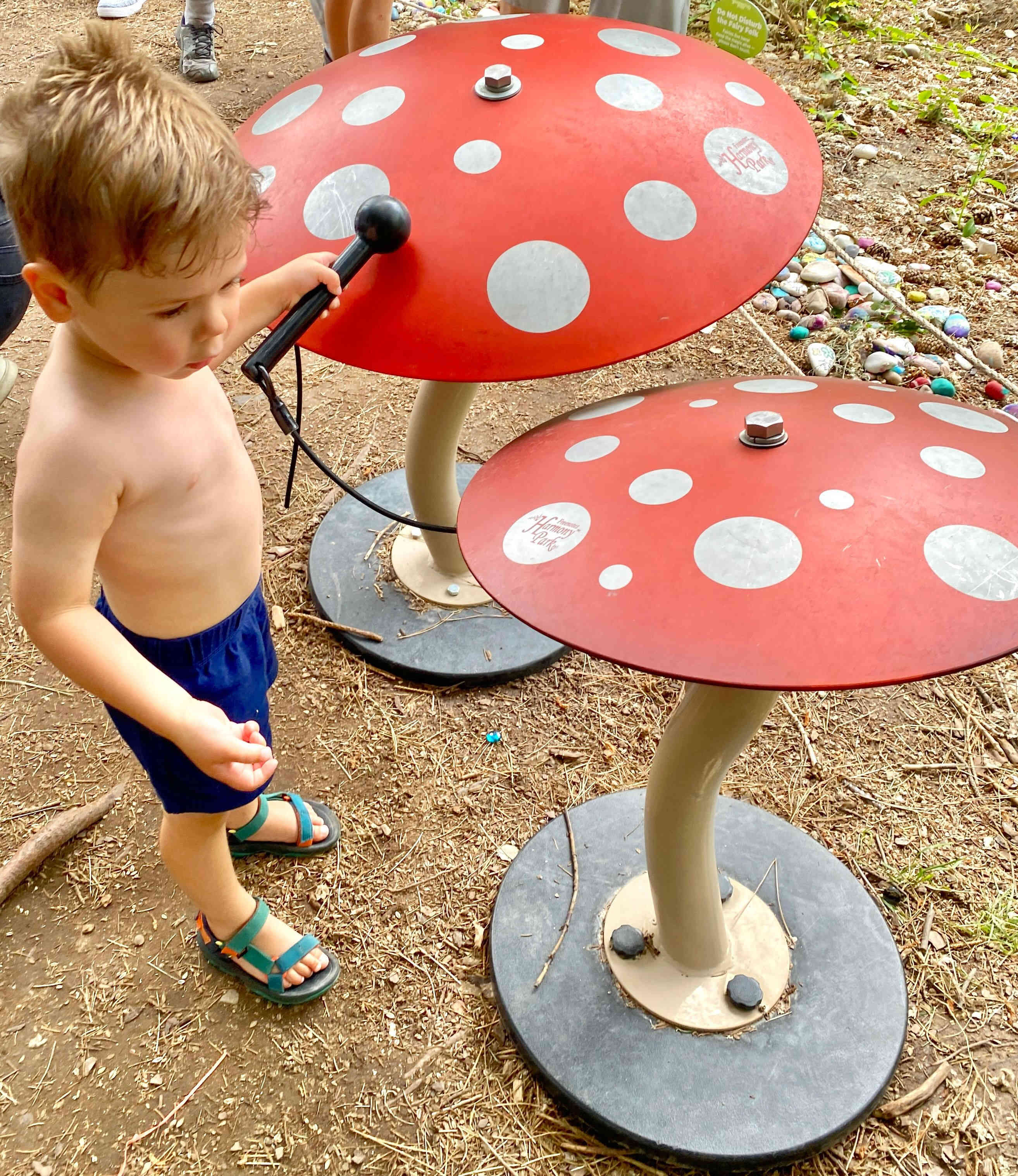 Mushroom drums that really vibrated sound! Finn wanted to stay longer and play on the huge pirate ship, but he started to melt down when he couldn't find his way out of the blow-up castle! So we compromised on the sand box with construction trucks, which was on our way out of the park.