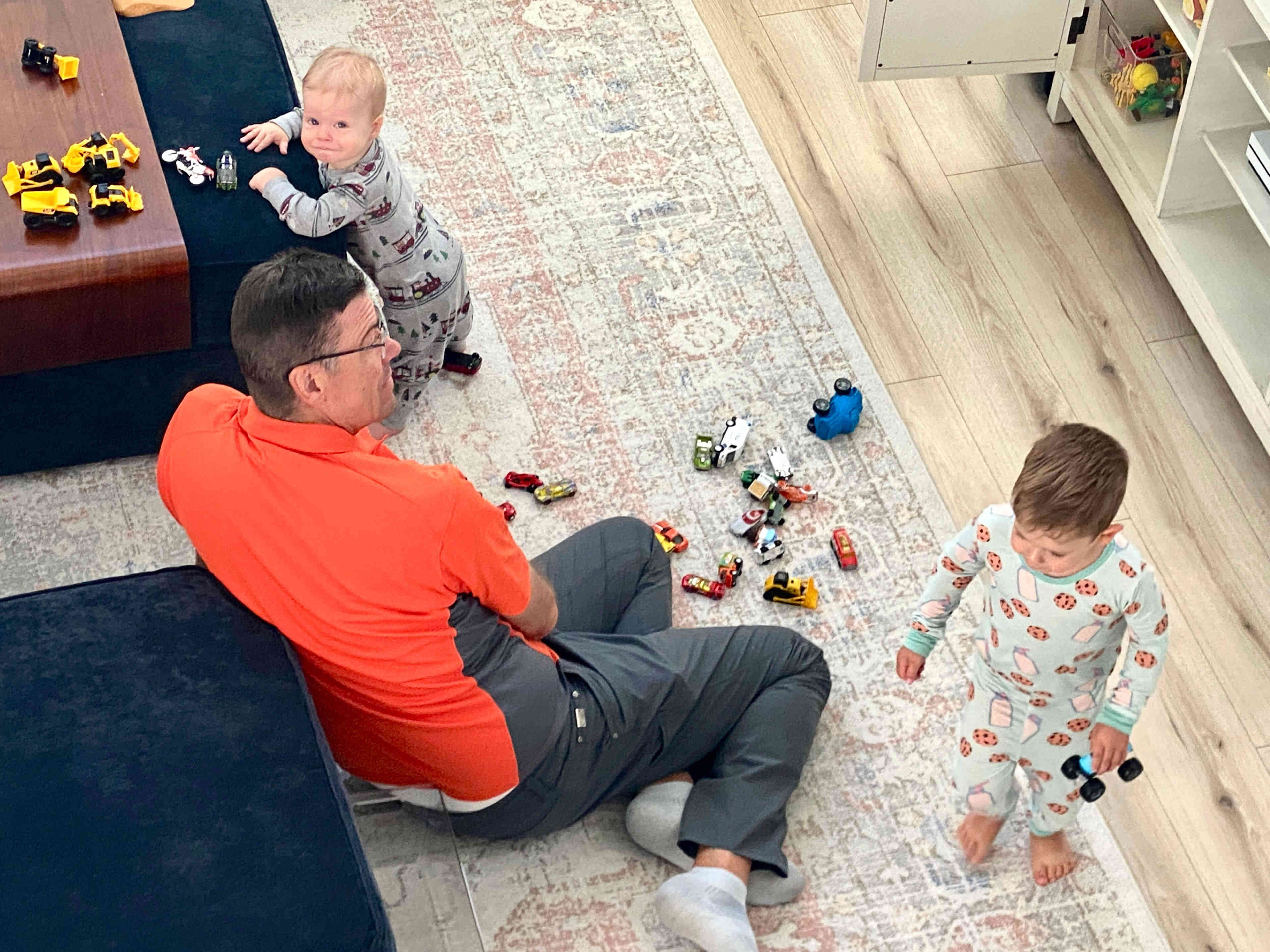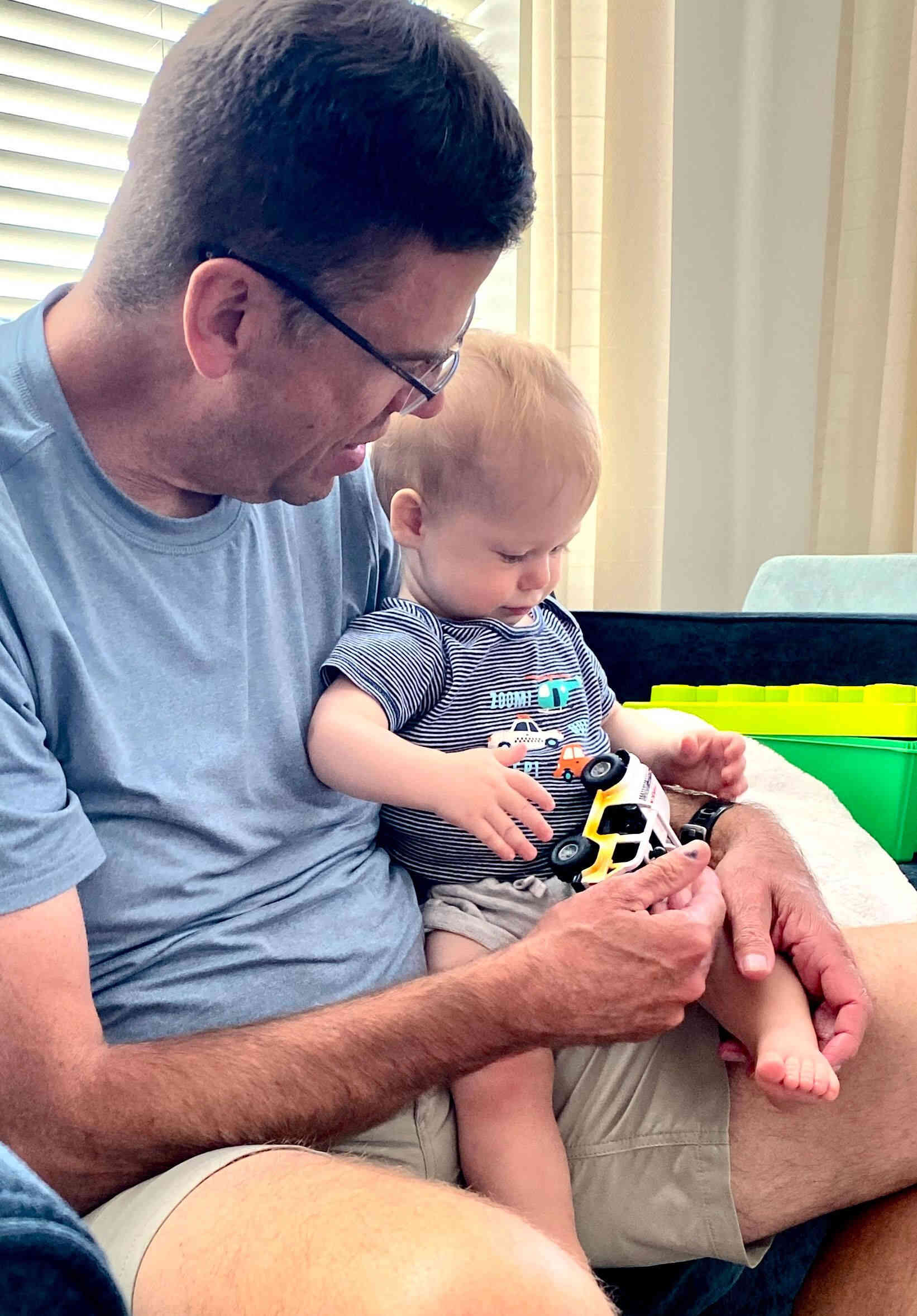 Playing with Finn's favorite toys --his cars and trucks