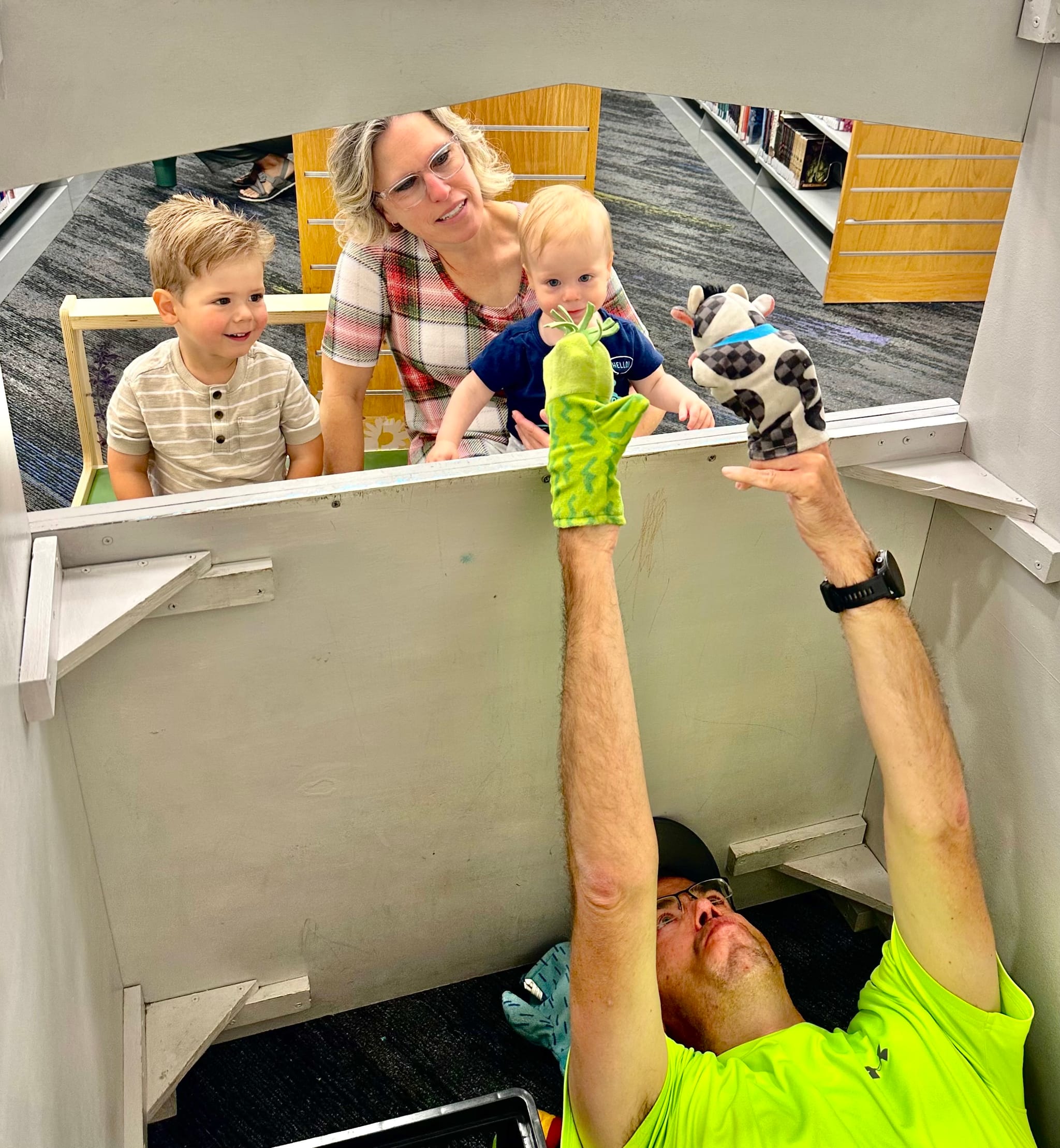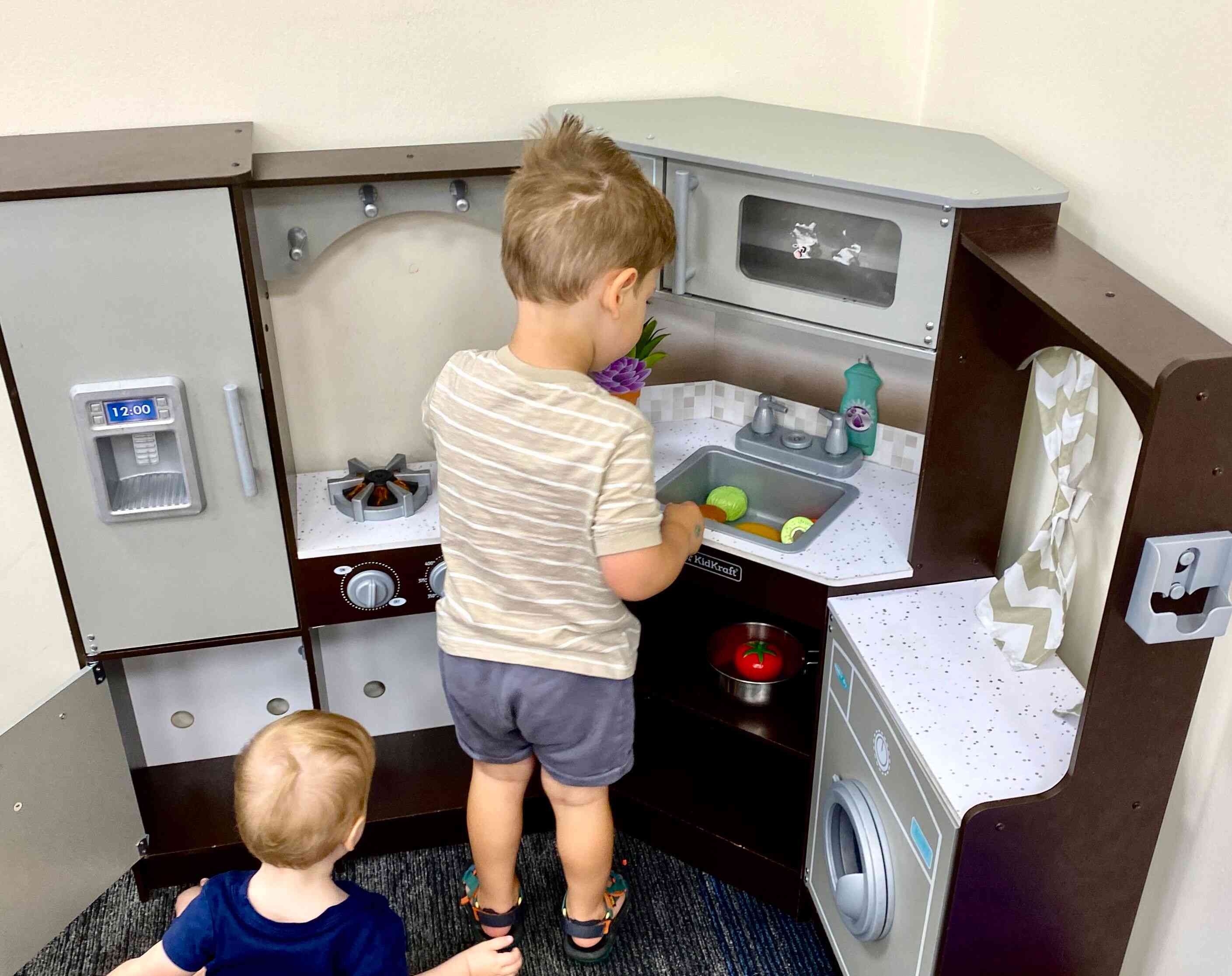 After participating in story time at the local library, we played with the boys as they spent time in every kid area of the library! One of their favorites was the toy kitchen area, where Finn made some delicious food (and he should know since his dad has been a good example as the primary cook of the house!).