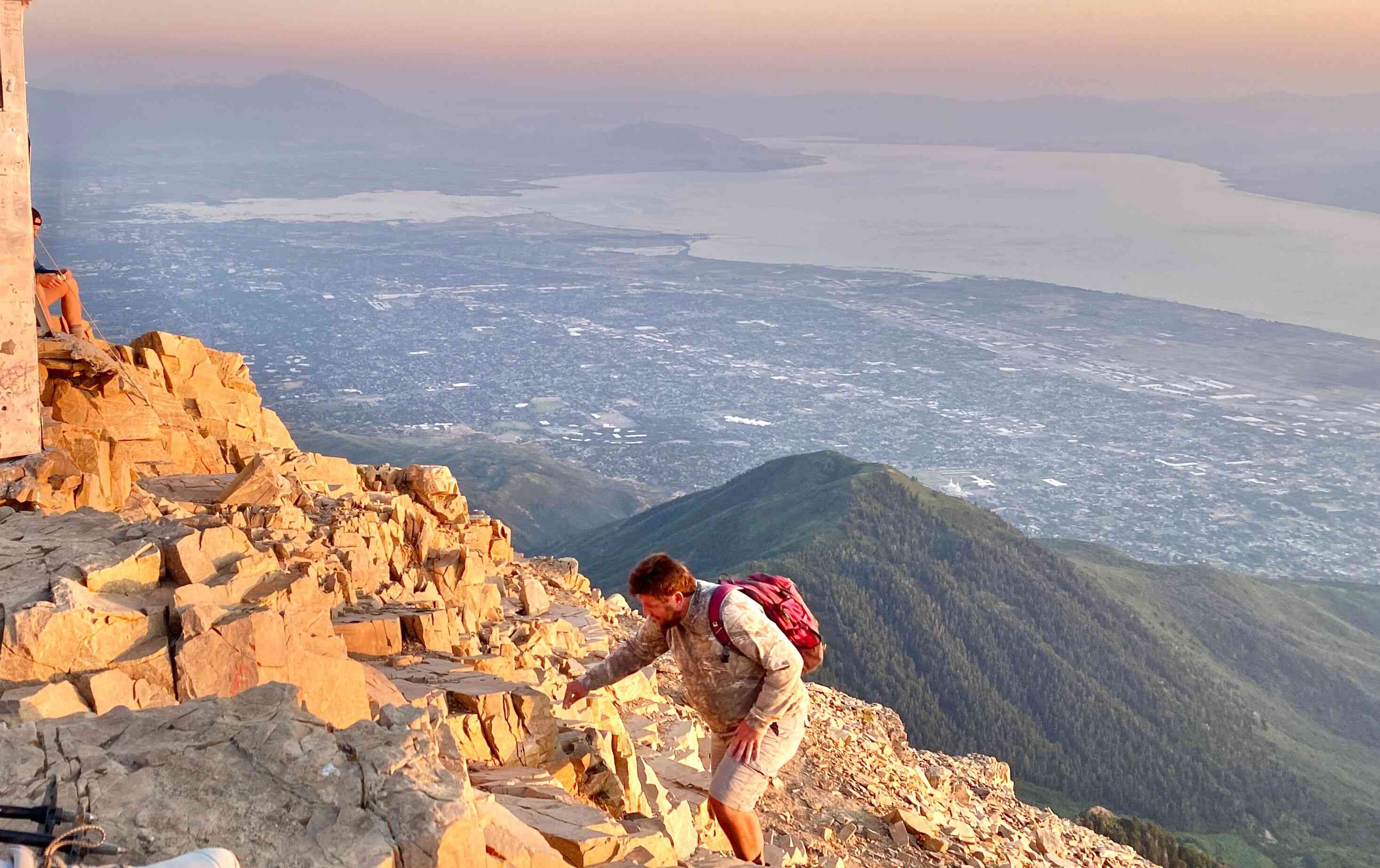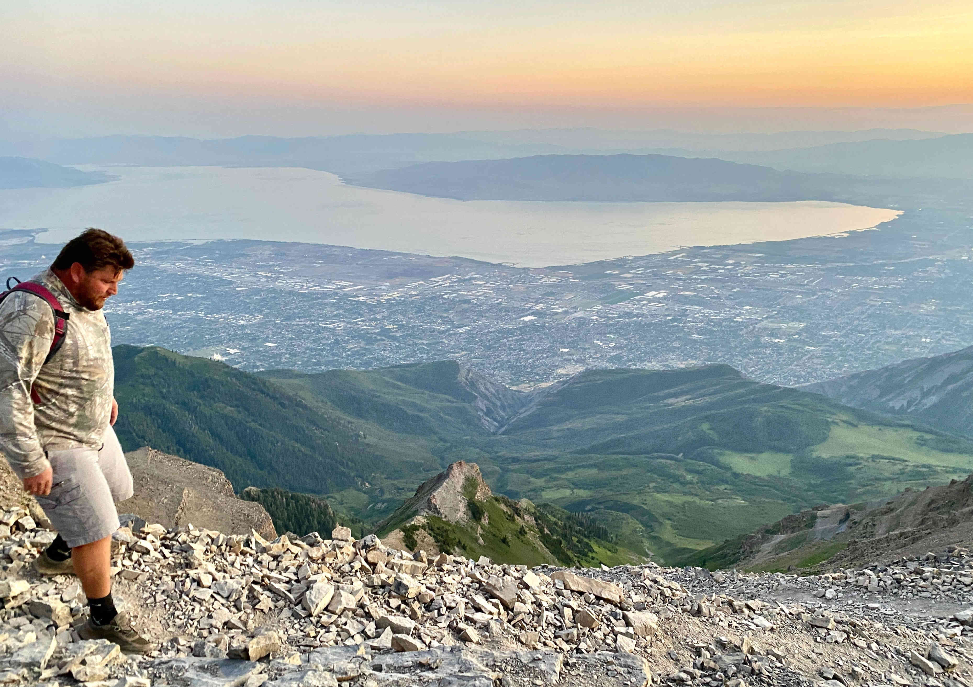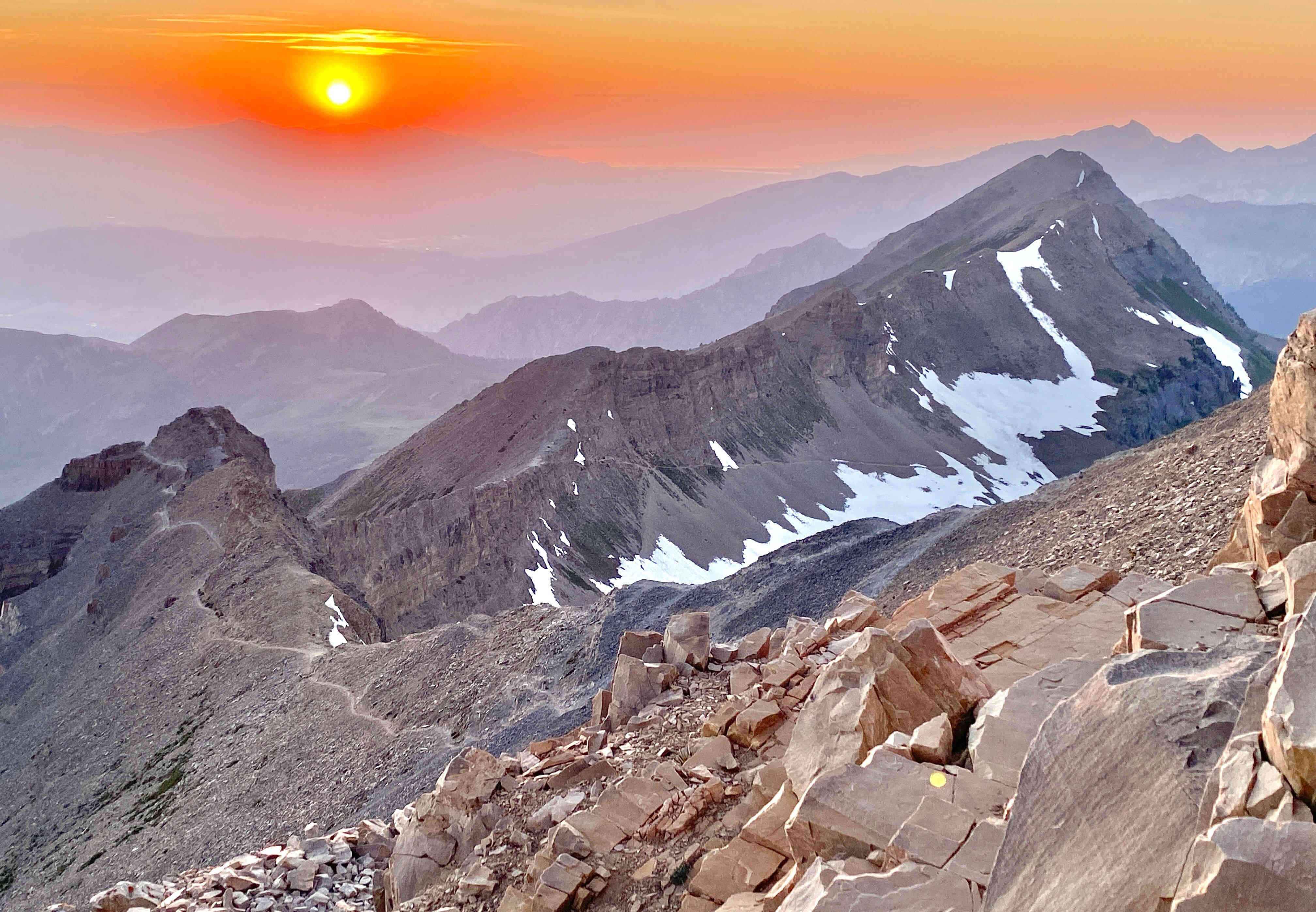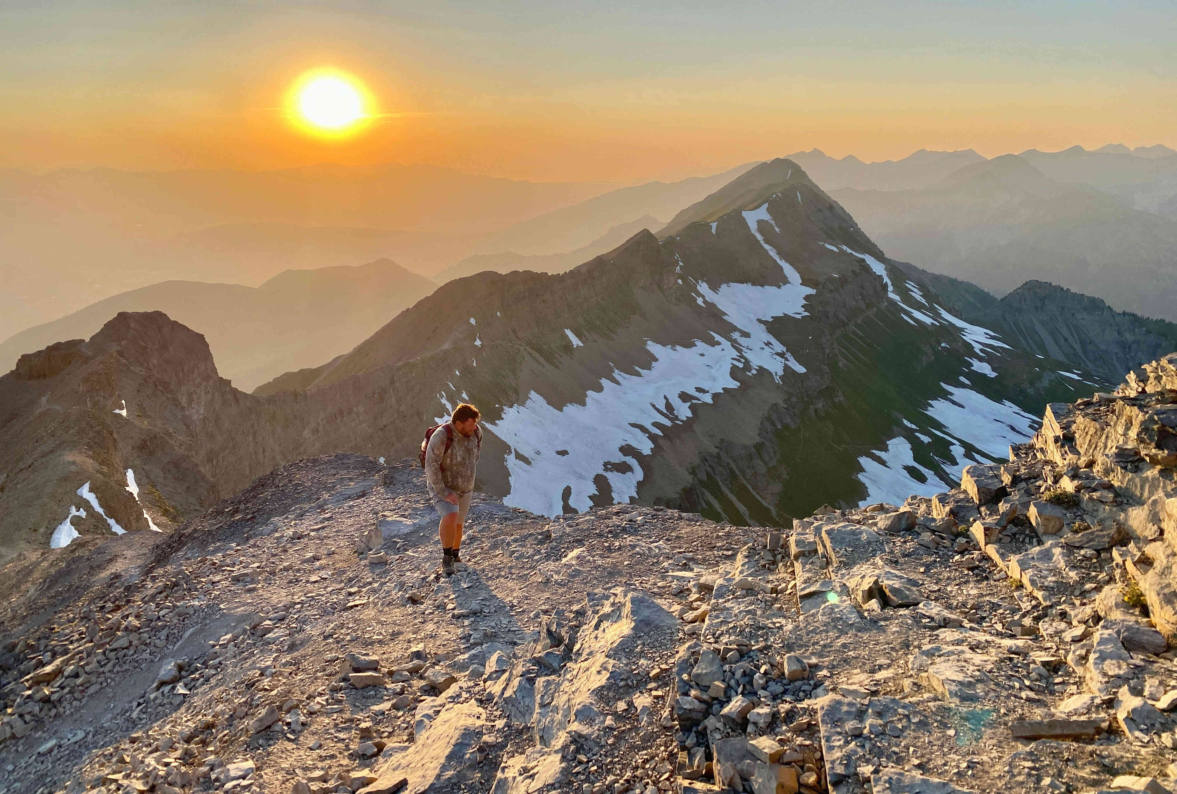 Brad making his way down the loose rock with his hiking sticks. Matt and I regret leaving our hiking sticks on the saddle and not using them to summit! Half way between the summit and the saddle, the sun made its final decent behind the horizon!