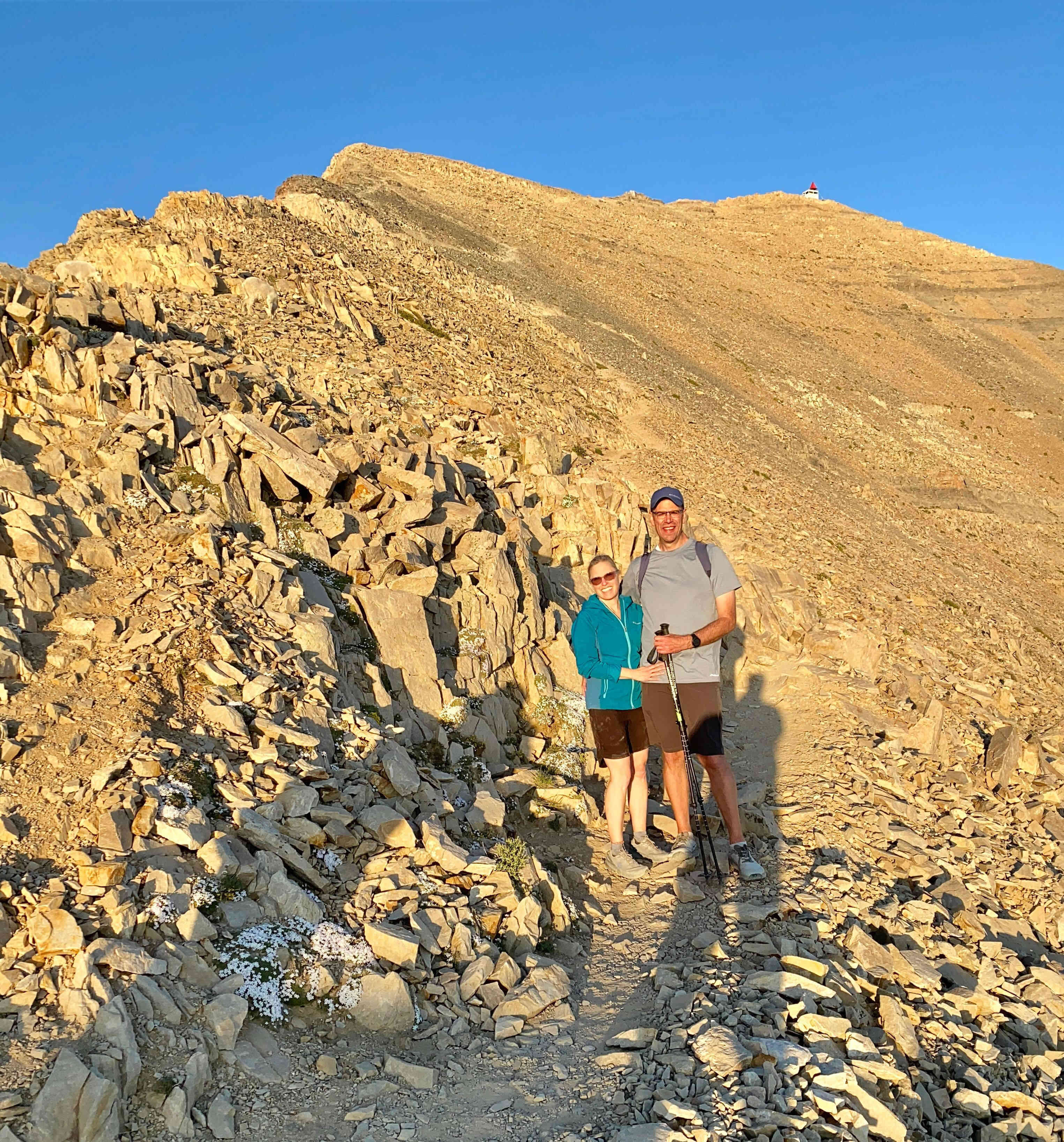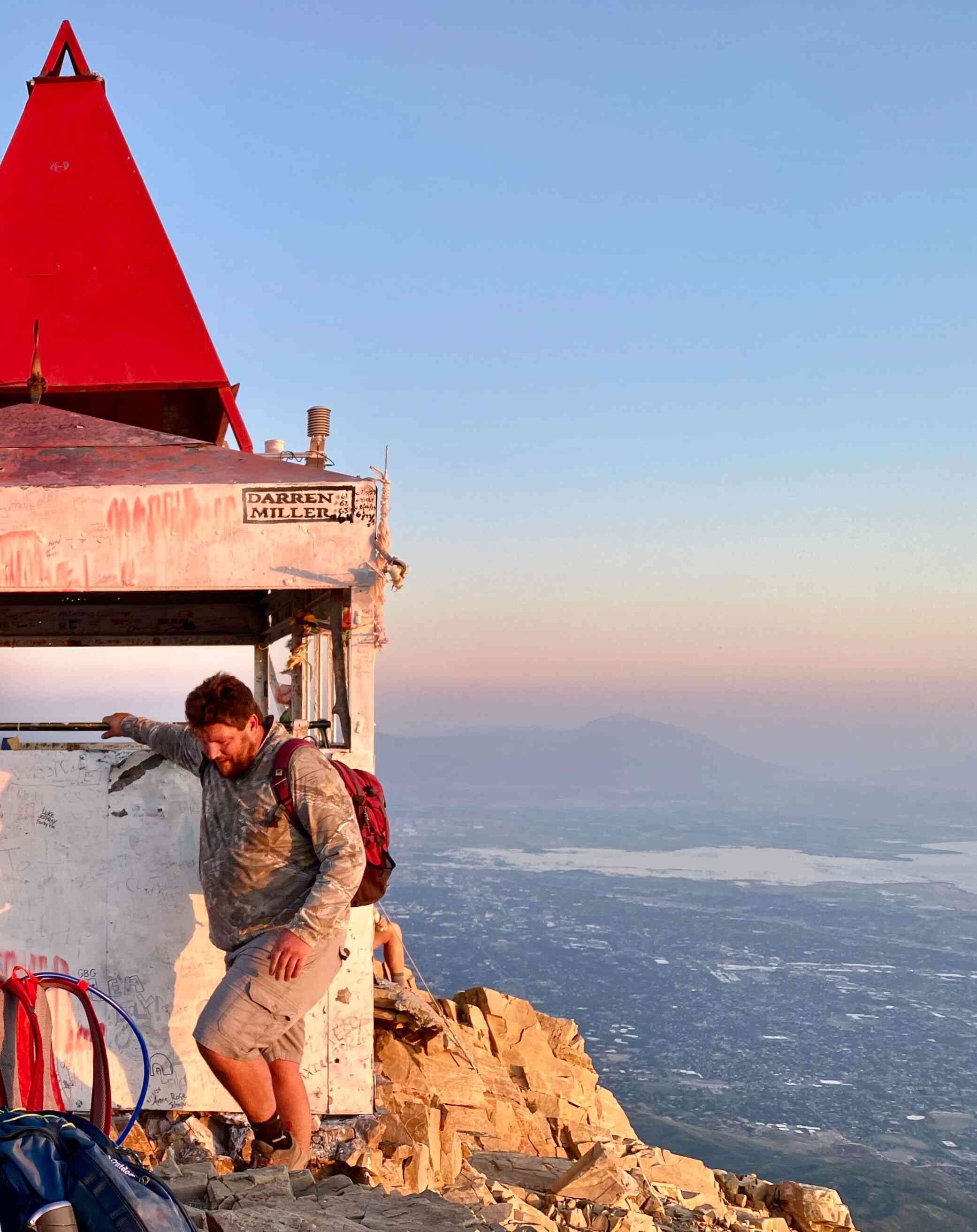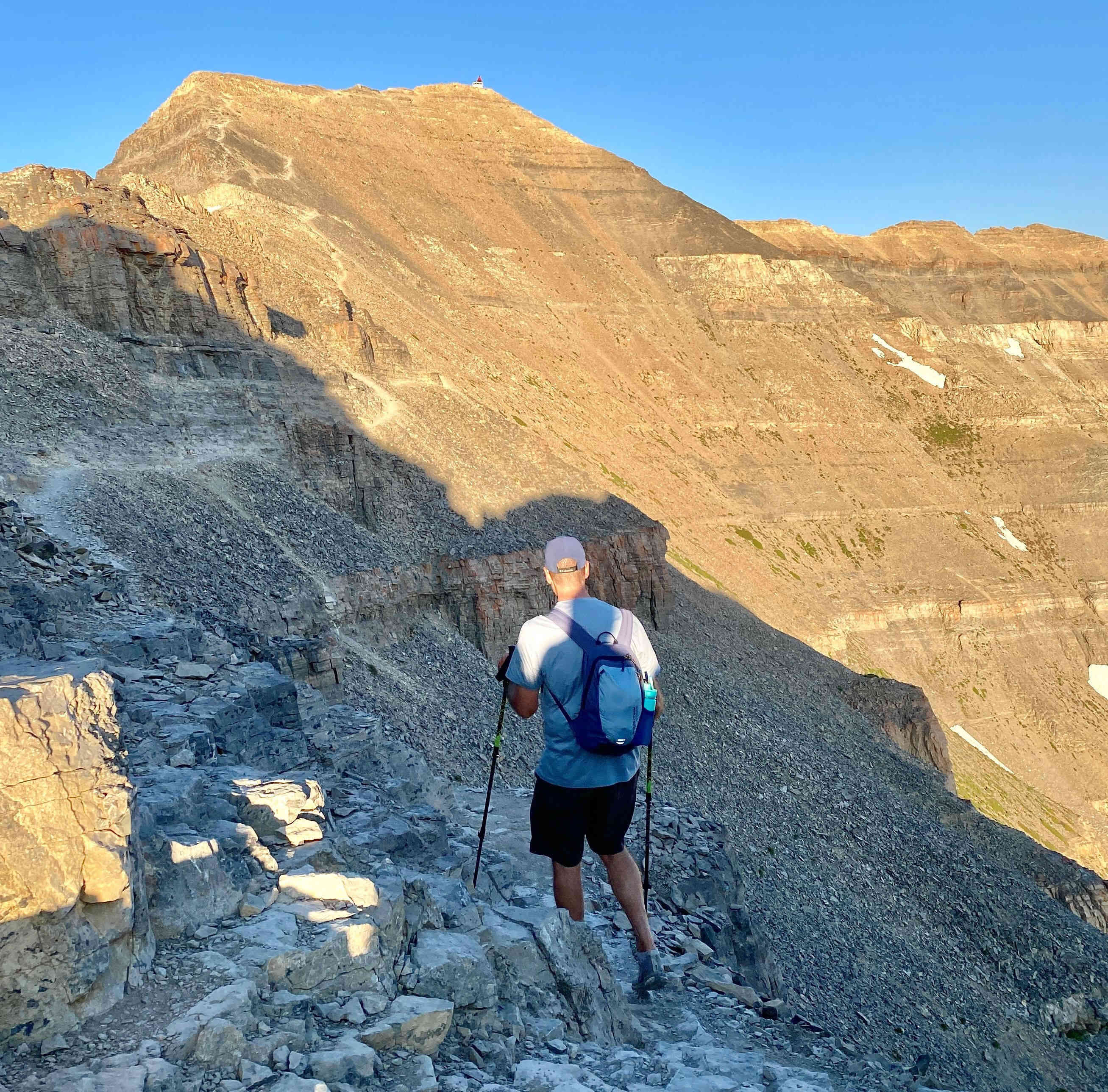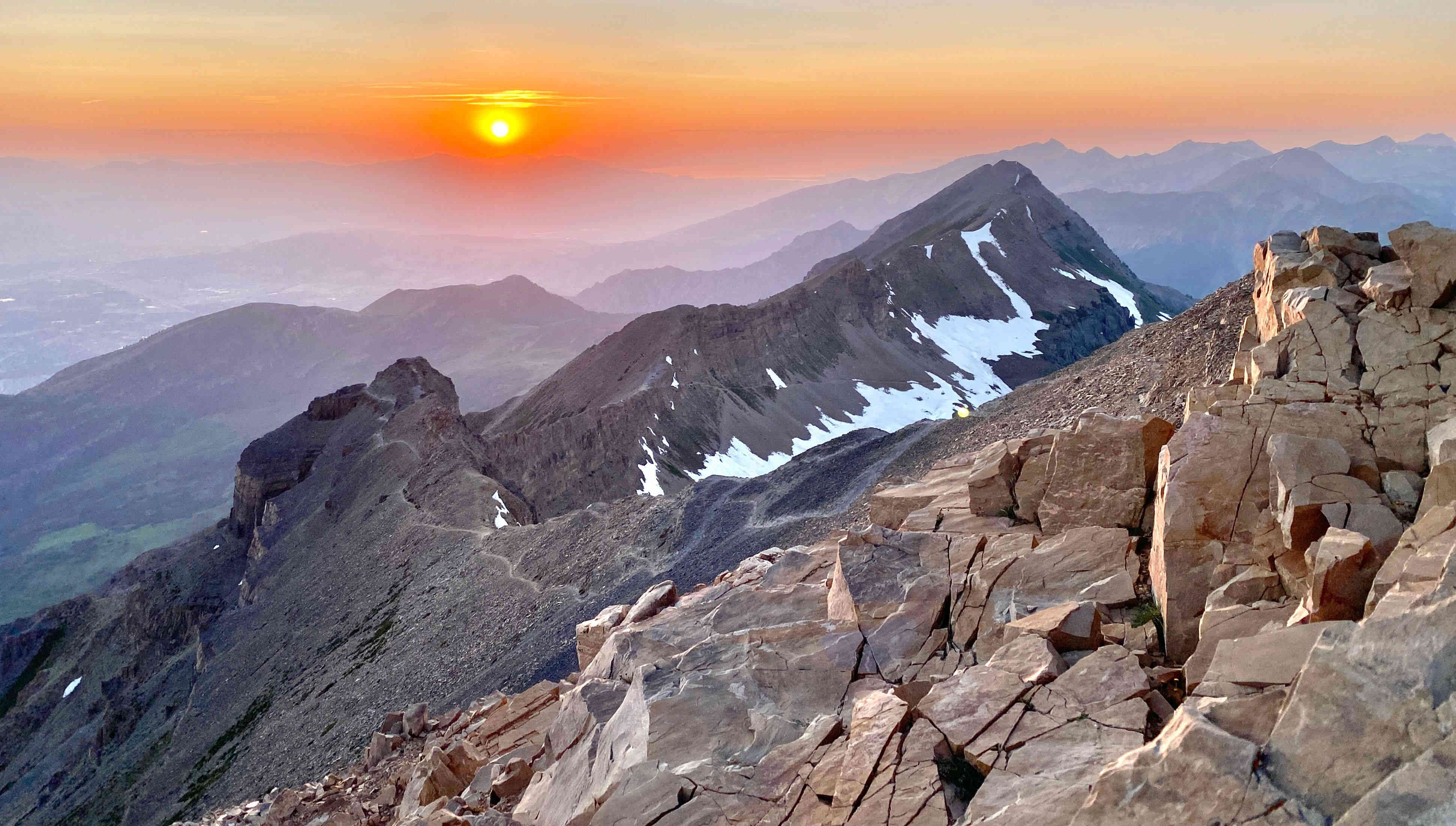 Brad making his way down the loose rock with his hiking sticks. Matt and I regret leaving our hiking sticks on the saddle and not using them to summit! Half way between the summit and the saddle, the sun made its final decent behind the horizon!