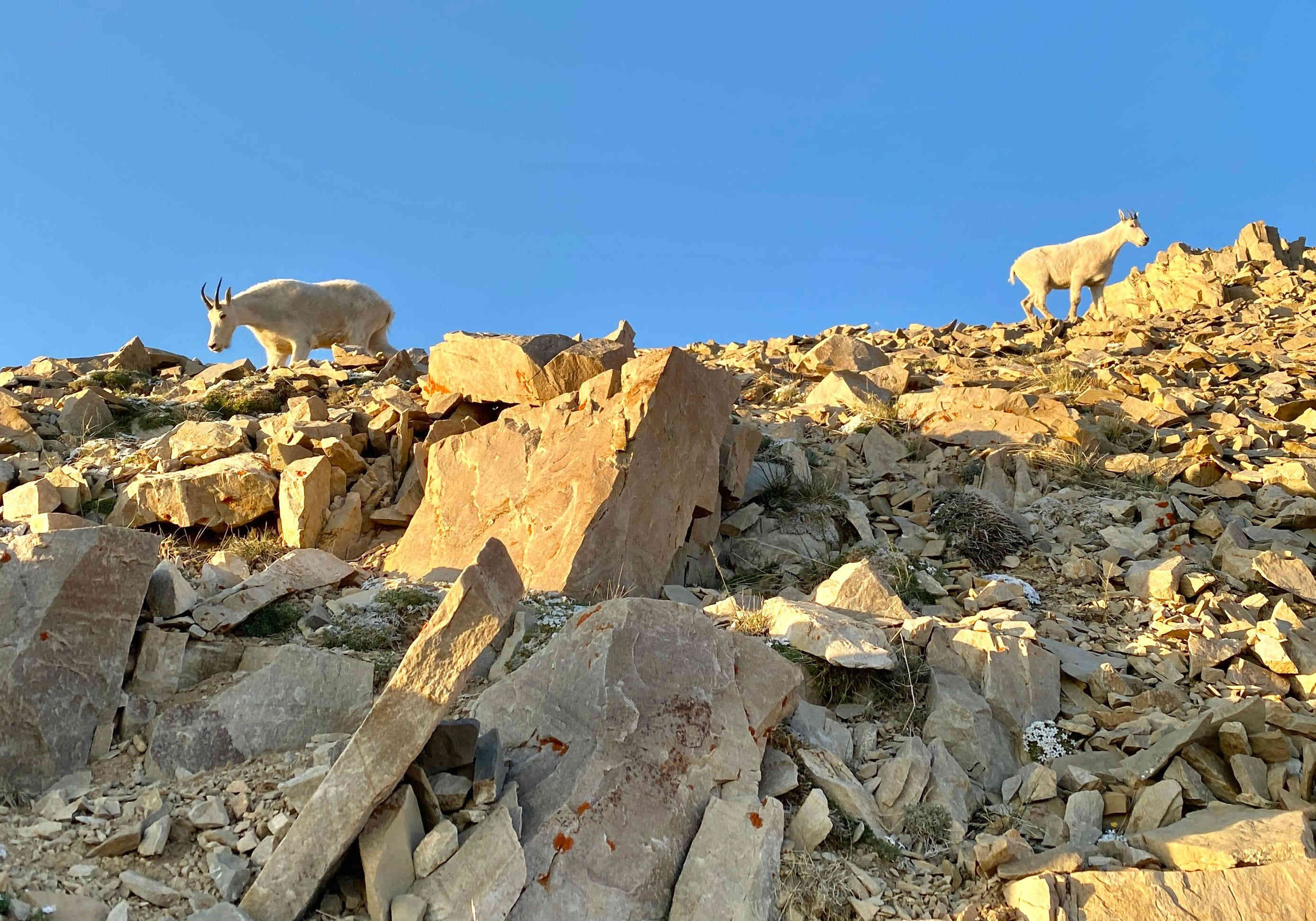 Halfway between the saddle and the summit we ran into more mountain goats, which you can barely see in this pic because they blend in so well!