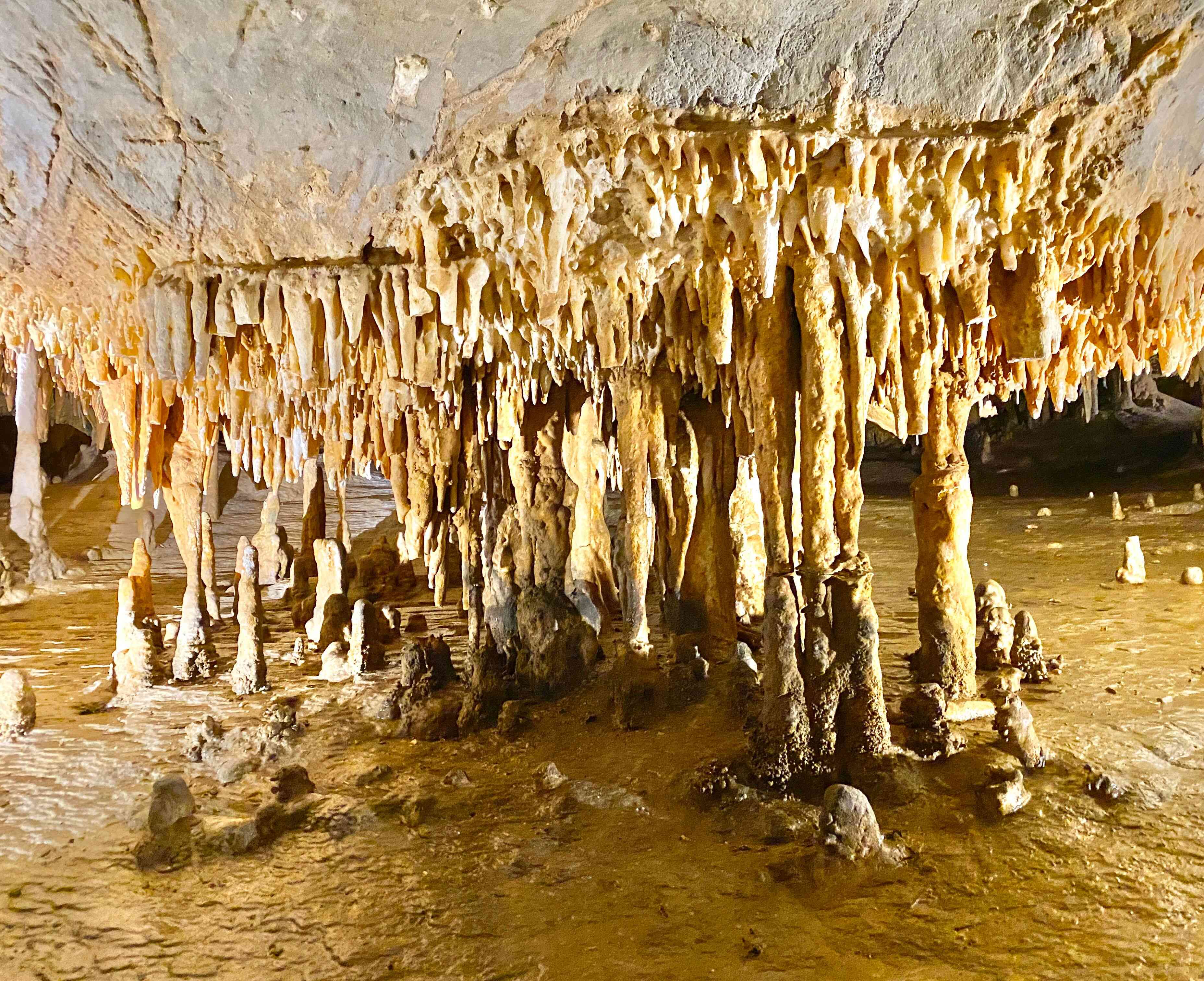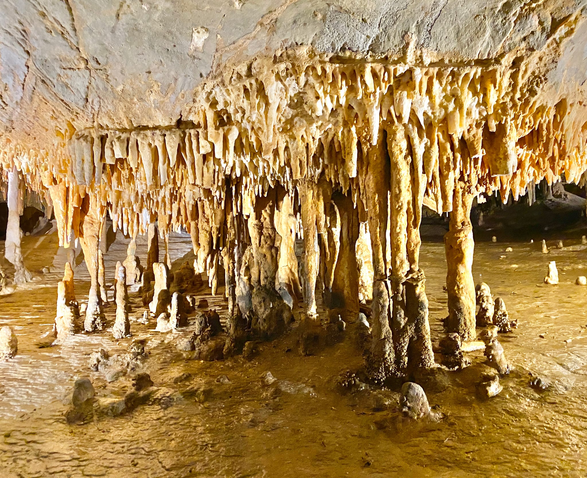 And how are these amazing formations made? As water drips into the chambers of the cave it crystallizes creating stalagmites (upward protruding formations from the floor) and stalactites (formations hanging from the ceiling). Cavern formations grow at the rate of one cubic inch every 120 years!