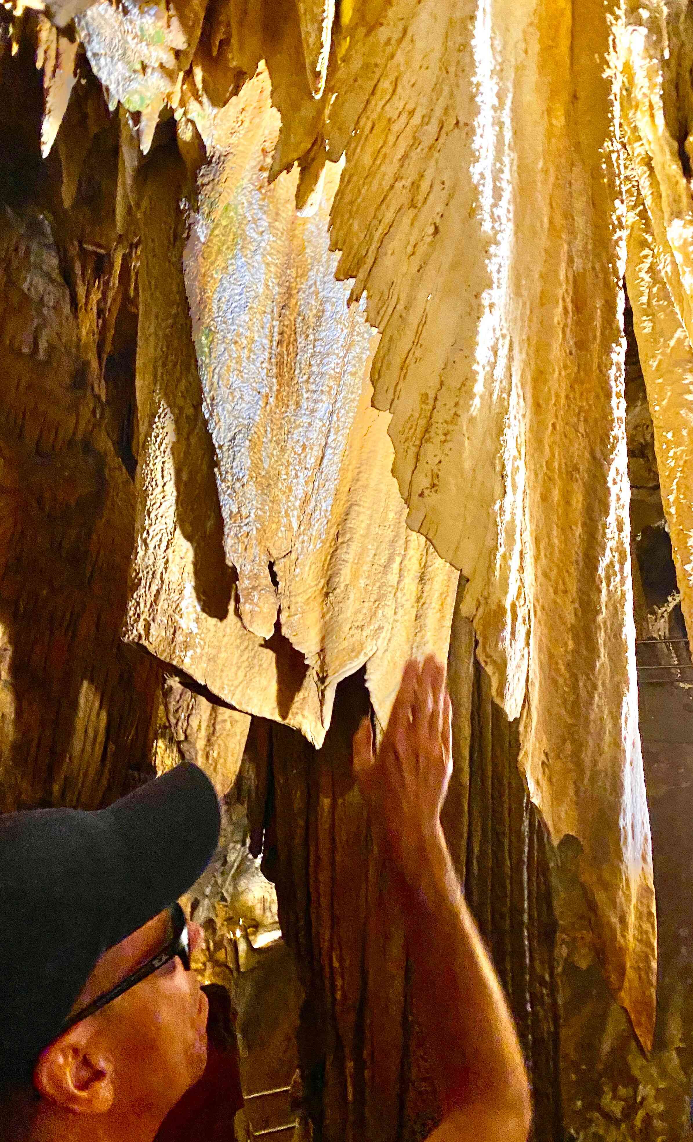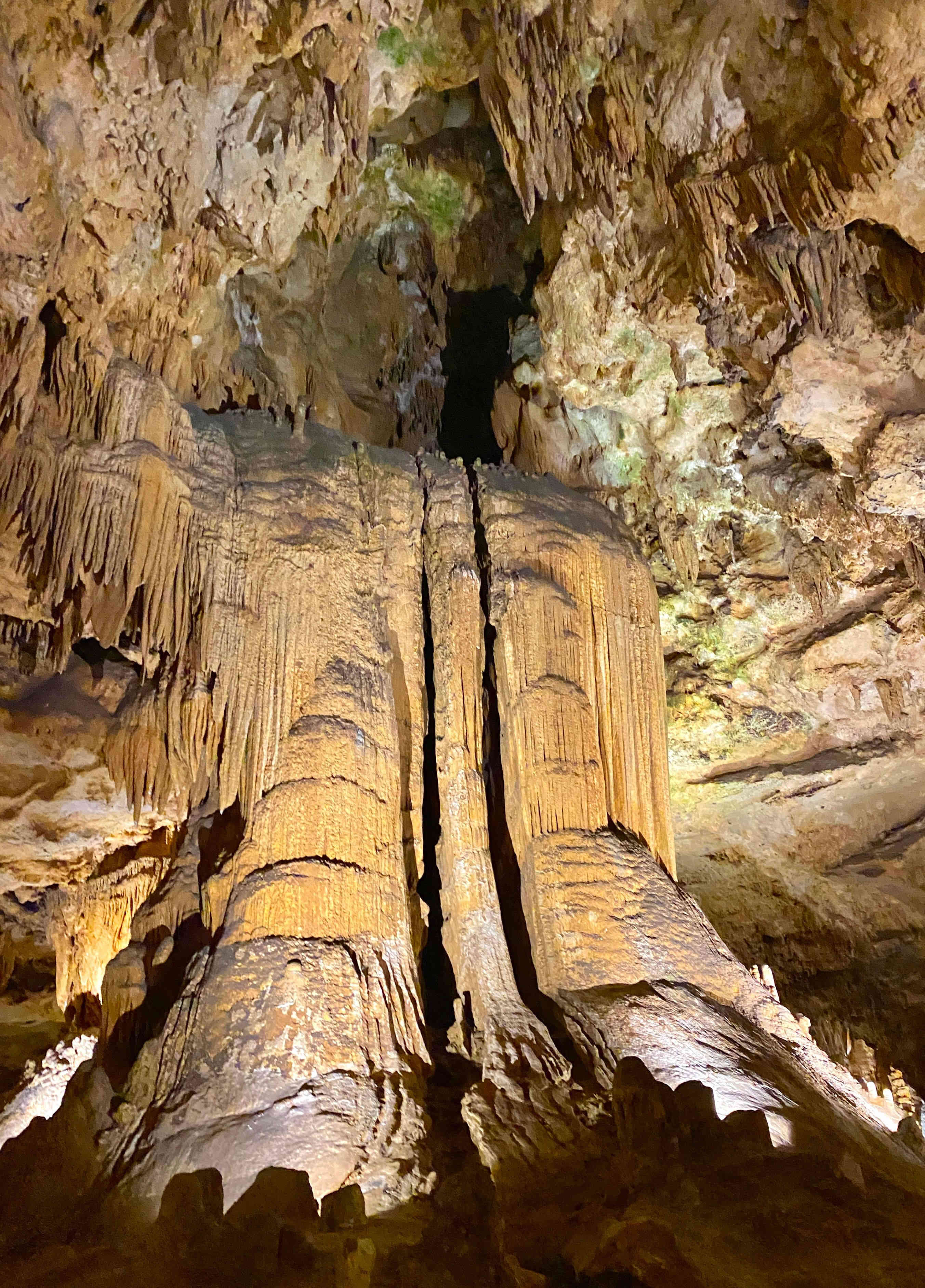 Fallen Stalactite: this massive stalactite fell from the ceiling during a large earthquake and then over time got reabsorbed back into another formation!