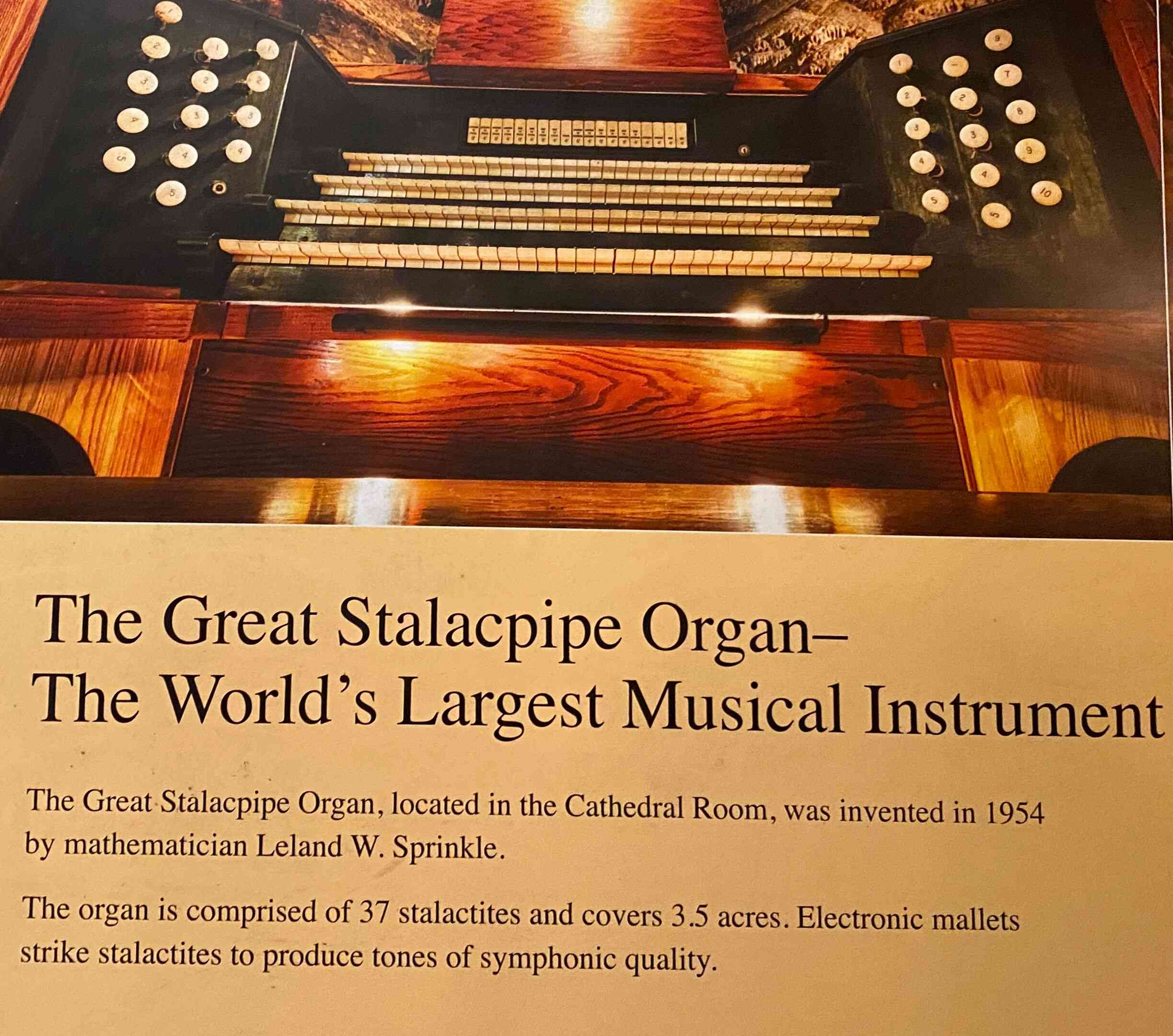 The Cathedral: housed the world’s largest musical instrument The Great Stalacpipe Organ: this fascinating creation is the work of Leland Sprinkle, who spent three years creating this natural organ. It literally makes stalactites sing by gently tapping them throughout three acres of caverns!