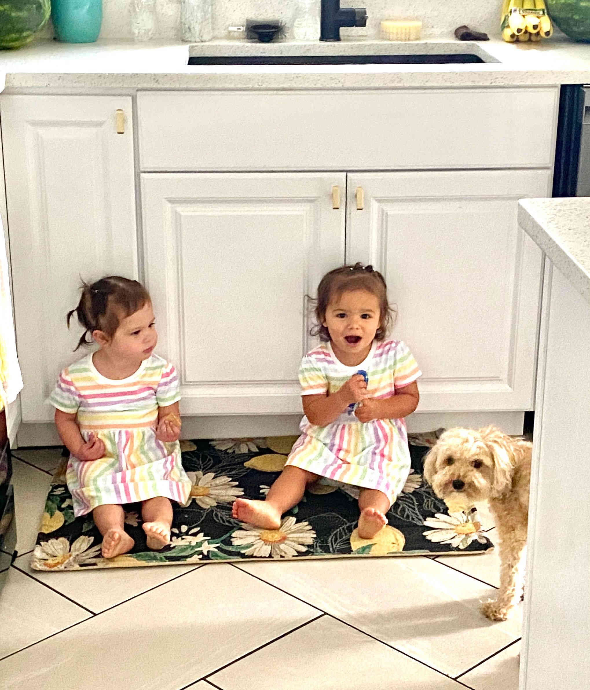 The girls entertaining themselves inside the house as well...sitting on the kitchen rug,