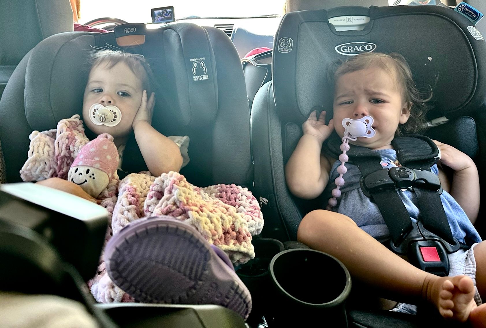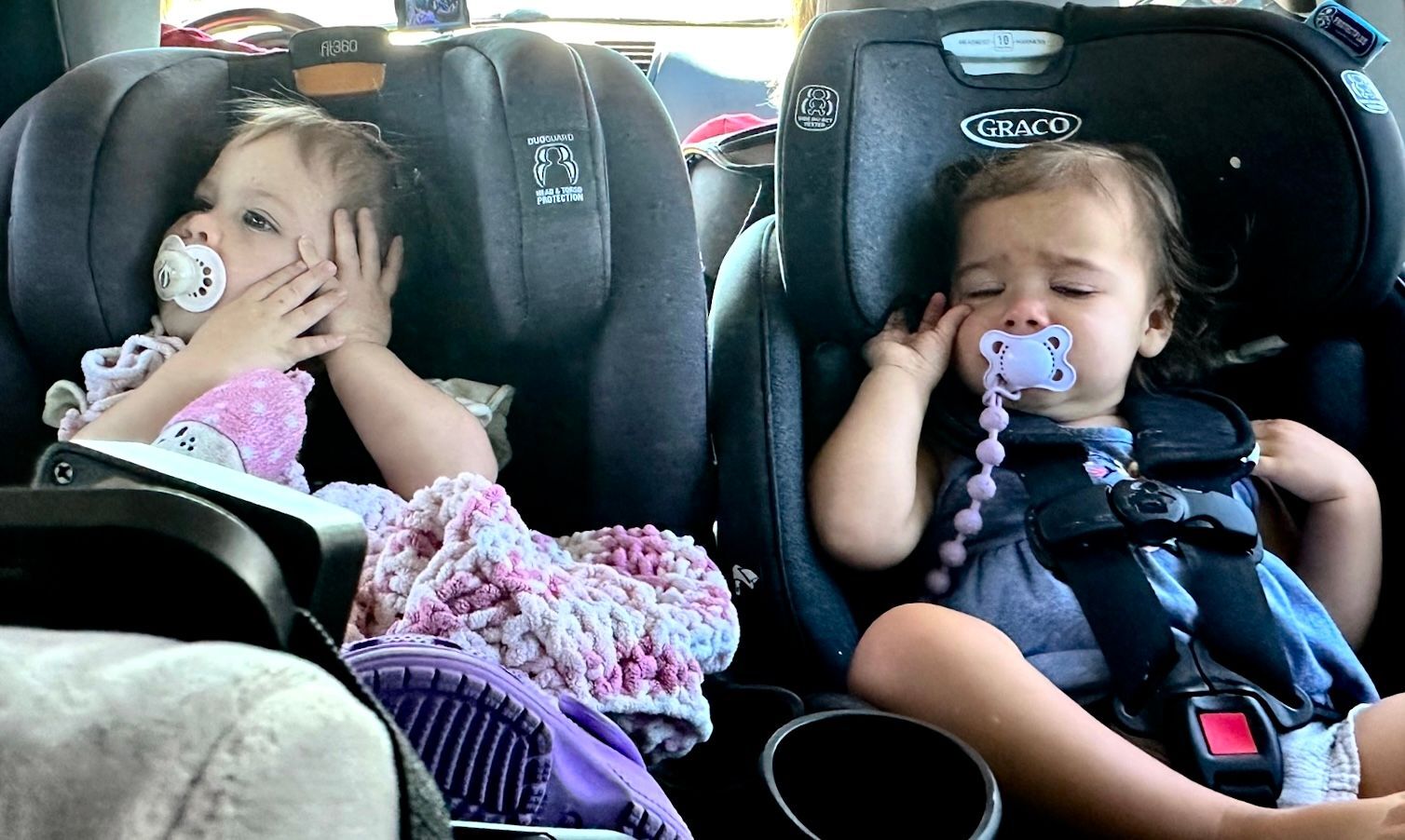 Because of our many day trips, the girls spent considerable time in their car seats. At first one or the other would cry (Claire trying to cover her ears while Camila is crying in the above pics)