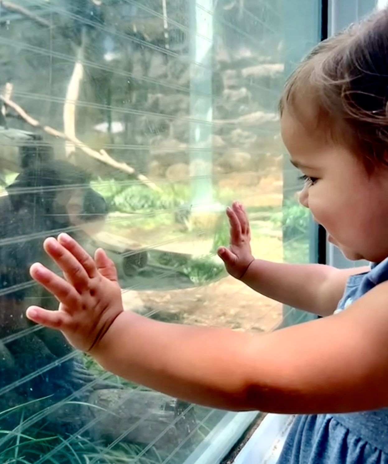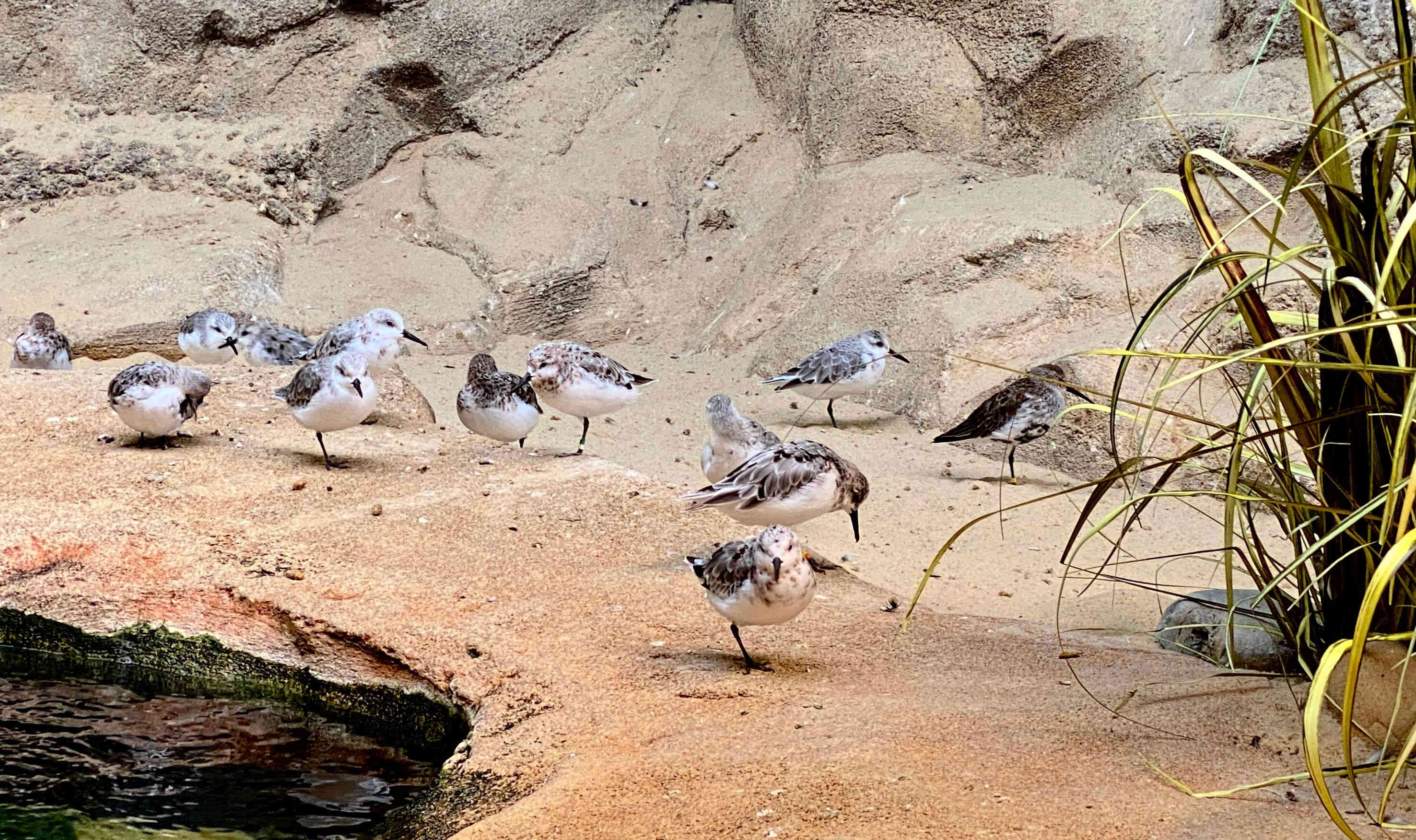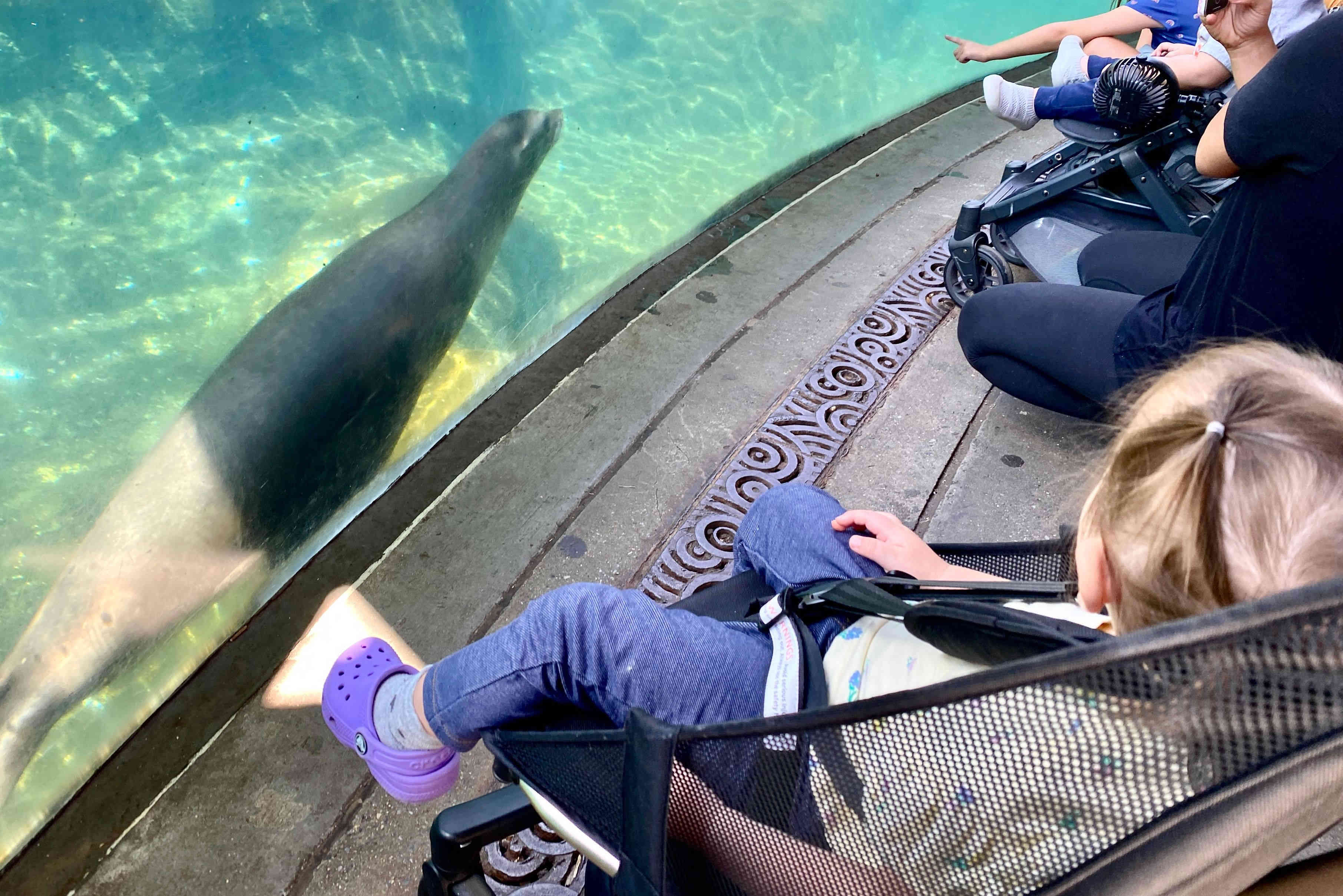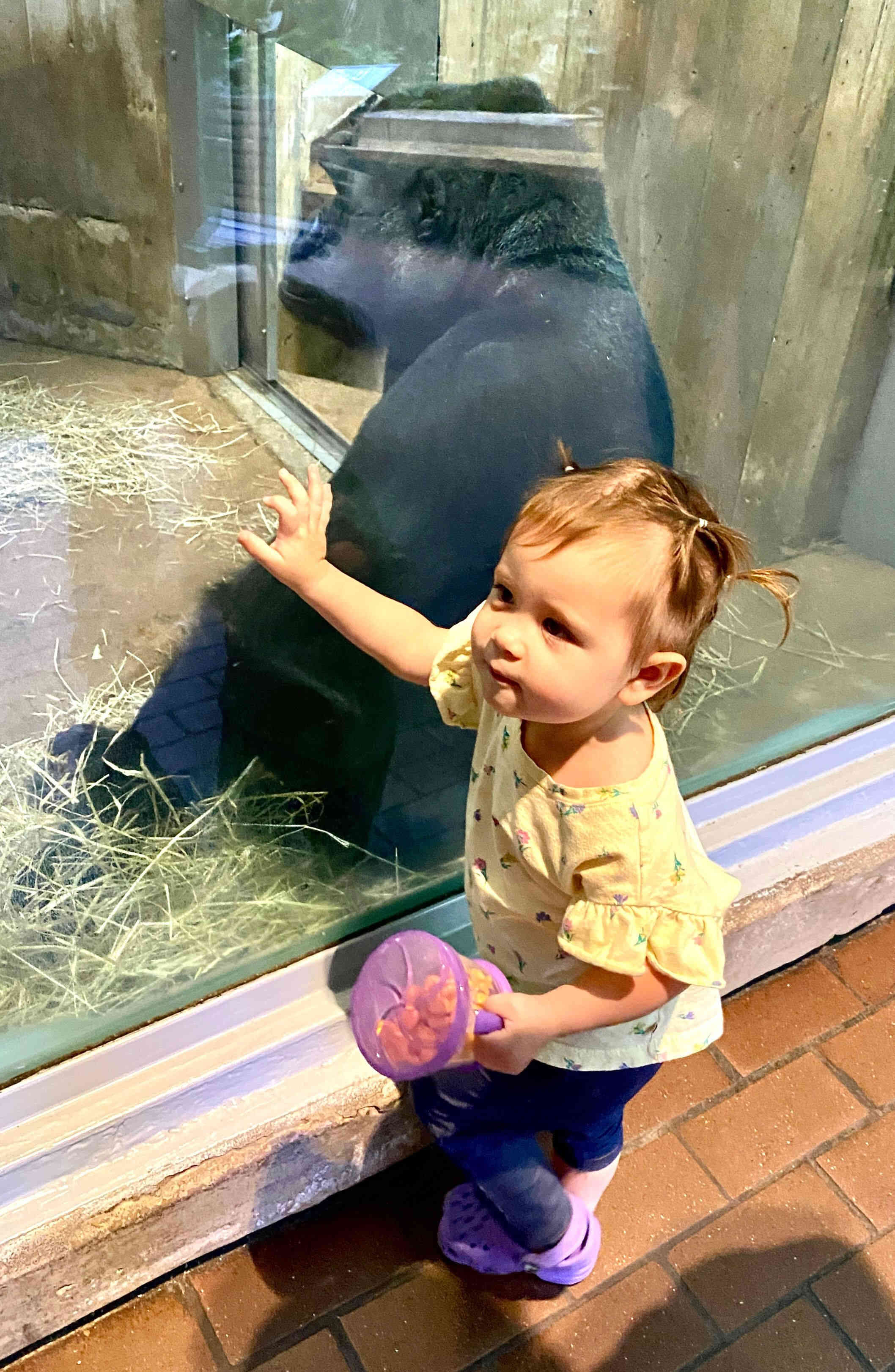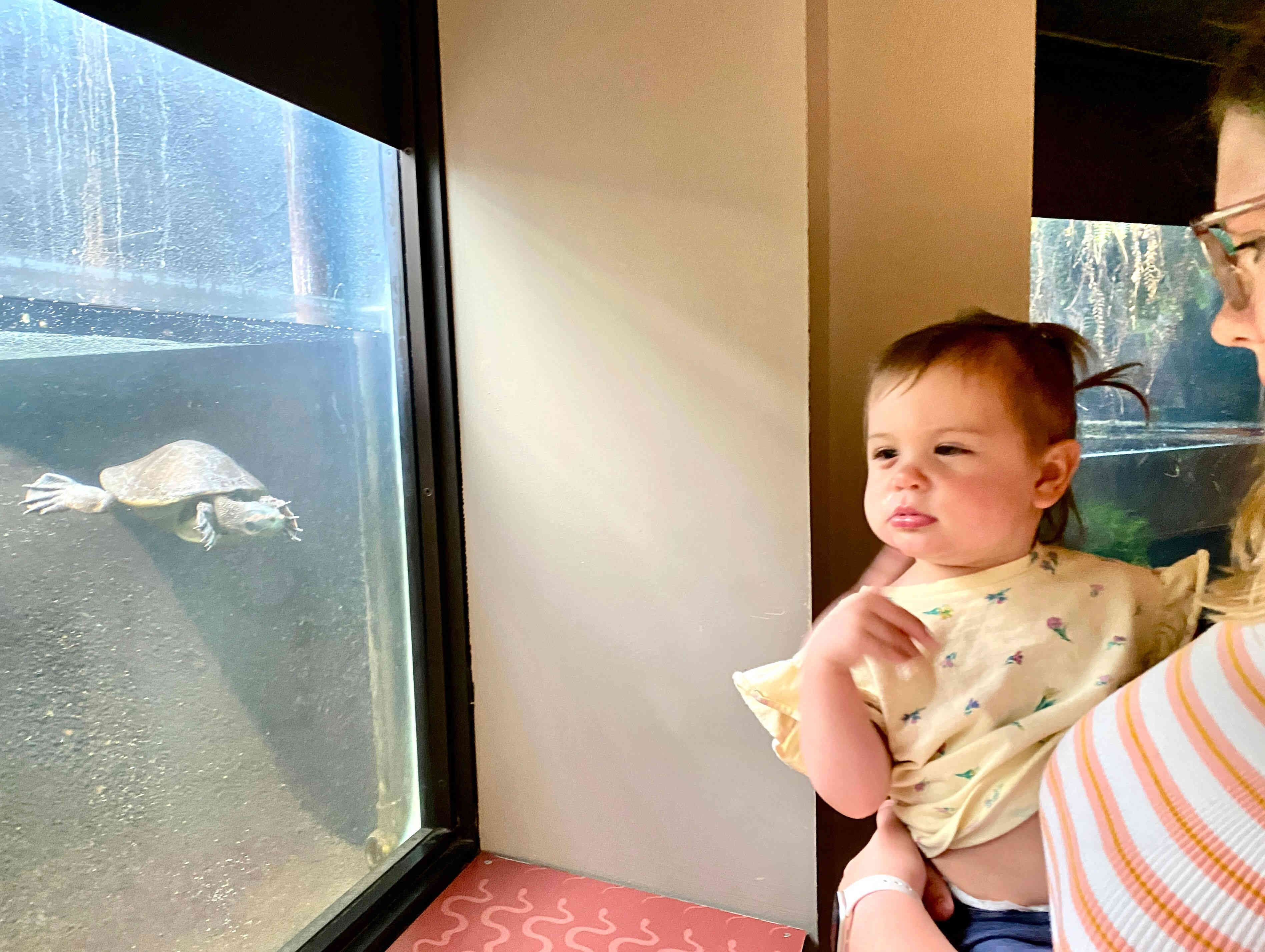 The zoo was a pretty awesome, even though several animal areas were closed for rentovation. Above the girls are admiring a pink spoonbill sitting atop a huge fish tank.