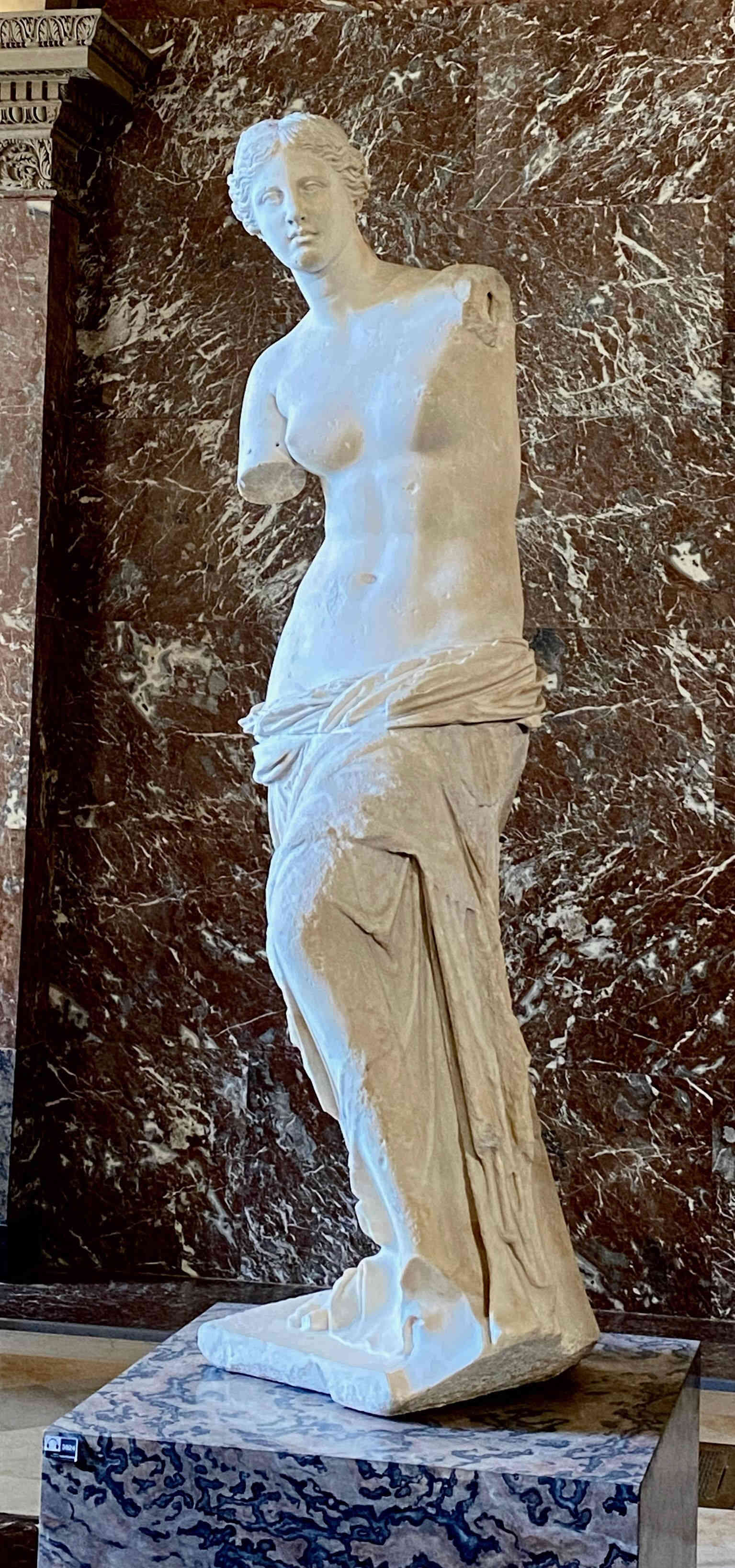 Venous De Milo (Aphrodite of Milos) was discovered on Melos island in 1820. She is the goddess of love and beauty and an icon of female beauty with her curved posture, serene expression, and slipping drape.