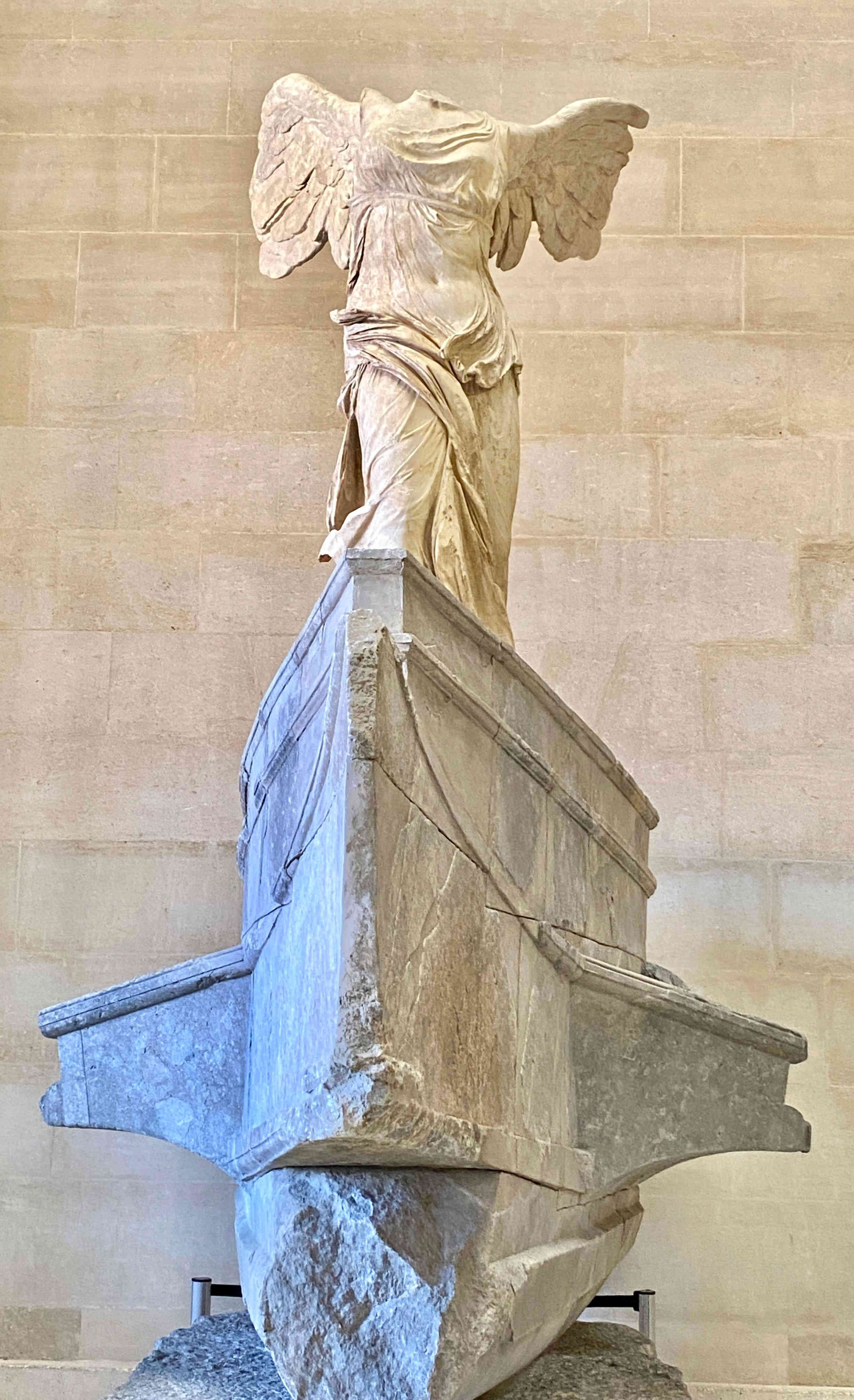 The Winged Victory of Samothrace, is a Greek Hellenistic sculpture showcasing the goddess of Nike or victory. She is made of Parian marble while the base is made from Lartos marble. She was discovered on Samothrace island in 1863 and dates back to 190 BC. Some parts of her wings have been restored using plaster, and her right hand was discovered at a later date (see info below).