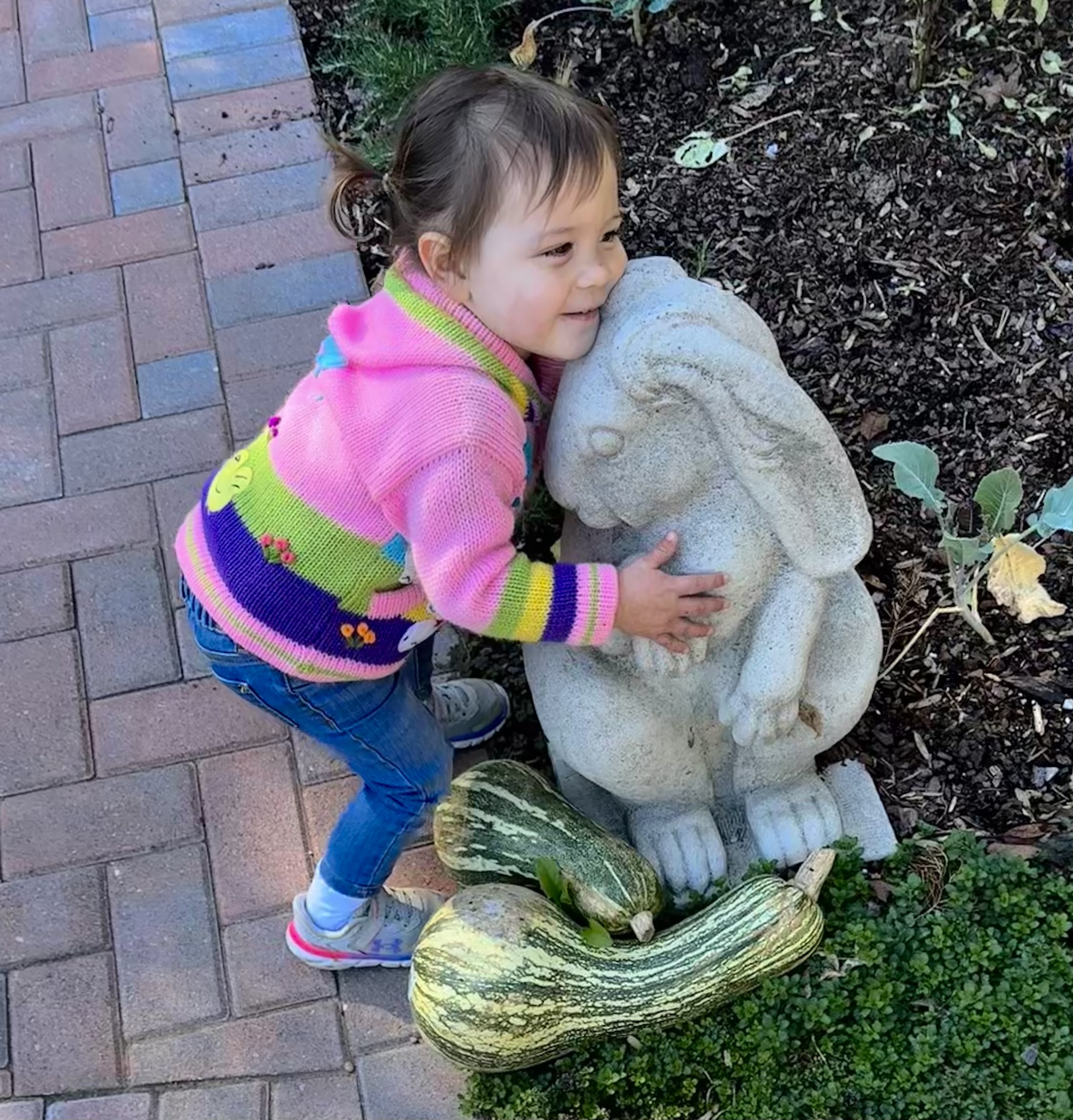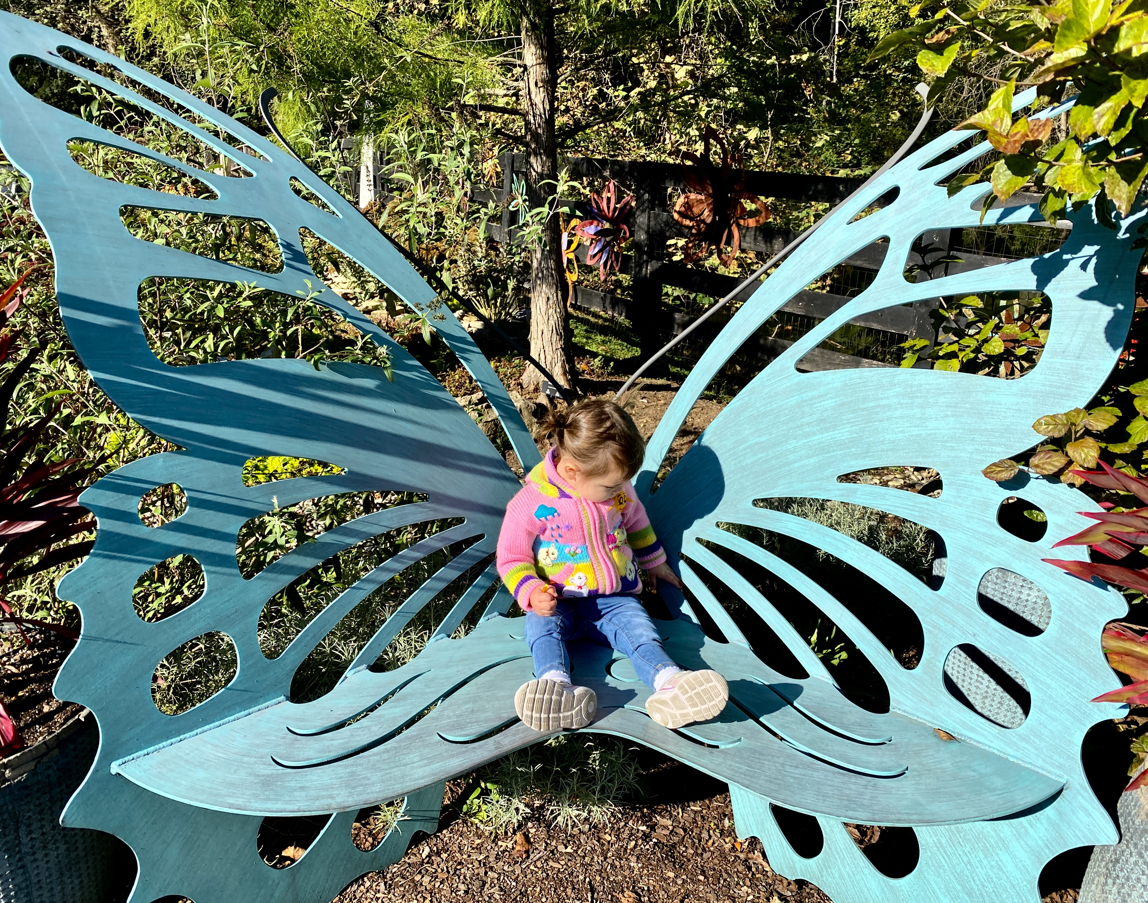 Claire sitting on a cute little butterfly bench.